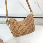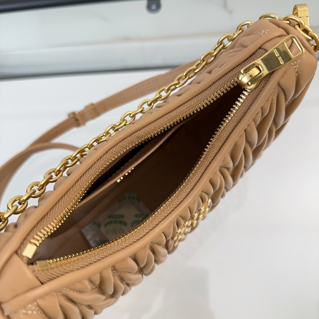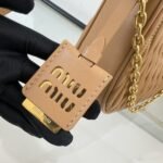5BH211: new miumiu pleated chain bag! This new soft sheepskin shoulder bag picks up the exquisite Matelassé craftsmanship for a beautifully three-dimensional effect. The engraved logo is echoed in the different metal finishes of the metal fittings, emphasizing the iconic and recognizable style of the brand. Functionality and aesthetics are complemented by a detachable chain and leather shoulder strap, a Matelassé pattern, a detachable chain handle, a 105 cm detachable and adjustable leather shoulder strap, and a detachable leather cosmetic mirror case. Zipper closure, cotton satin lining! With dust bag! Size: 17 *20 *5cm. 1080089