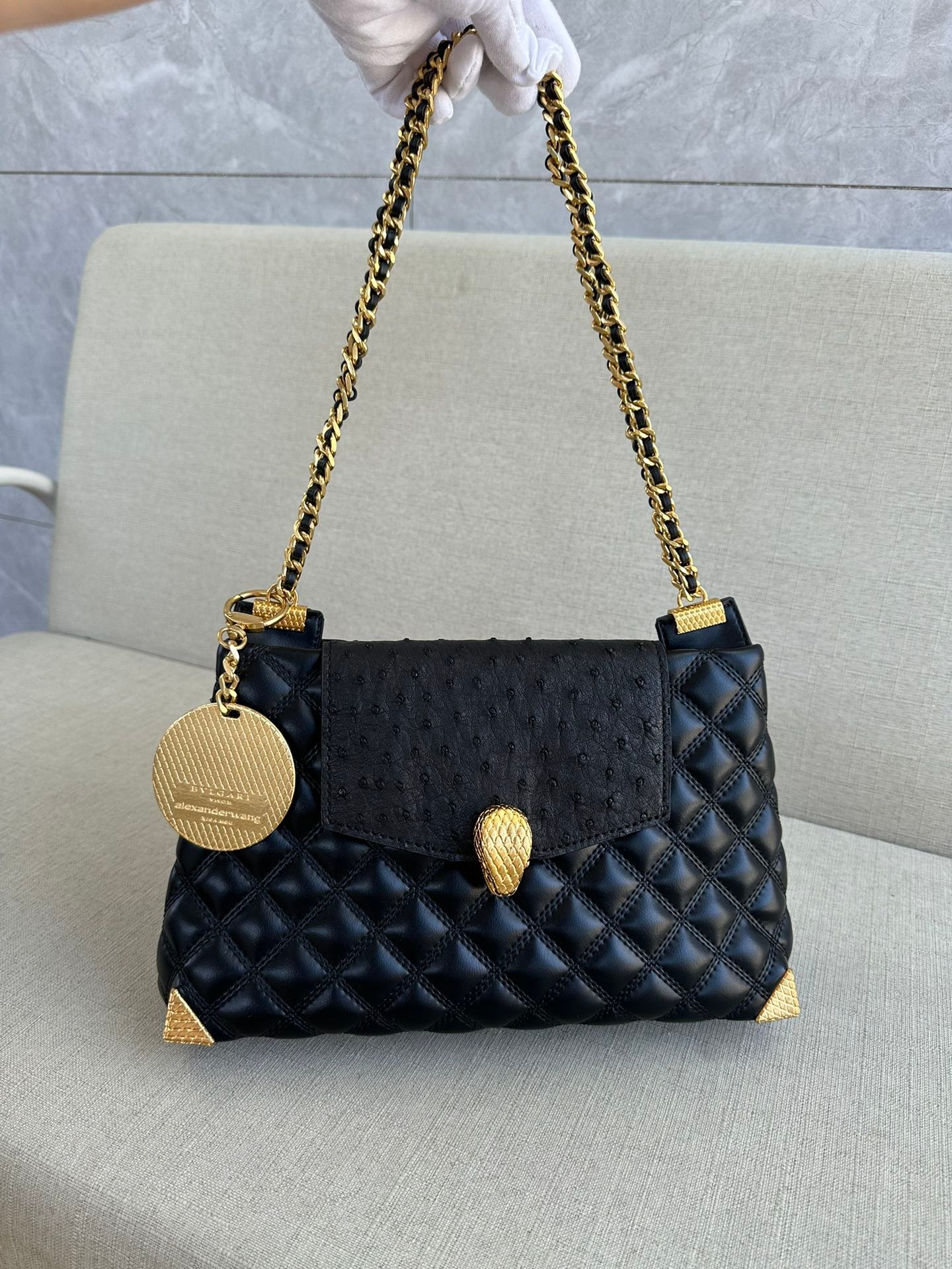 🐭alexanderwang Alexander. A collaboration between King and Bulgari! 100% authentic! ⚠️ 100% fully imported animal skins! ⚠️ The cover is ostrich skin! The leather is soft and comfortable! The newest model, shoulder bag, crossbody bag! Iconic snake head logo! Chain ⛓️ can be single or double! It can be worn shoulder or crossbody! Both sides of the ⚠️ can be made into a front panel and both have bags! Also comes with a beautiful brass mirror 🪞 pendant! The stitch by stitch craftsmanship lets you differentiate between F goods from small workshops! Quality details are perfect! Size: L29*H19*W9