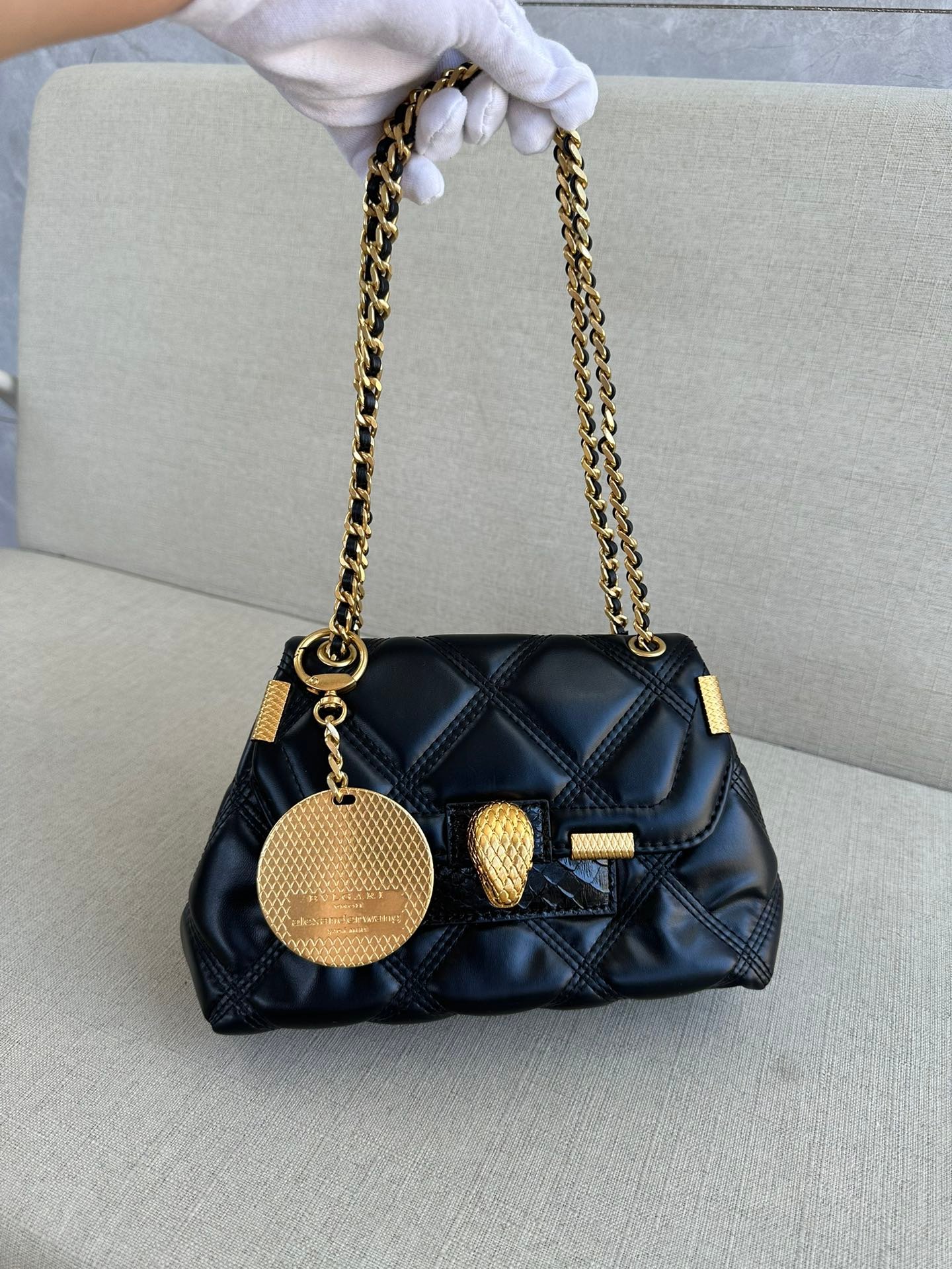 🐭alexanderwang Alexander. A collaboration between King and Bulgari! 100% authentic! ⚠️100% fully imported animal skins! The leather is soft and comfortable! The newest model, shoulder bag, crossbody bag! Iconic snake head logo! Chain ⛓️ can be single or double! Can be single shoulder can be crossbody! Also comes with a beautiful brass mirror 🪞 pendant! The stitch by stitch craftsmanship lets you differentiate between F goods from small workshops! Quality details are perfect! Size: L22*H16*W7
