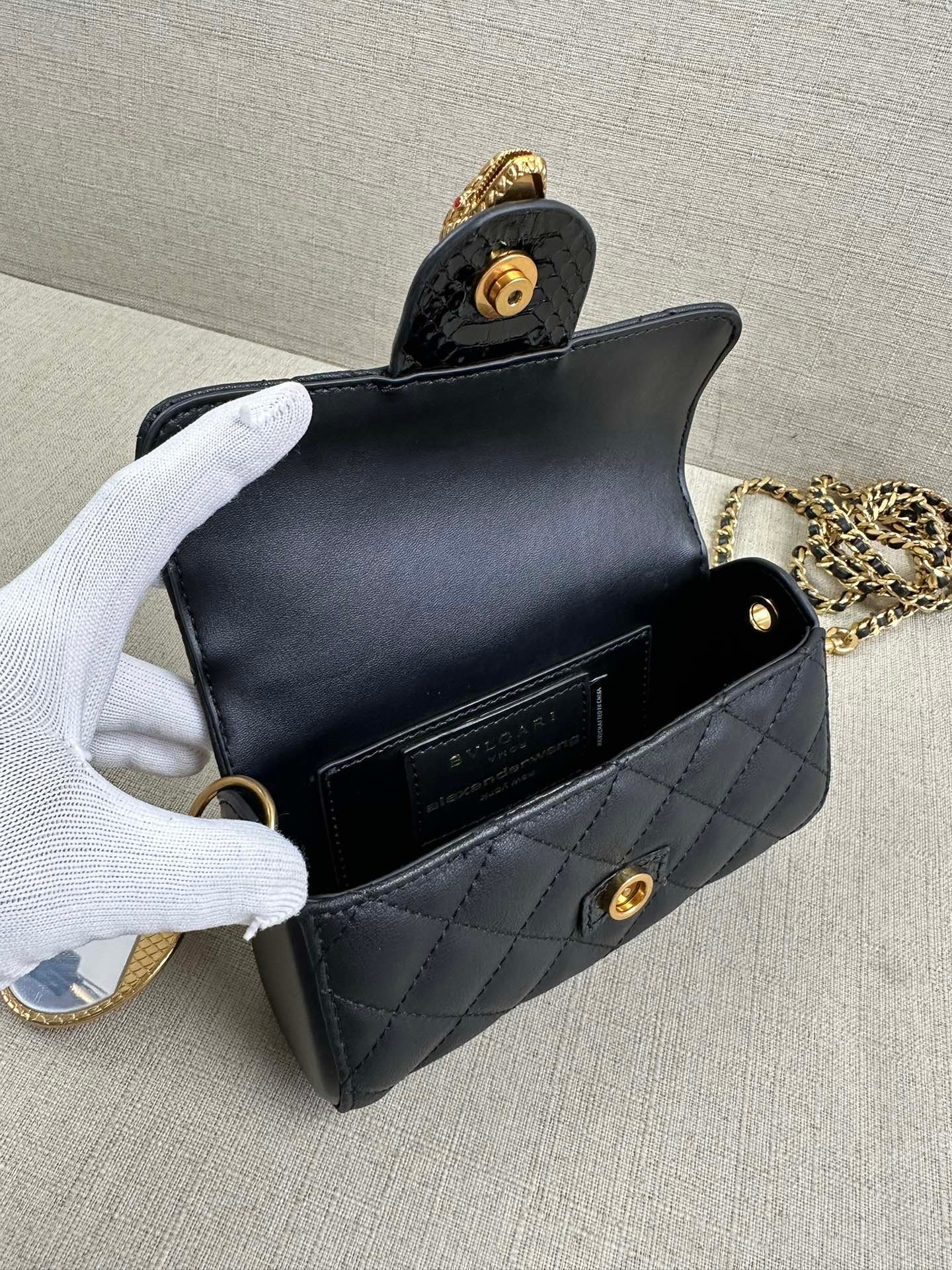 Home BAGS BVLGARI 🐭alexanderwang Alexander. King and Bulgari’s collaboration model! 100% authentic! ⚠️100% fully imported sheepskin! The leather is soft and comfortable! Newest model Clutch bag Shoulder bag Crossbody bag! Iconic snake head logo! ⚠️ chain ⛓️ can be removed as a clutch! Comes with a beautiful brass mirror 🪞 pendant! The stitch by stitch craftsmanship lets you differentiate between F goods from small workshops! Quality details are perfect! Size: L18*H10.5*W6