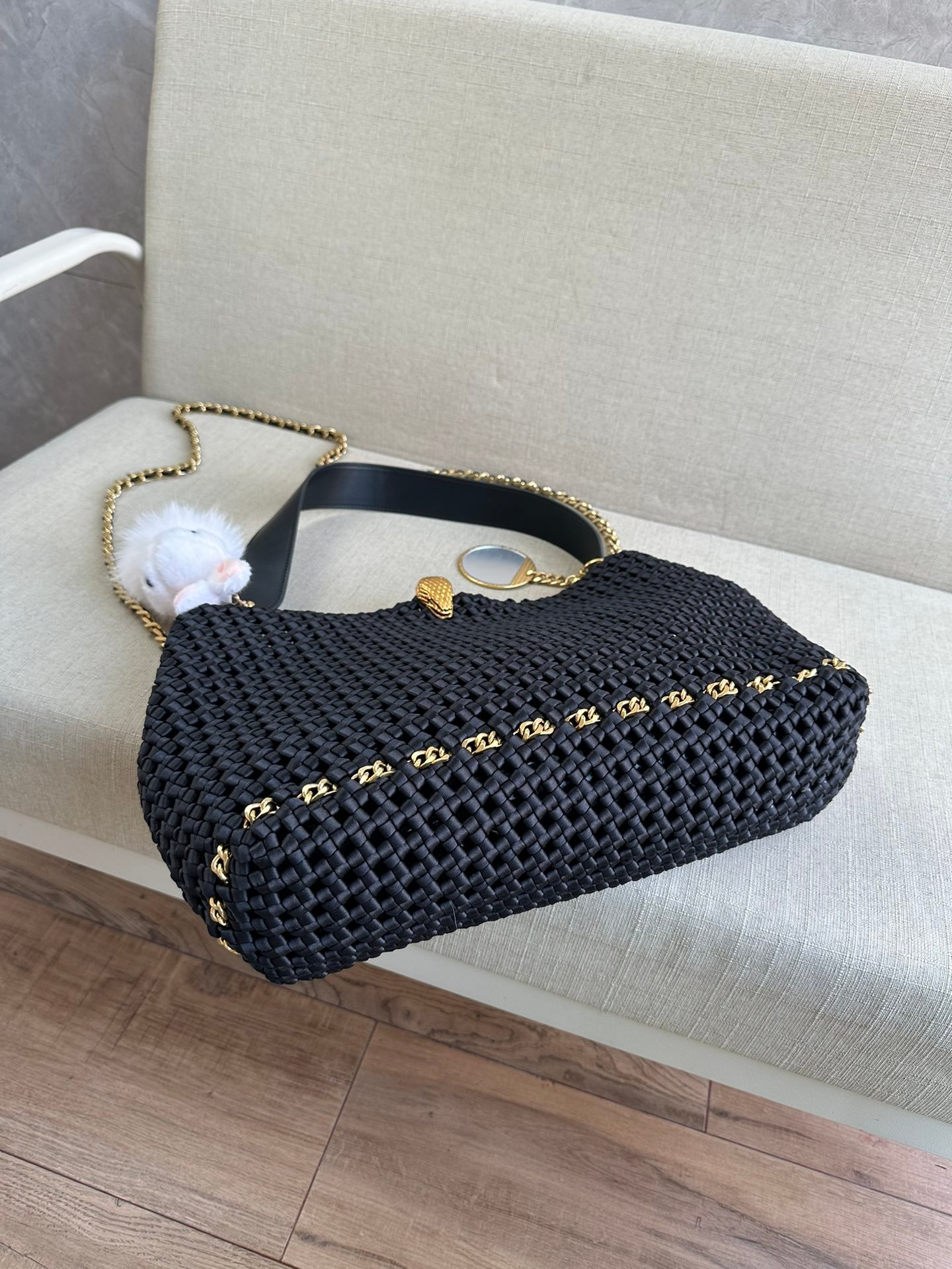 Home BAGS BVLGARI 🐭alexanderwang Alexander. King and Bulgari’s collaboration model! 100% authentic! ⚠️100% fully imported woven fabric! Hollow out design! The newest model handbag shoulder bag! There is a clutch inside that can be taken out and used separately! With a sheepskin wide handles! With a long movable chain! Plus a beautiful rabbit 🐰 charm and a bronze mirror charm! The stitch by stitch craftsmanship lets you differentiate between F goods from small workshops! Quality details are perfect! Size: L38*H25*W11