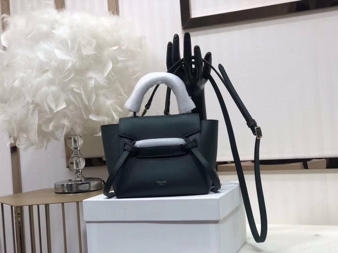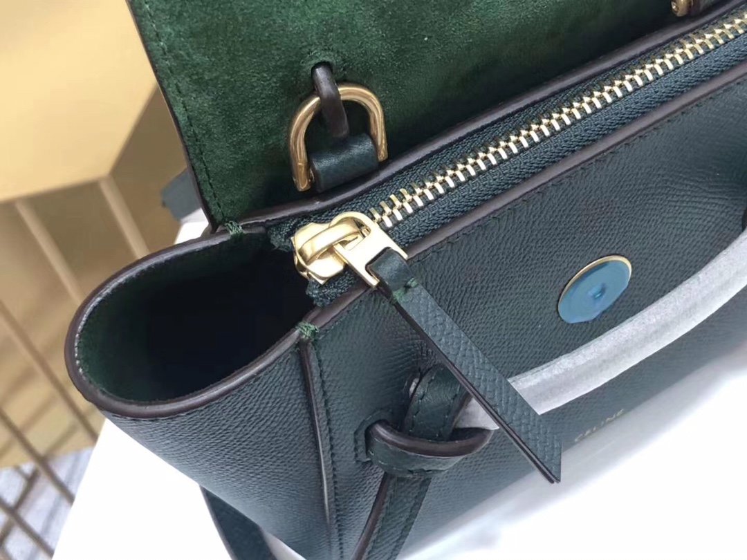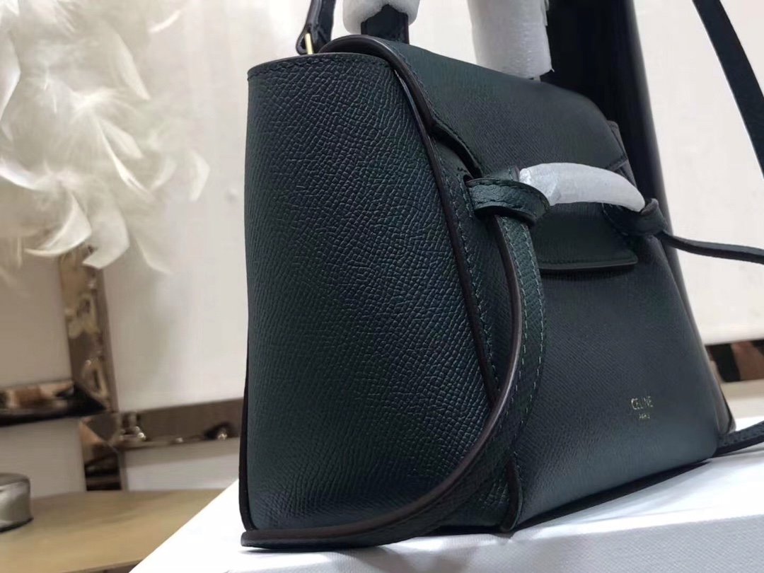 CELINE BELT MINI mini grained calf leather handbag with 1 leather handle, 1 detachable shoulder strap and 1 zipped pocket on the outside back. This handbag features two closure options: top flap and zipper. nSize 11 X 9 X 7 inches (28 X 23 X 17 cm)n100% Calfskin leathern100% Calfskin leather liningnGolden metal hardwarenShoulder or handheldnMagnetic snap top flap closure and top flap lower zipper closurenInterior double flat pocketsnBack exterior flat pocketnDetachable leather shoulder strap 14 inches (36 cm)nTote handle 4 inches (9 cm)n Protective foot studsn No. 175523 P1050