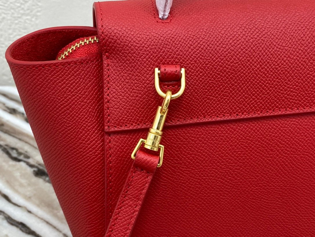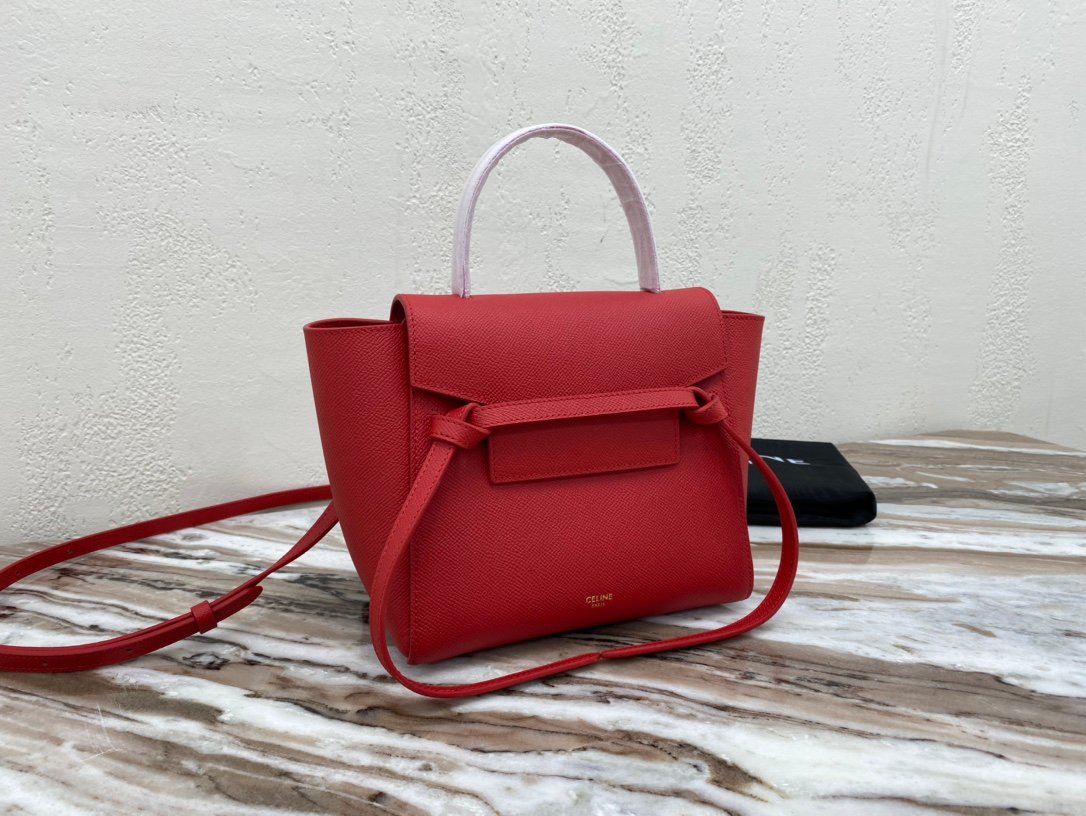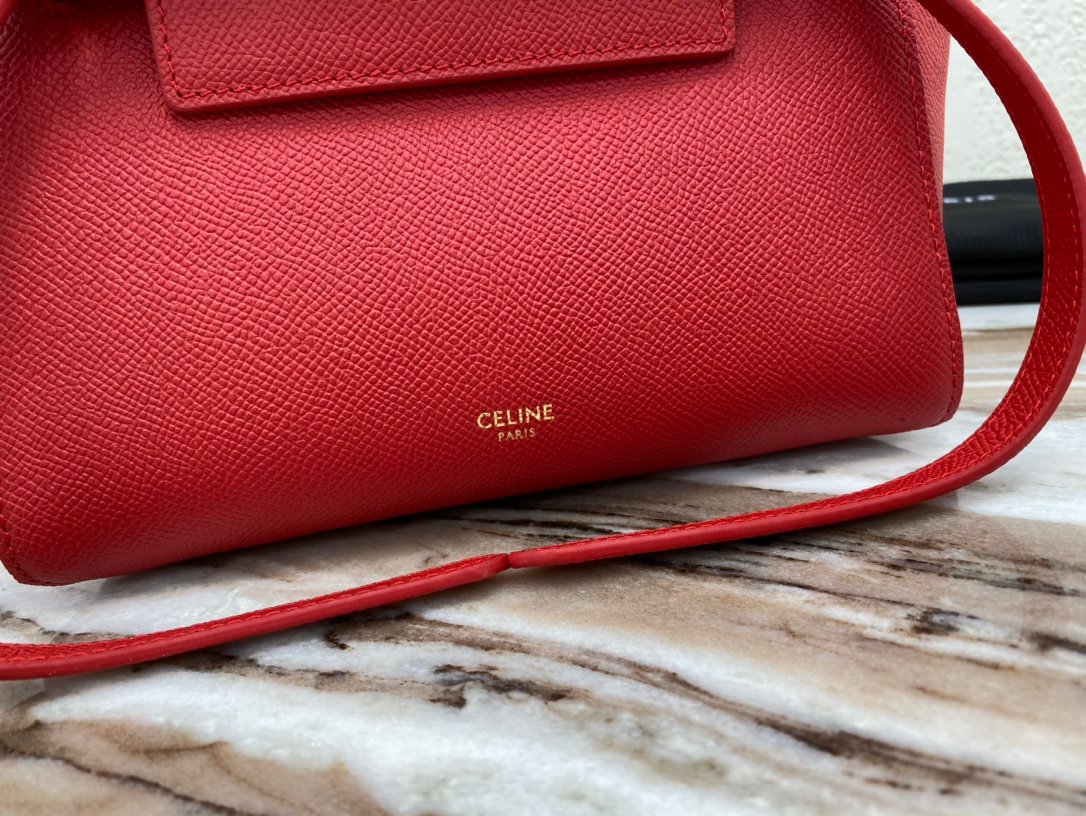 CELINE BELT MINI mini grained calf leather handbag with 1 leather handle, 1 detachable shoulder strap and 1 zipped pocket on the outside back. This handbag features two closure options: top flap and zipper. nSize 11 X 9 X 7 inches (28 X 23 X 17 cm)n100% Calfskin leathern100% Calfskin leather liningnGolden metal hardwarenShoulder or handheldnMagnetic snap top flap closure and top flap lower zipper closurenInterior double flat pocketsnBack exterior flat pocketnDetachable leather shoulder strap 14 inches (36 cm)nTote handle 4 inches (9 cm)n Protective foot studsn No. 175523 p1050
