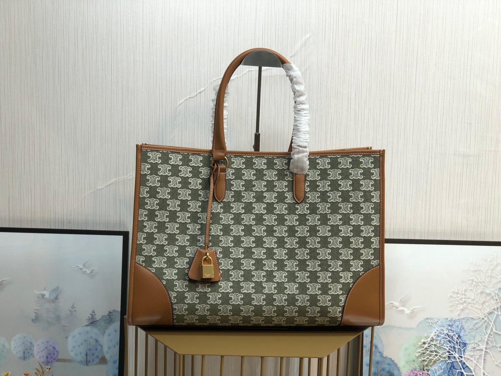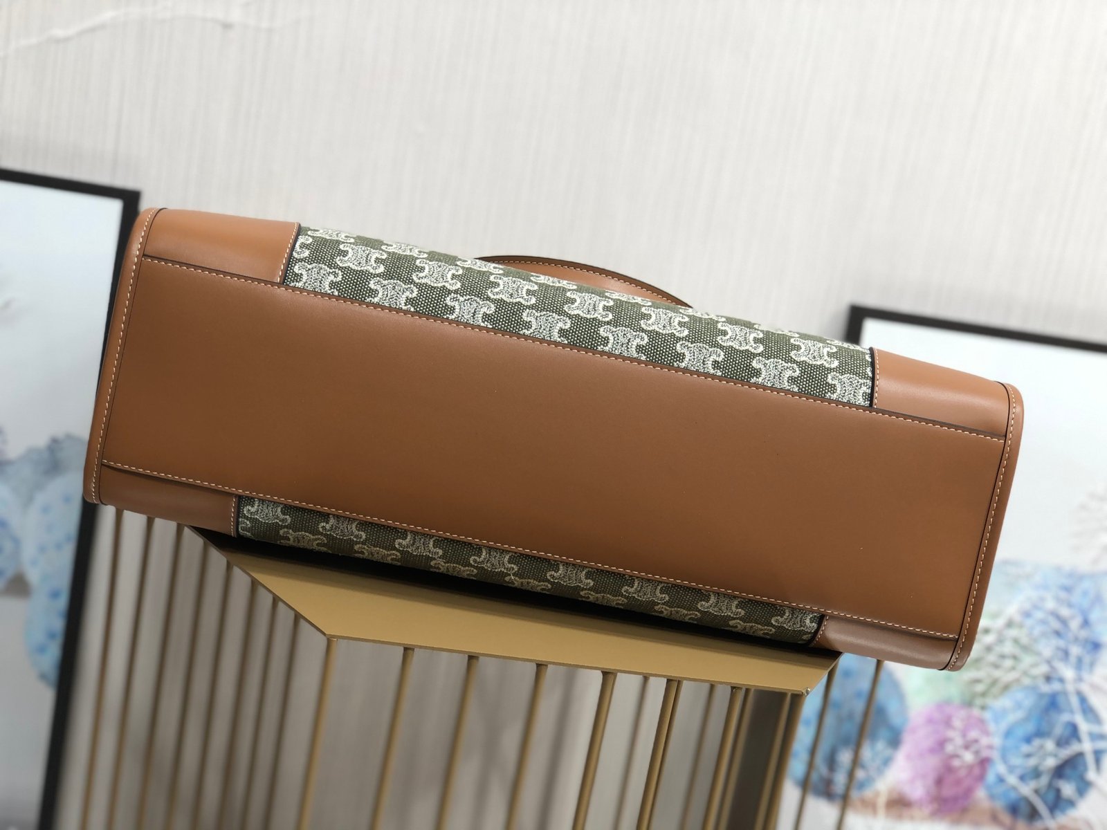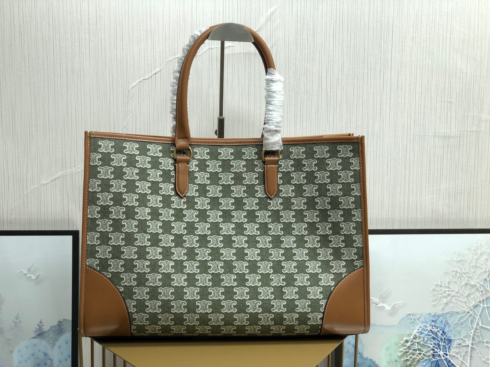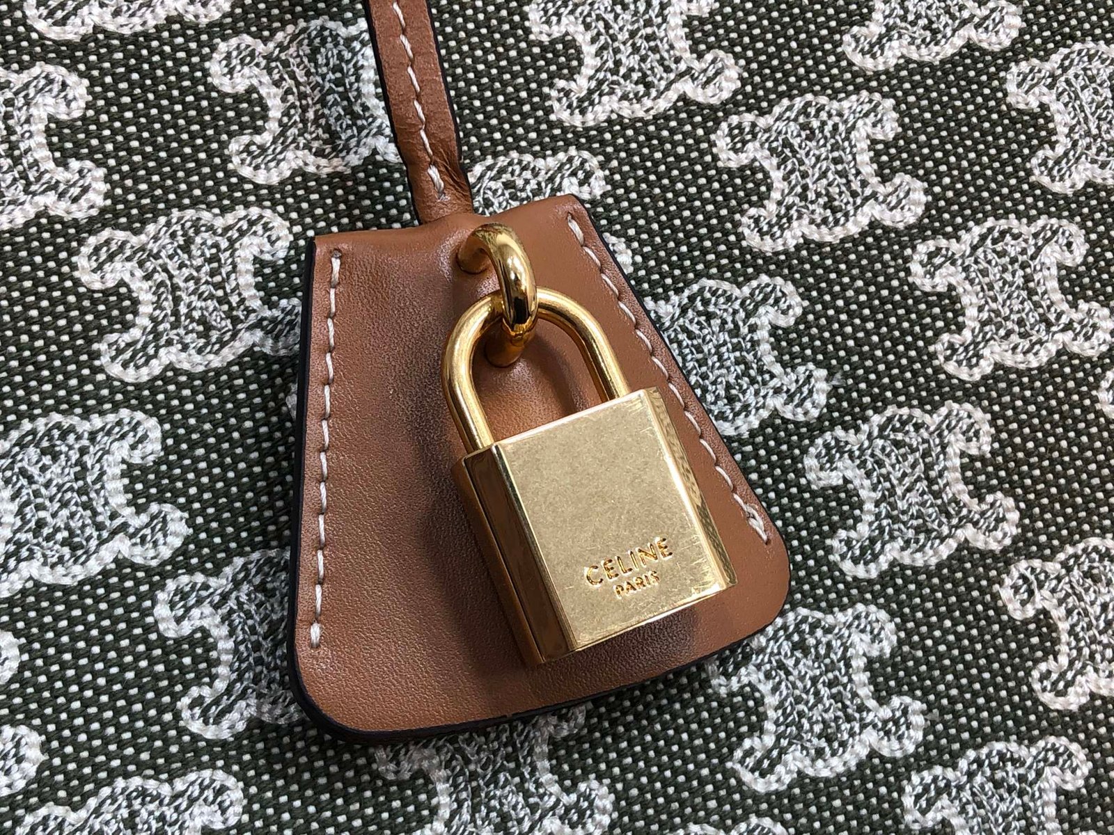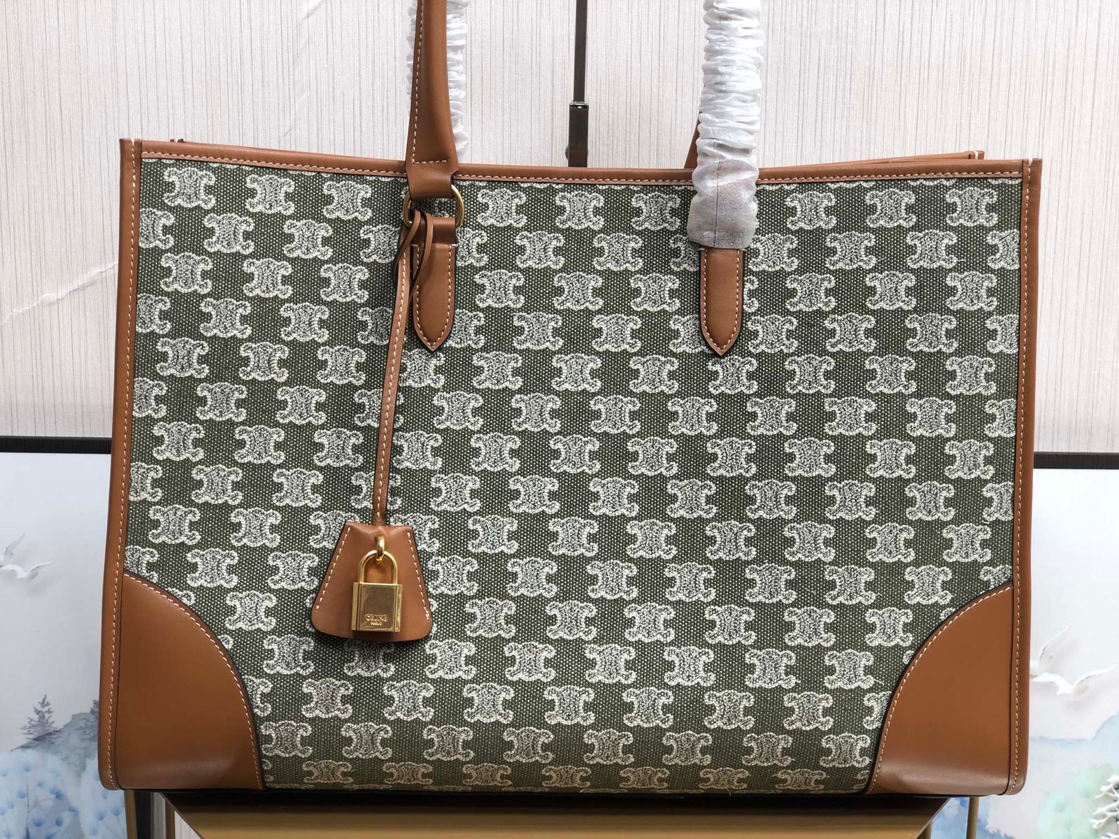CELINE CABAS TRIOMPHE TOTE GREEN EMBROIDERED FABRIC HORIZONTAL HANDBAG Cowboy embroidered fabric, cowhide leather trims, lining : fabric. Shoulder or hand carry, snap button closure, inside flat and zipper pocket, handle length 17cm Size: 43 X 31 X 15cm No. 194342p880