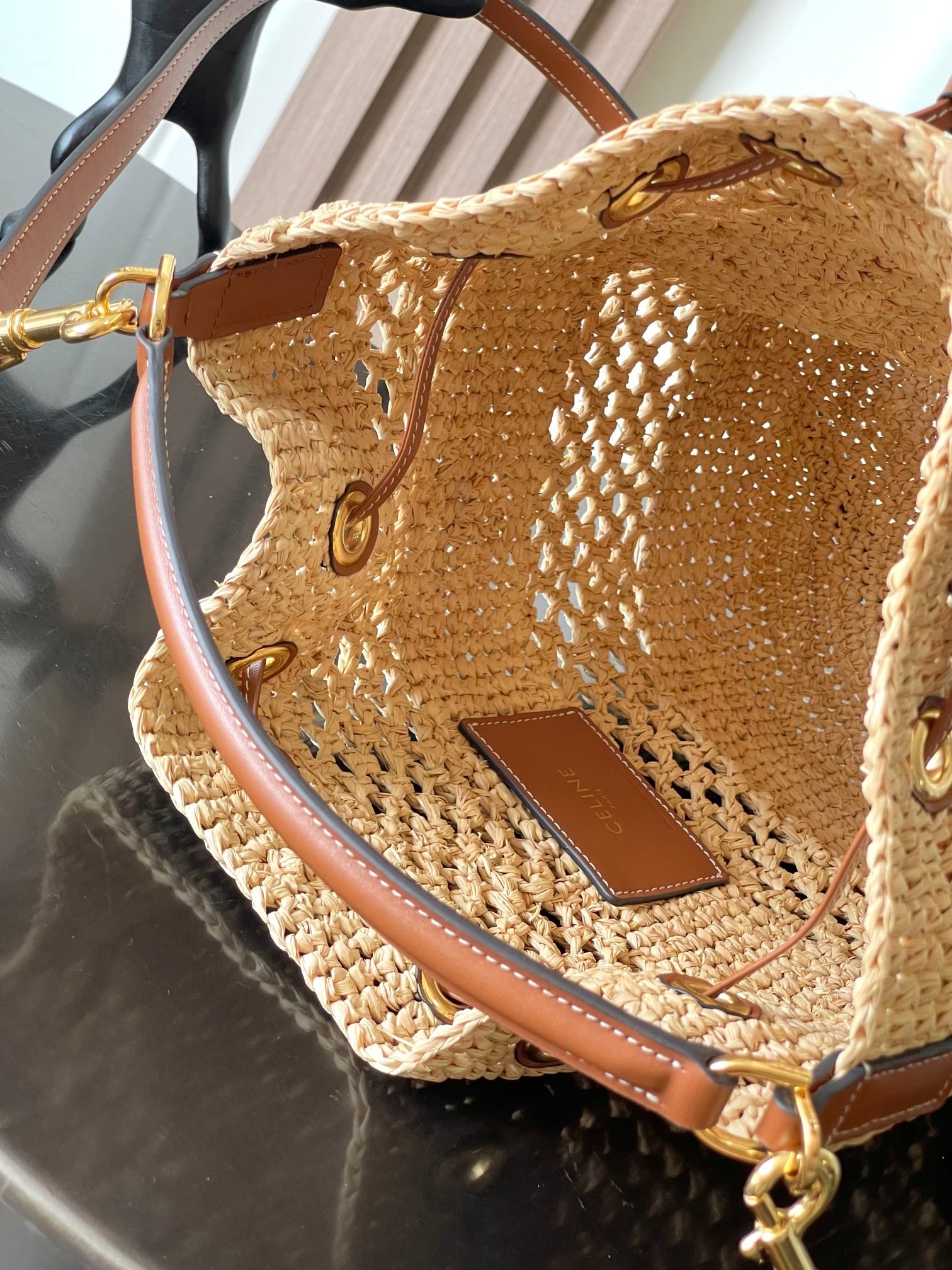 Natural plant materials, cowhide leather edges, unlined, gold finish, handheld, shoulder and crossbody, drawstring leather ties, 1 leather carry handle 9cm long, 1 detachable and adjustable shoulder strap: minimum length 47cm, maximum length 53cm 1680118
