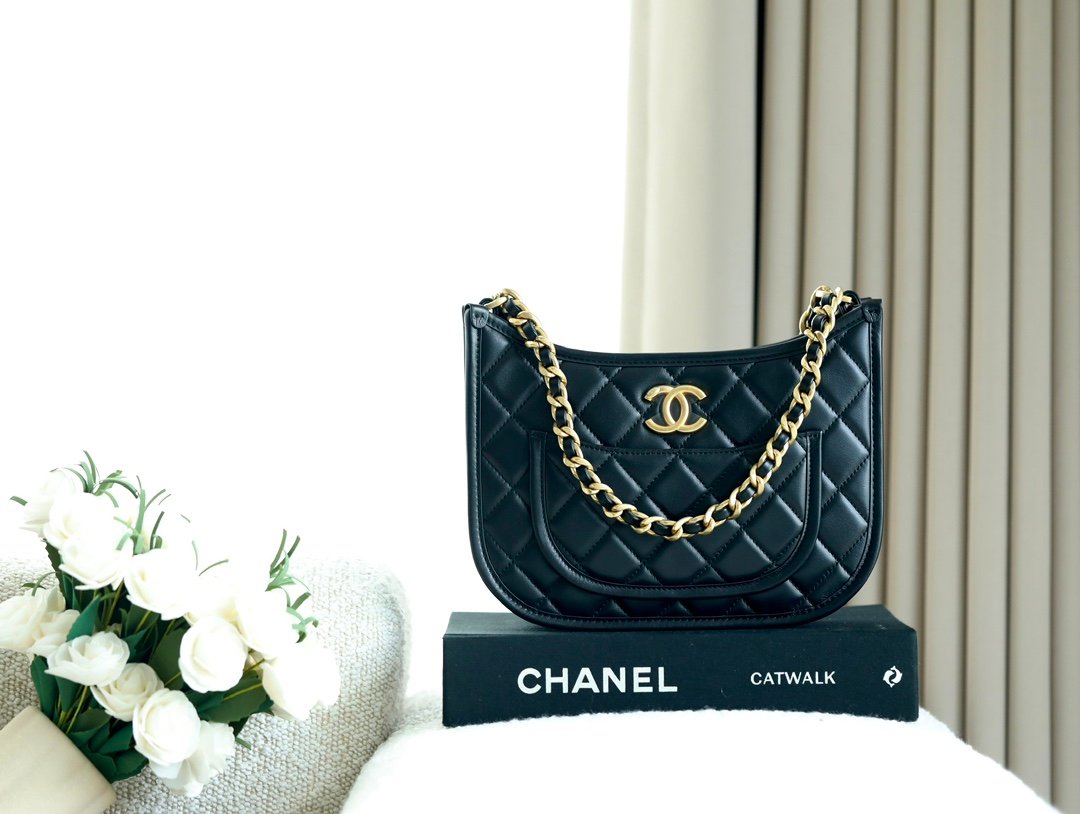 chanel hippie hobo crossbody 💕n2024 brand new dark horse is here n in the simple design with elements of chanel n make this bag is not in the ordinary n the summer free hands of the sharp tool n with the baby is really too convenient nn Hardware: Thick plated 𝟤 𝟦 𝗄 vintage gold n Leather: Original 𝖧𝖺𝖺𝗌 calf leathern Size: 𝟤0*24*6