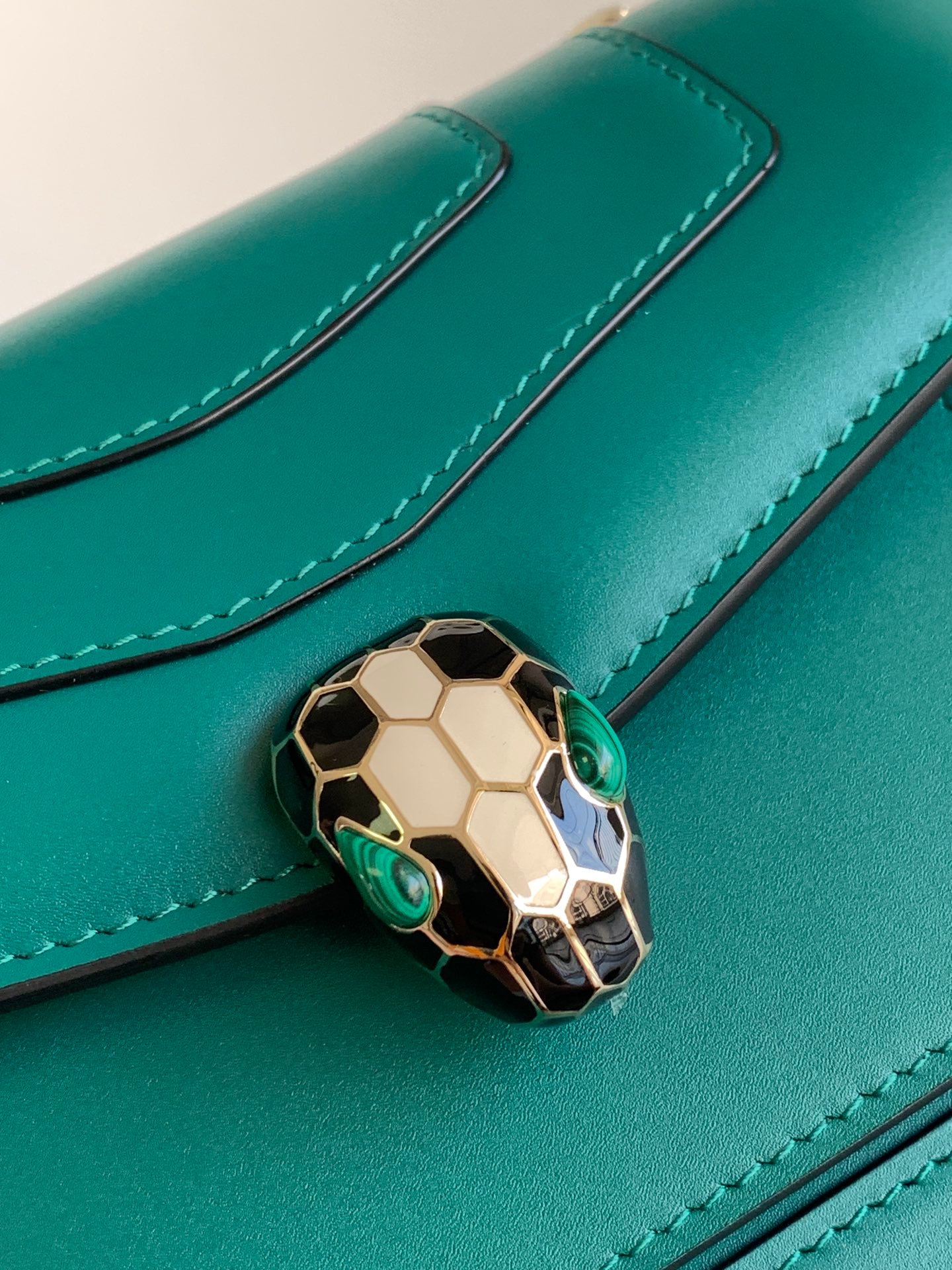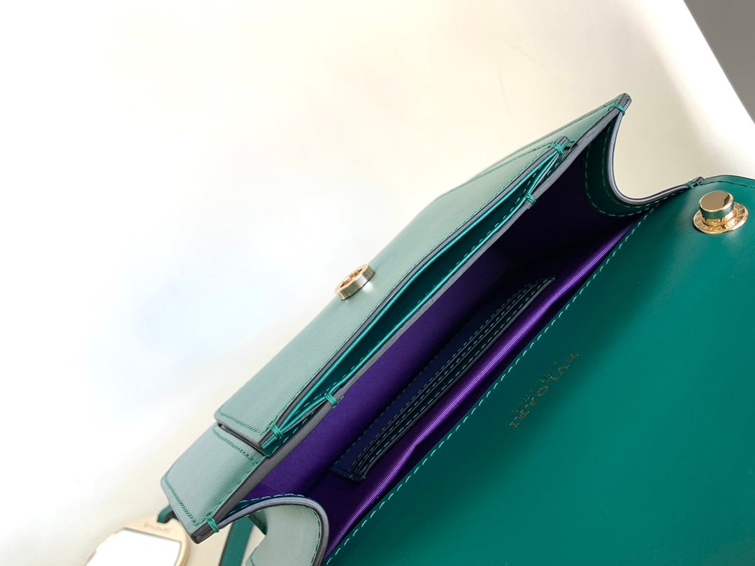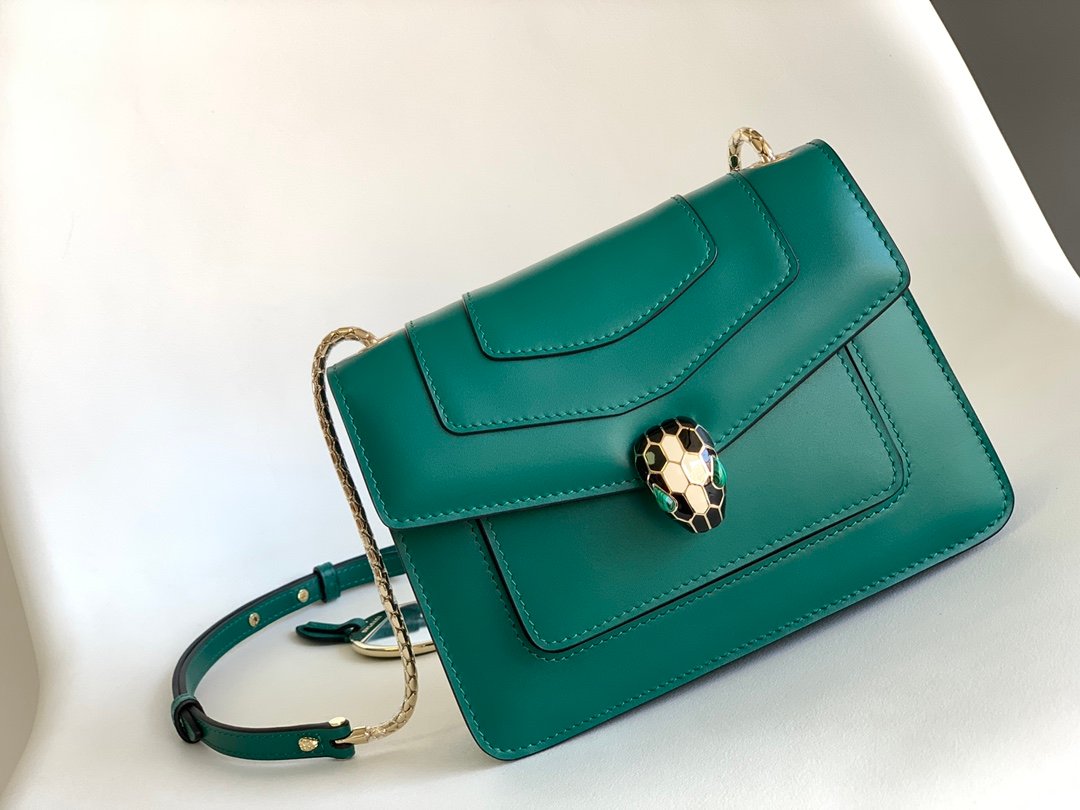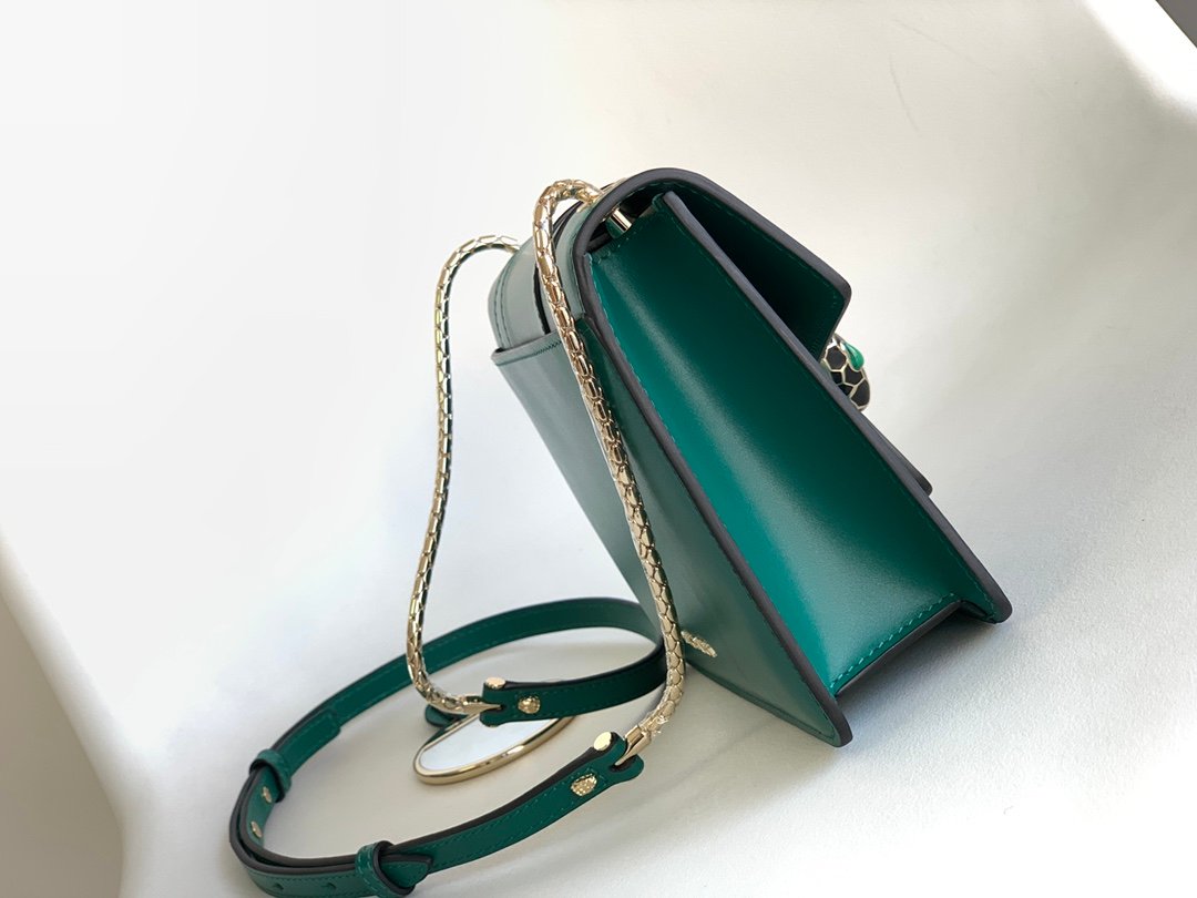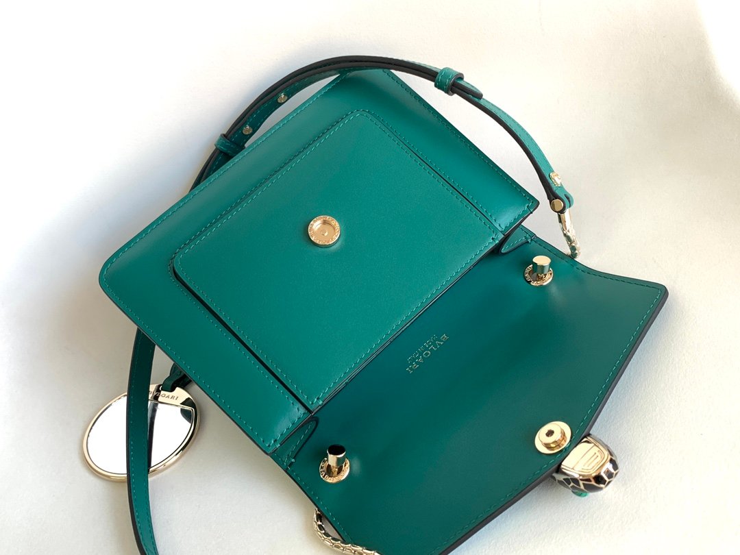 Chip Edition❣️n💚BVLGA**✨SERPENTIFOREVER COLLECTION n🔸The bag is crafted from classic emerald Italian calfskin leather n🔹With light gold all-brass accessories n Black and white enamel embellished with green malachite sensual eyes 👀 nEmbellished with a classic snake head clasp for a glamorous touchn🔸Featuring a single compartment ➡️ front open pocket ➡️ back patch pocket and interior open pocket and 3 ⃣️ card slotsn🔹Featuring a snake chain with a leather shoulder strap and a personalizable vanity mirror with BULGARI on the reverse side Bvlgari metal n🔸 retains the practical size and classic elements n more compact and exquisite capacity n multiple carrying methods to meet the daily needs 🙌n🔹 with upgraded VIP gift box 🎁nSize:20*14*4.5Cm⚠️ 2914490501