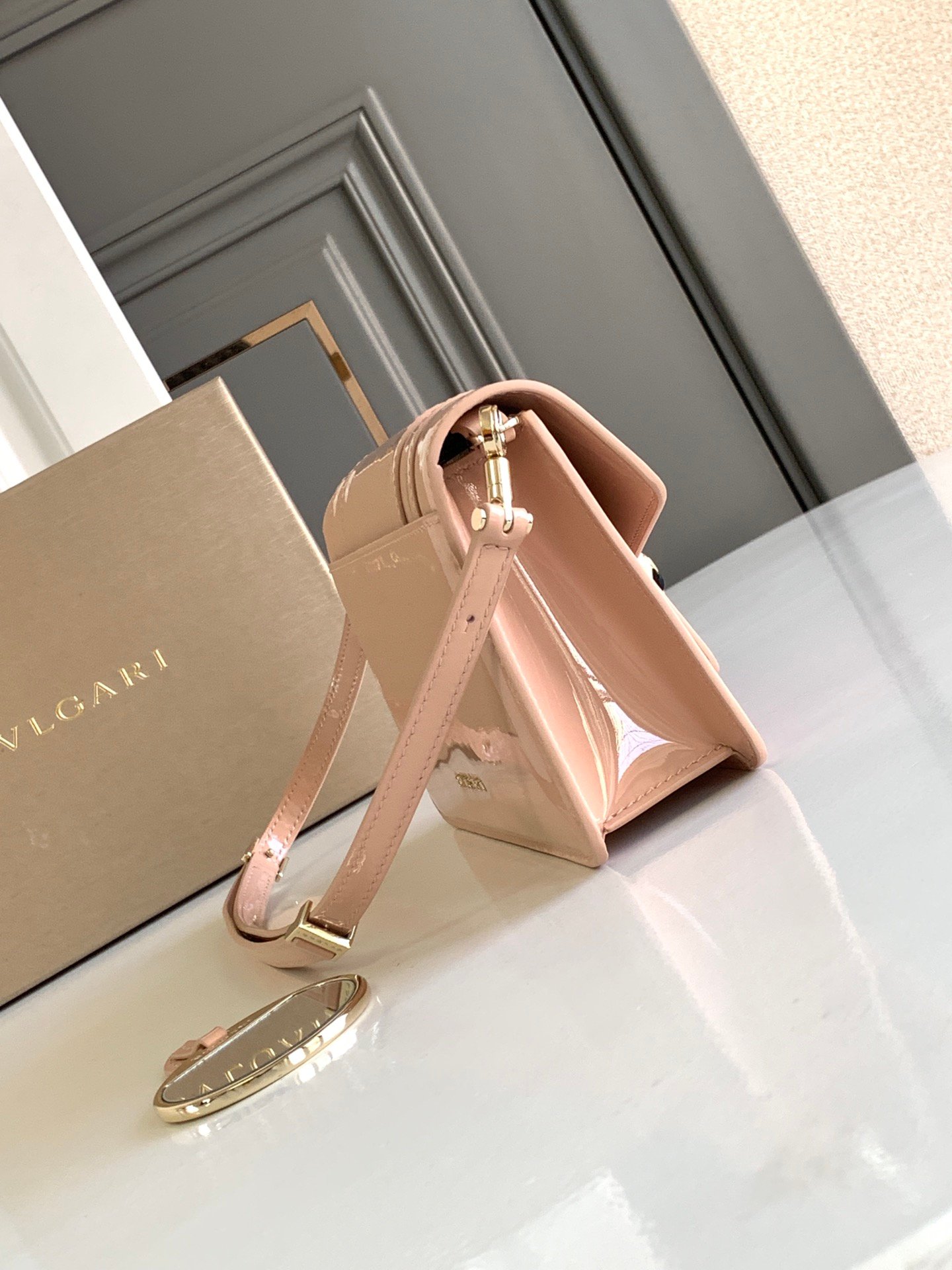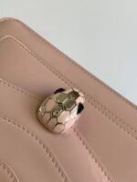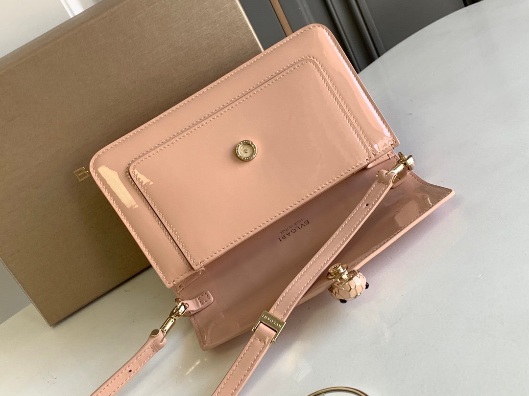 Chip model nBVLGA **🎀 "Serpenti Forever"n🔸 in shell quartz pink glossy brushed calfskin n Quartz pink with gold enamel embellished with black onyx stone sensual eyes 👀 nA glamorous take on the classic 🐍 buckle embellishment n🔺Featuring a single compartment, a mirror pouch with personalized vanity mirror, and BULGARI metal logo on the reverse side nWith an upgraded gift box 🎁nSize:20*14*4.5Cm6 14*4.5Cm618790201n