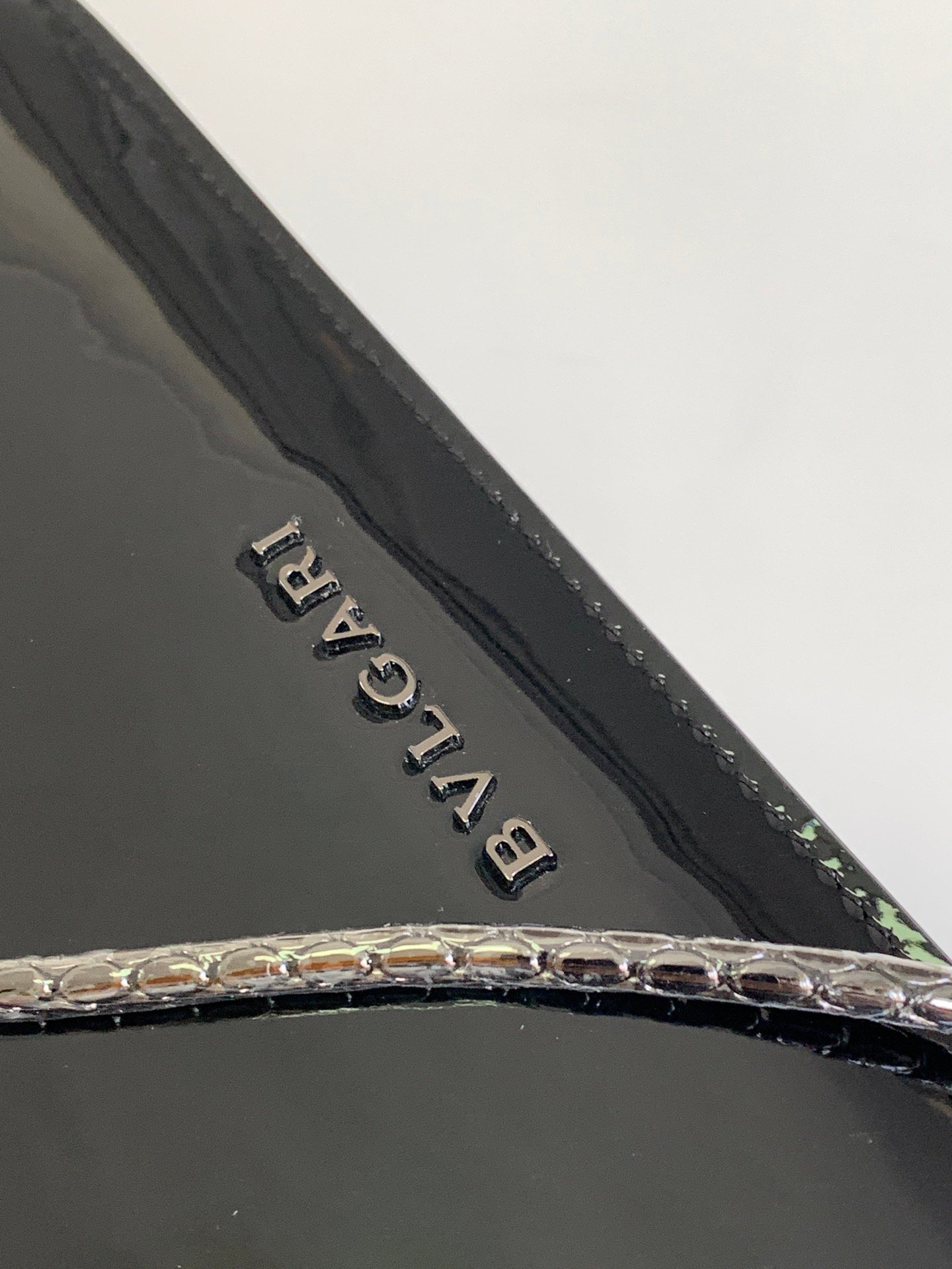 Chip Model nBVLGA **🤍 "Serpenti Forever"n🔹 made of lizard silver textured calf leather n highlighting the metallic texture and exquisite grain n generous and elegant, intellectual, versatile department ✨ n 🔸With light gold plated brass accessories nNewly upgraded Snake Head Enamel Buckle 🐍nBlack gold enamel and black onyx double eyes 👀nSmooth lines with clear visual effect 🌱nAlluring the classic 🐍Buckle embellishment with a glamorous and charming look n 🔺Featuring a single compartment, a mirror pouch with personalized vanity mirror and BULGARI metal logo on the back n with an upgraded gift box 🎁nSize:20*14*4.5Cm618790001n $300.00