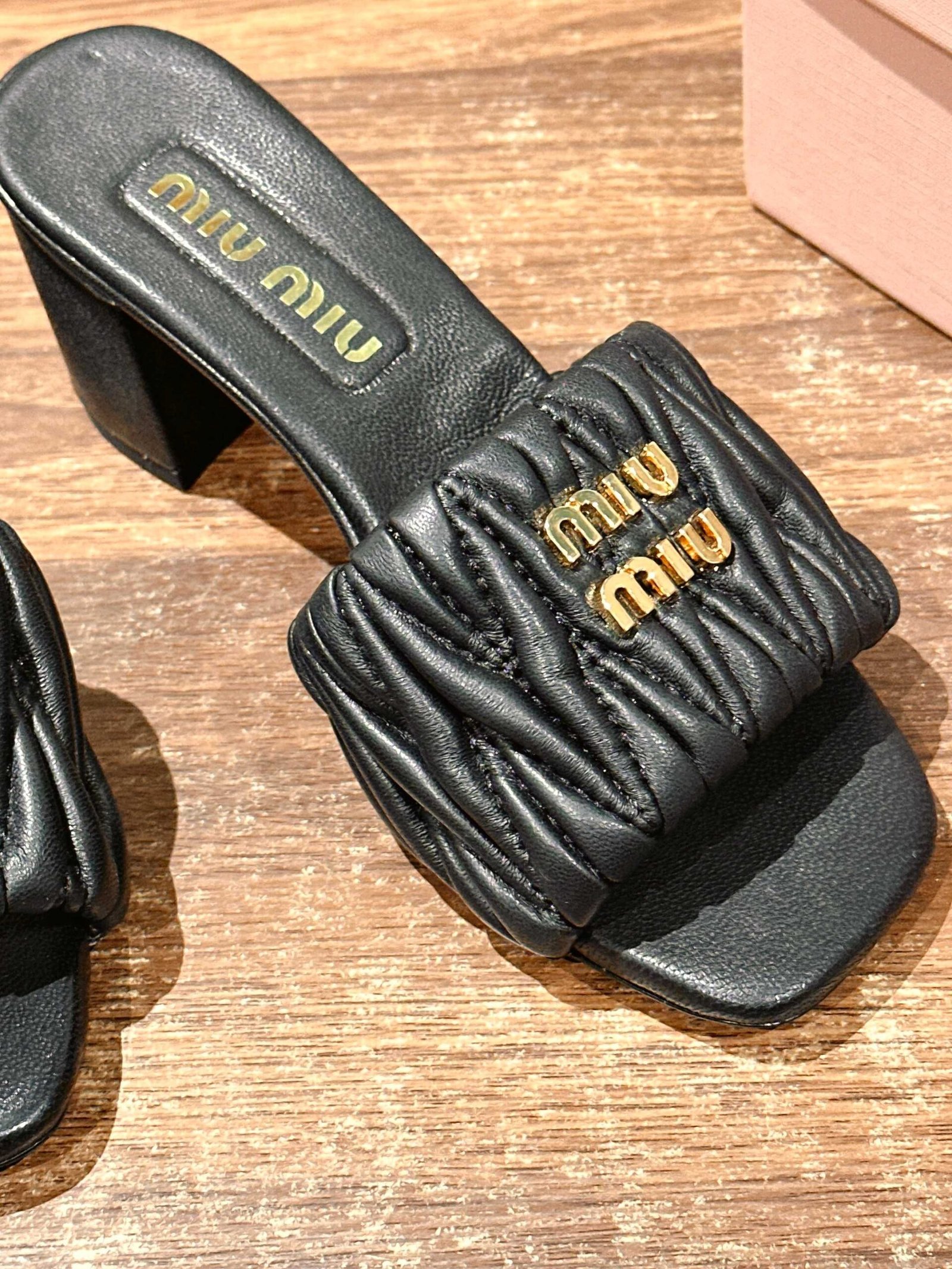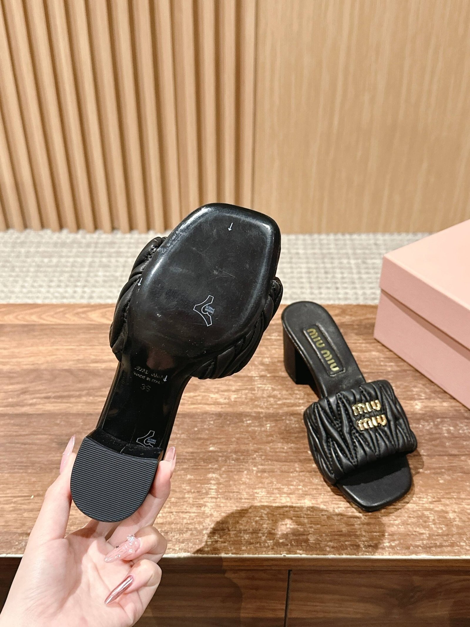 [Chunky Heel] 𝐌𝐢𝐮 𝐌𝐢𝐮# Miu Miu New Pleated Cat Heel Drags n Let you walk can also be beautiful to the heart!!!! The design is very simple and atmospheric, without too much decoration and fancy design, but it comes with an elegant temperament, with a very strong ability to match, whether it is a skirt, pants or jeans, can easily match with different styles, so that you become a fashion icon!!!nnFull sheepskin made of soft and breathable leather sole nSize: 35-39 (40 customized non-returnable)