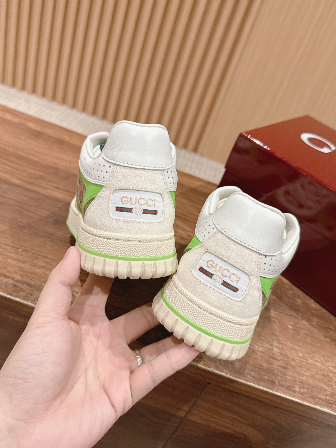 #Couple Size [Fluorescent Green Old Fashioned] 𝐆𝐮𝐜𝐜𝐢 𝐑𝐞-𝐖𝐞 𝐛 As Sabato De Sarno’s first sneaker for Gucci, the Re-Web collection reinterprets the brand’s classic stripes with bold, irreverent detailing against a modern silhouette crafted in white leather, the new sneakers are embellished with a number of the brand’s iconic details and a bright red and green lace-up tongue, making them an instant favorite. The white leather is specially treated to be soft and supple with an embossed grained texture
