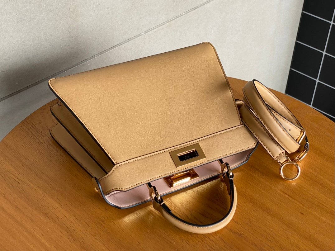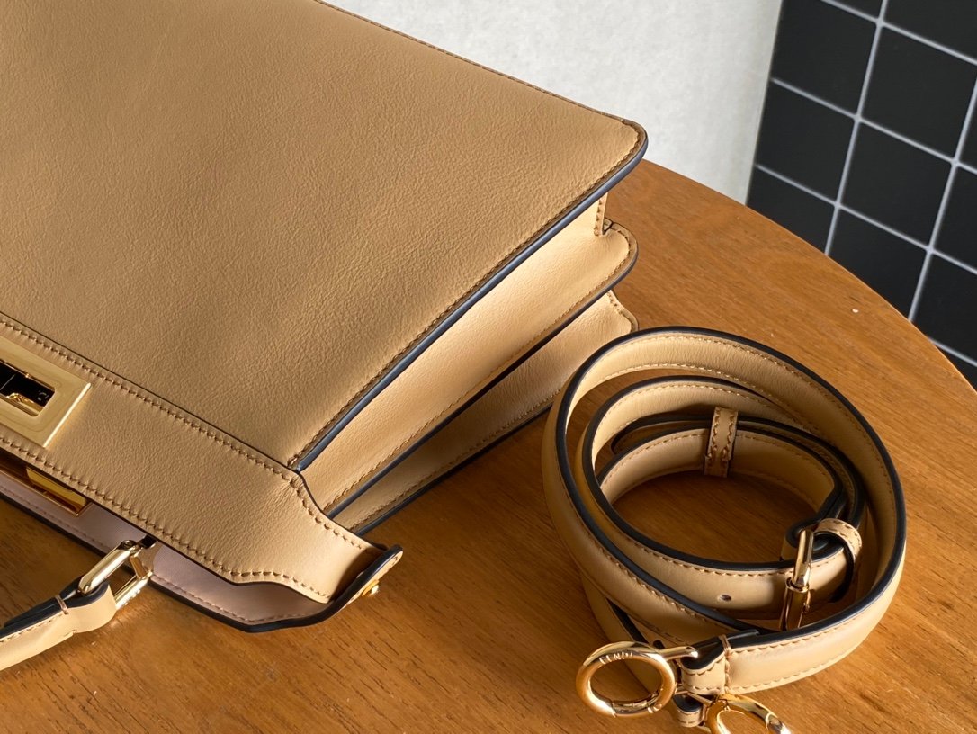 NEW IN COLOR[COLOR]nFEND1PeekabooISeeU medium handbag in calfskin leather, embellished with a classic twist lock on both sides, lined in soft nappa leather, with two compartments separated by a rigid divider, complete with a tie closure internal pocket and gold-tone metal pieces. The handbag comes with handles and an adjustable, detachable shoulder strap that can be added with a tortoiseshell buckle, a sophisticated and durable bagnSize: 27*9.5*21cmnNo. 327n