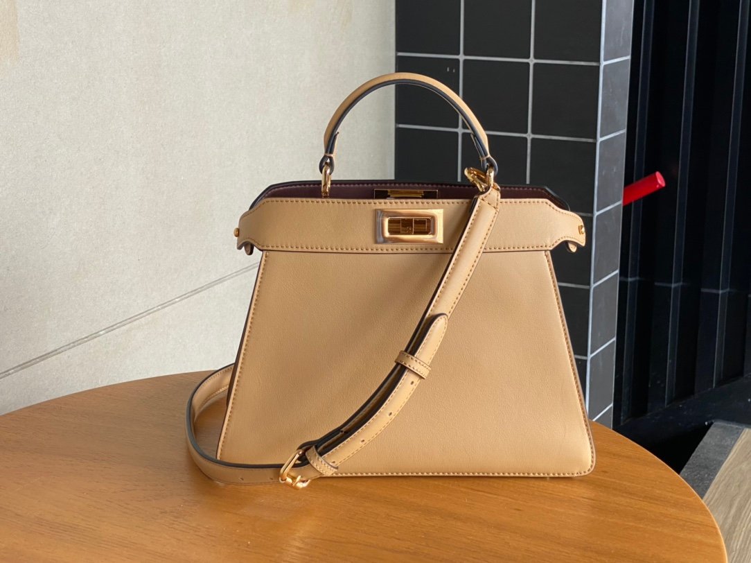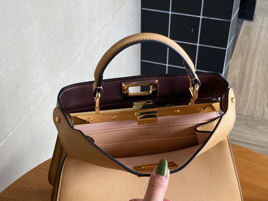 FEND1PeekabooISeeU medium handbag in calf leather, embellished with a classic twist lock on both sides, lined in soft nappa leather, with two compartments separated by a rigid divider, featuring a tie closure internal pocket and gold-tone metal pieces. The handbag comes with handles and an adjustable, detachable shoulder strap that can be added with a tortoiseshell buckle, a sophisticated and durable bagnSize: 27*9.5*21cmnNo. 327n