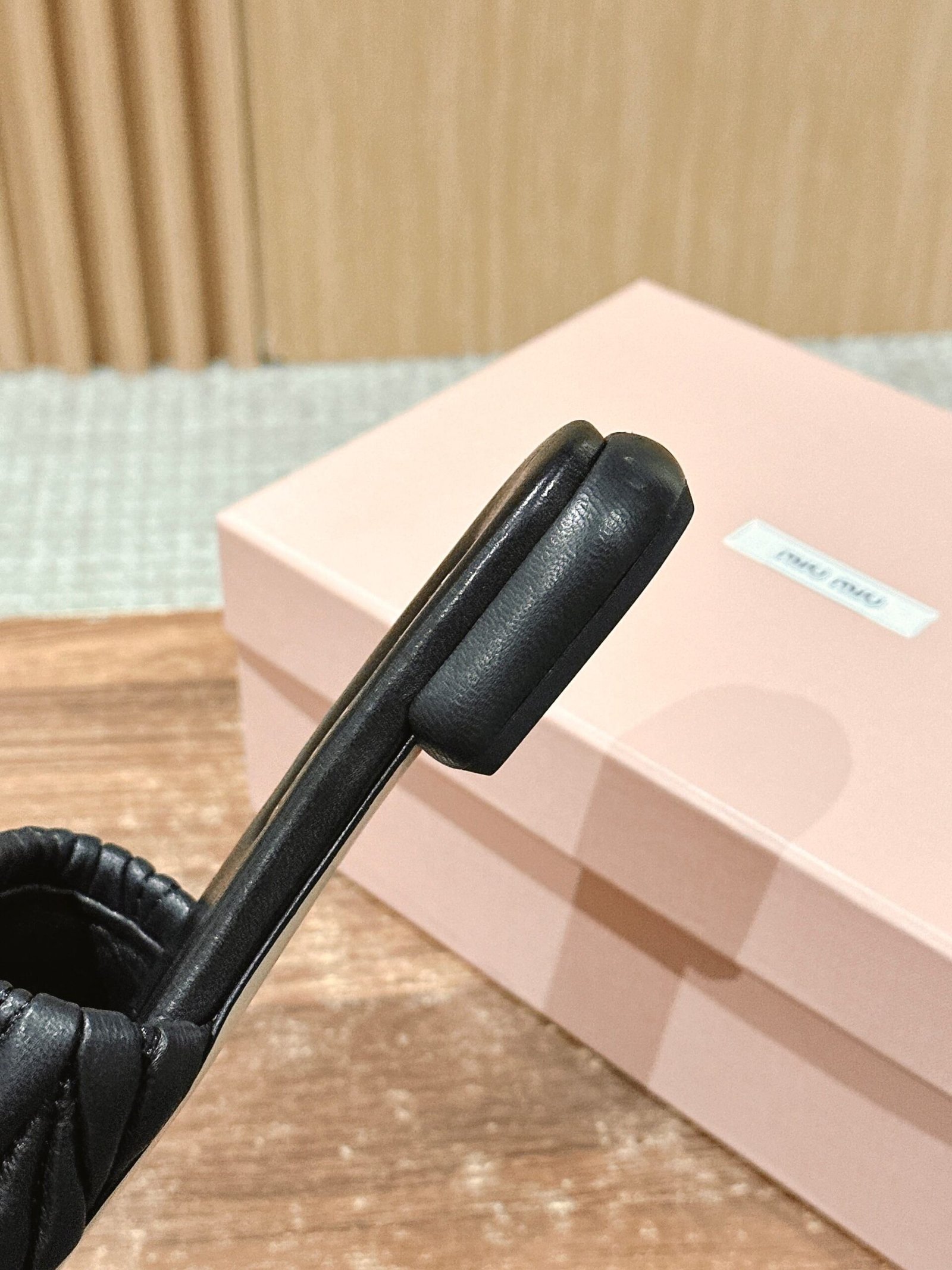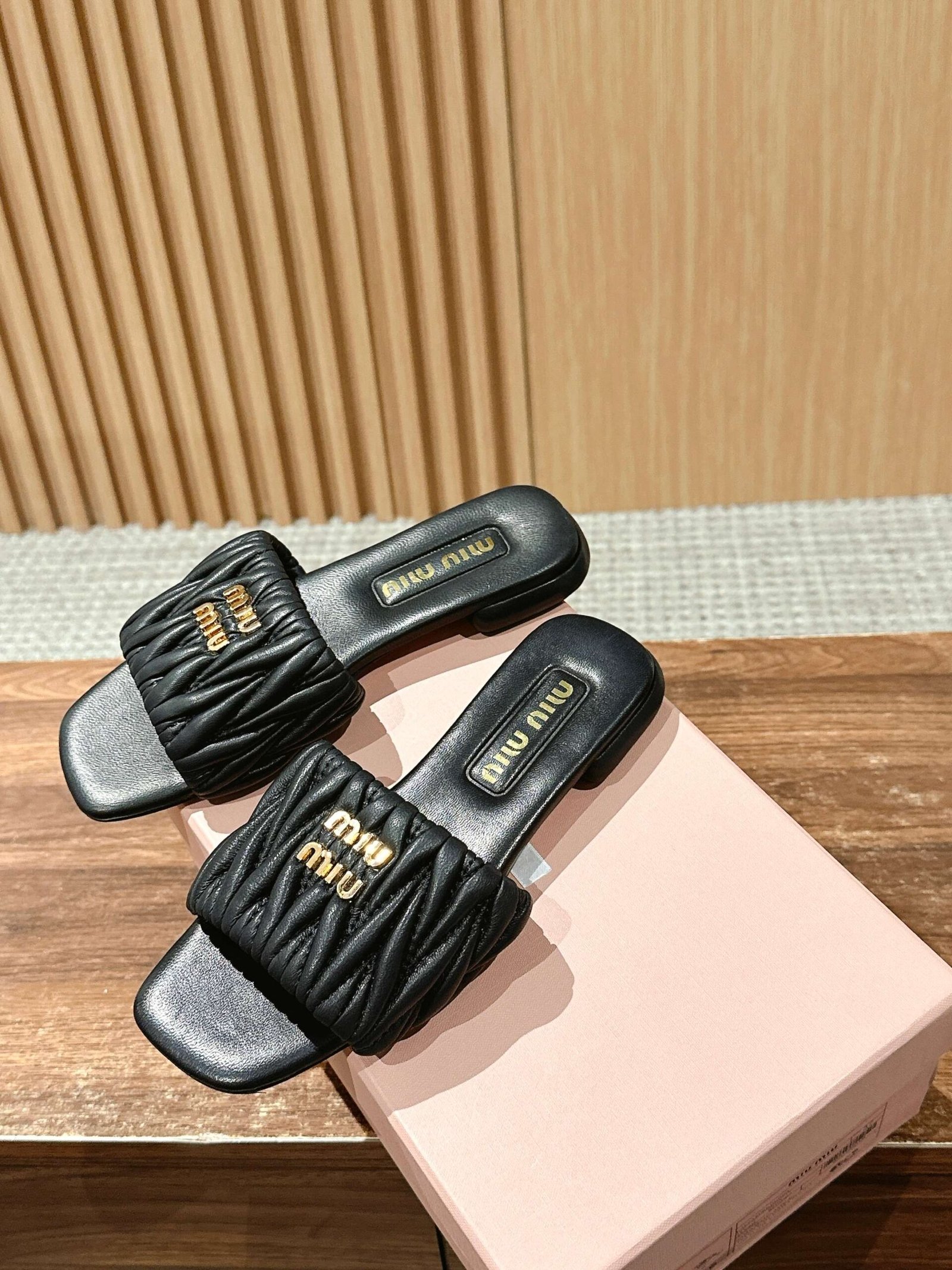 [Flat Heel] 𝐌𝐢𝐮 𝐌𝐢𝐮# Miu Miu New Pleated Cat Heel Drags n Let you walk can also be beautiful to the heart!!!! The design is very simple and atmospheric, without too much decoration and fancy design, but it comes with an elegant temperament, with a very strong ability to match, whether it is a skirt, pants or jeans, can easily match with different styles, so that you become a fashion icon!!!nnFull sheepskin made of soft and breathable leather sole nSize: 35-39 (40 customized non-returnable)