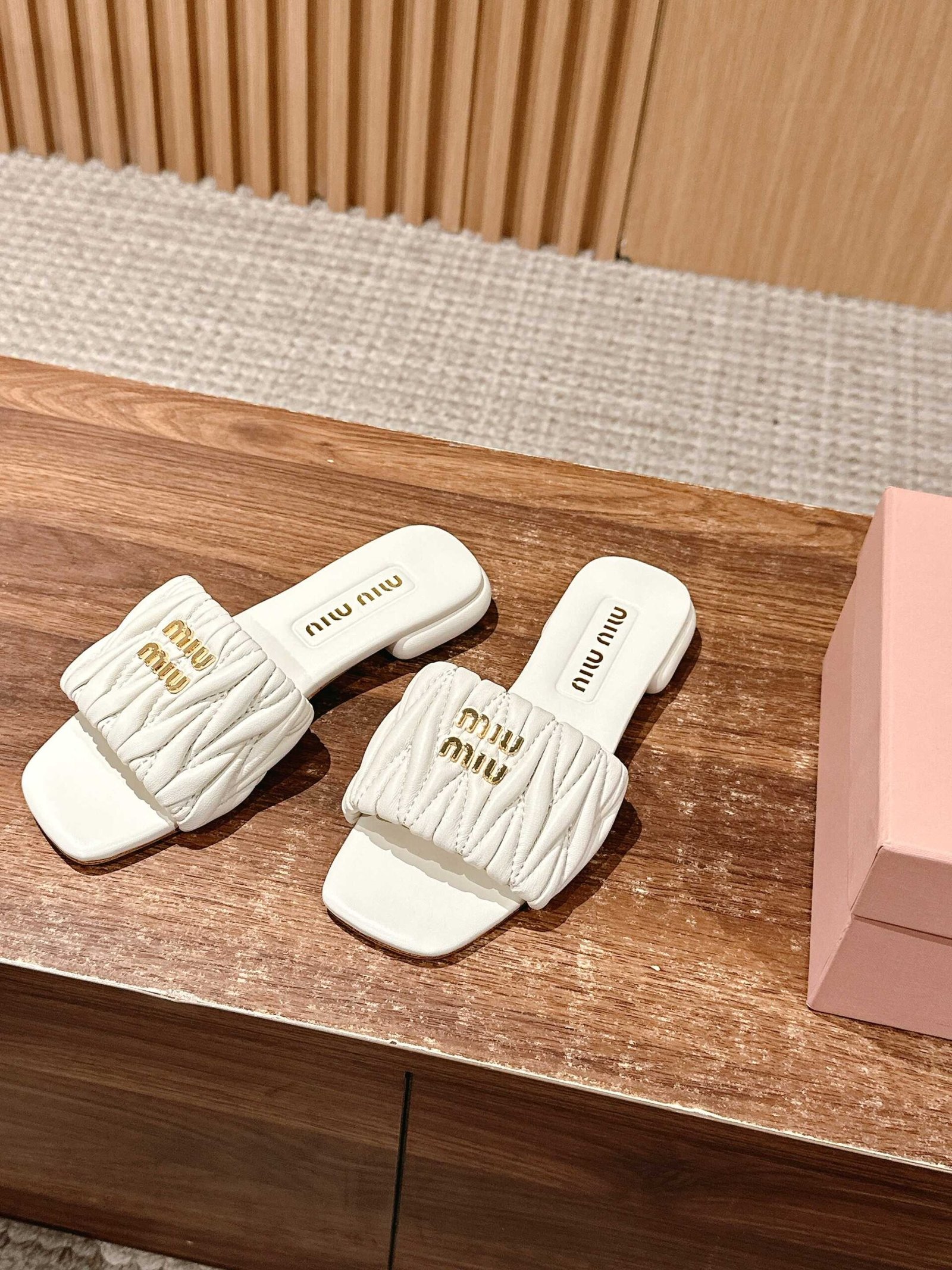 [Flat Heel] 𝐌𝐢𝐮 𝐌𝐢𝐮# Miu Miu New Pleated Cat Heel Drags n Let you walk can also be beautiful to the heart!!!! The design is very simple and atmospheric, without too much decoration and fancy design, but it comes with an elegant temperament, with a very strong ability to match, whether it is a skirt, pants or jeans, can easily match with different styles, so that you become a fashion icon!!!nnFull sheepskin made of soft and breathable leather sole nSize: 35-39 (40 customized non-returnable)