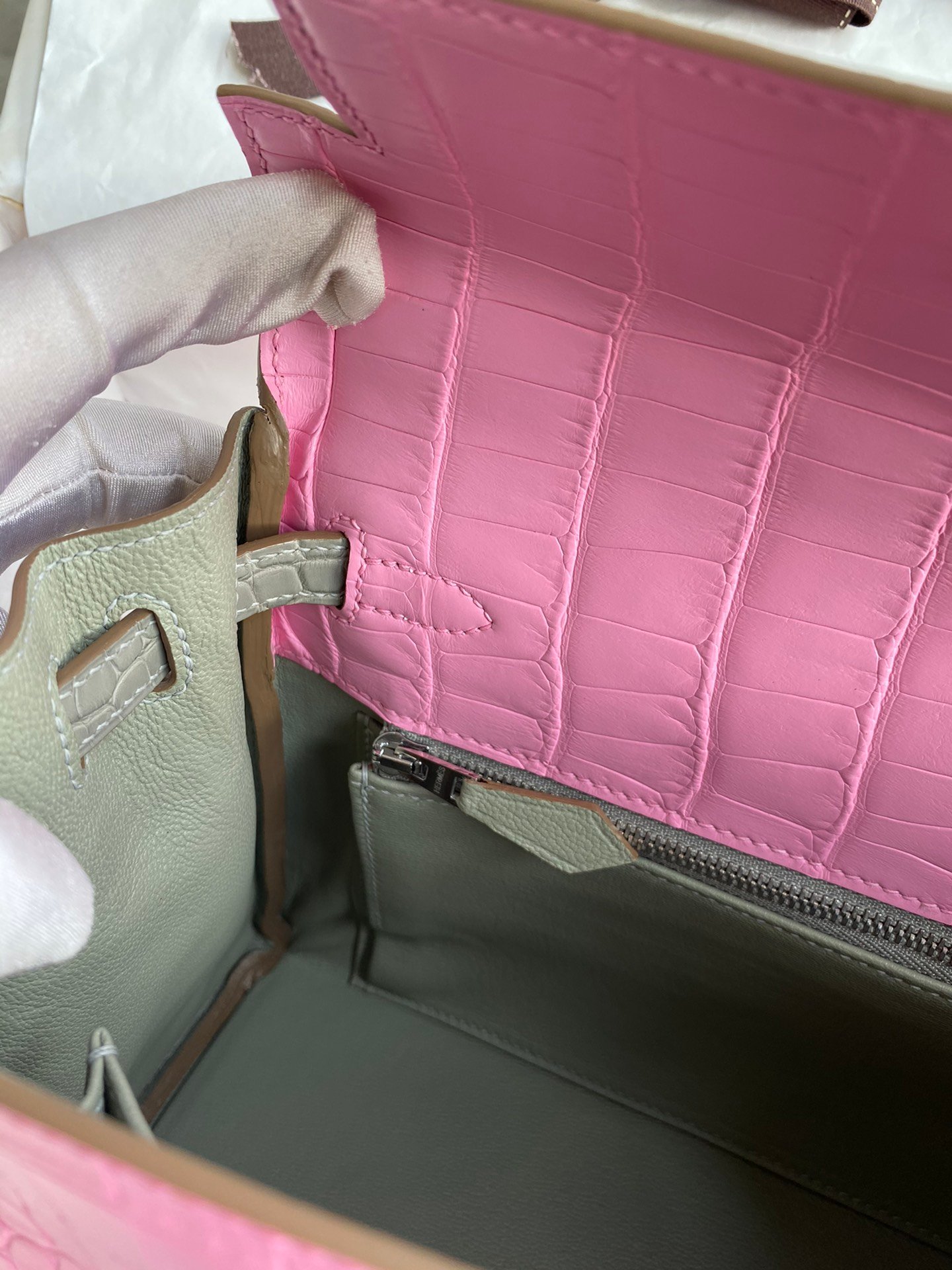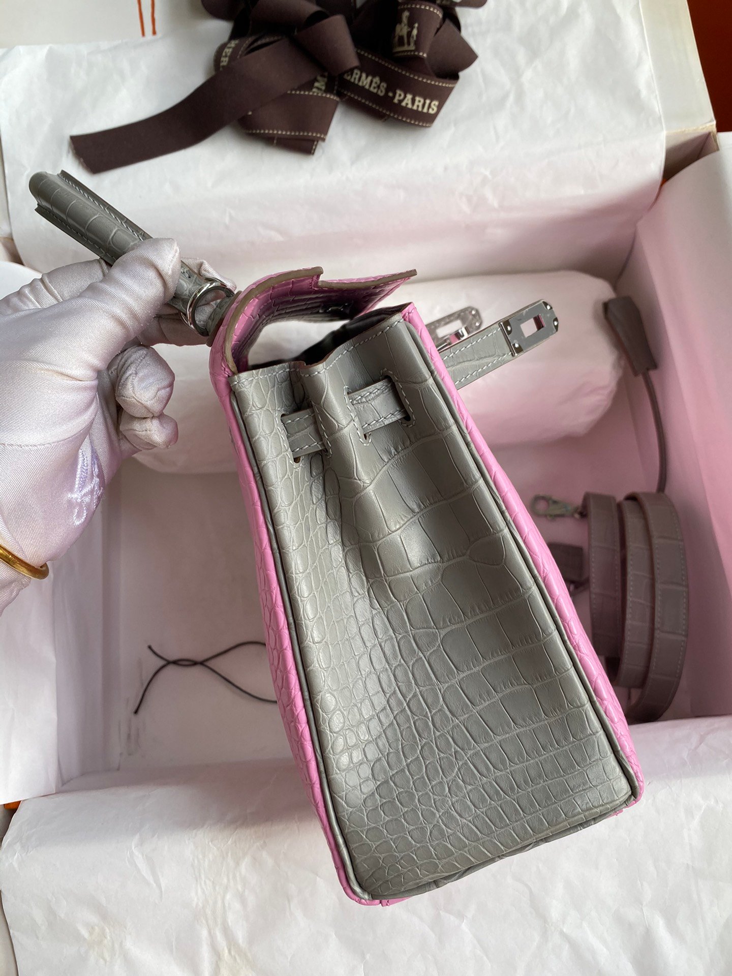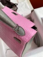 Hermes Fully hand-stitched 👉Kelly 25cm Imported American Crocodile🐊 Cherry Pink with Pearl Gray and Silver Buckle