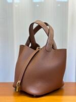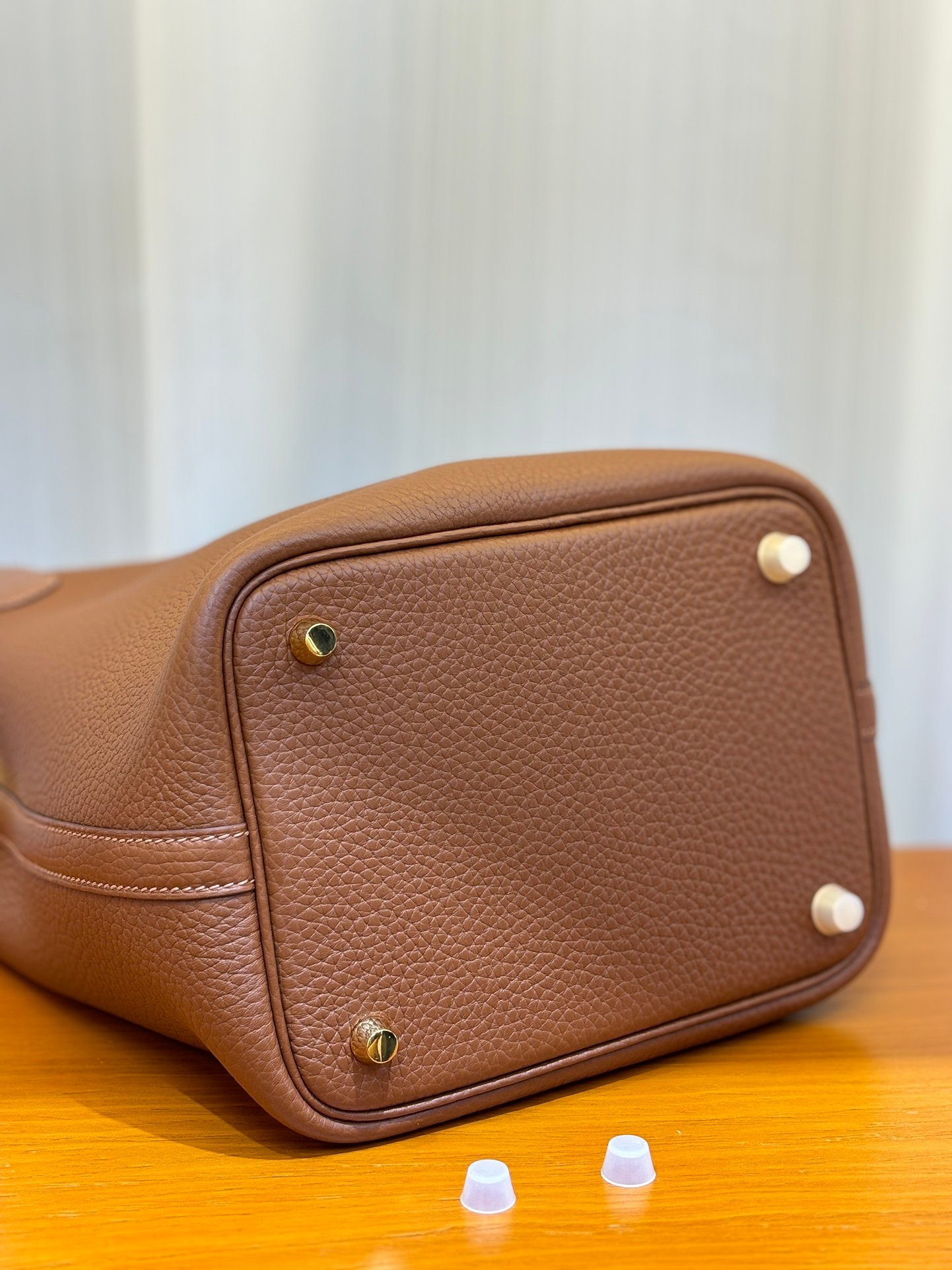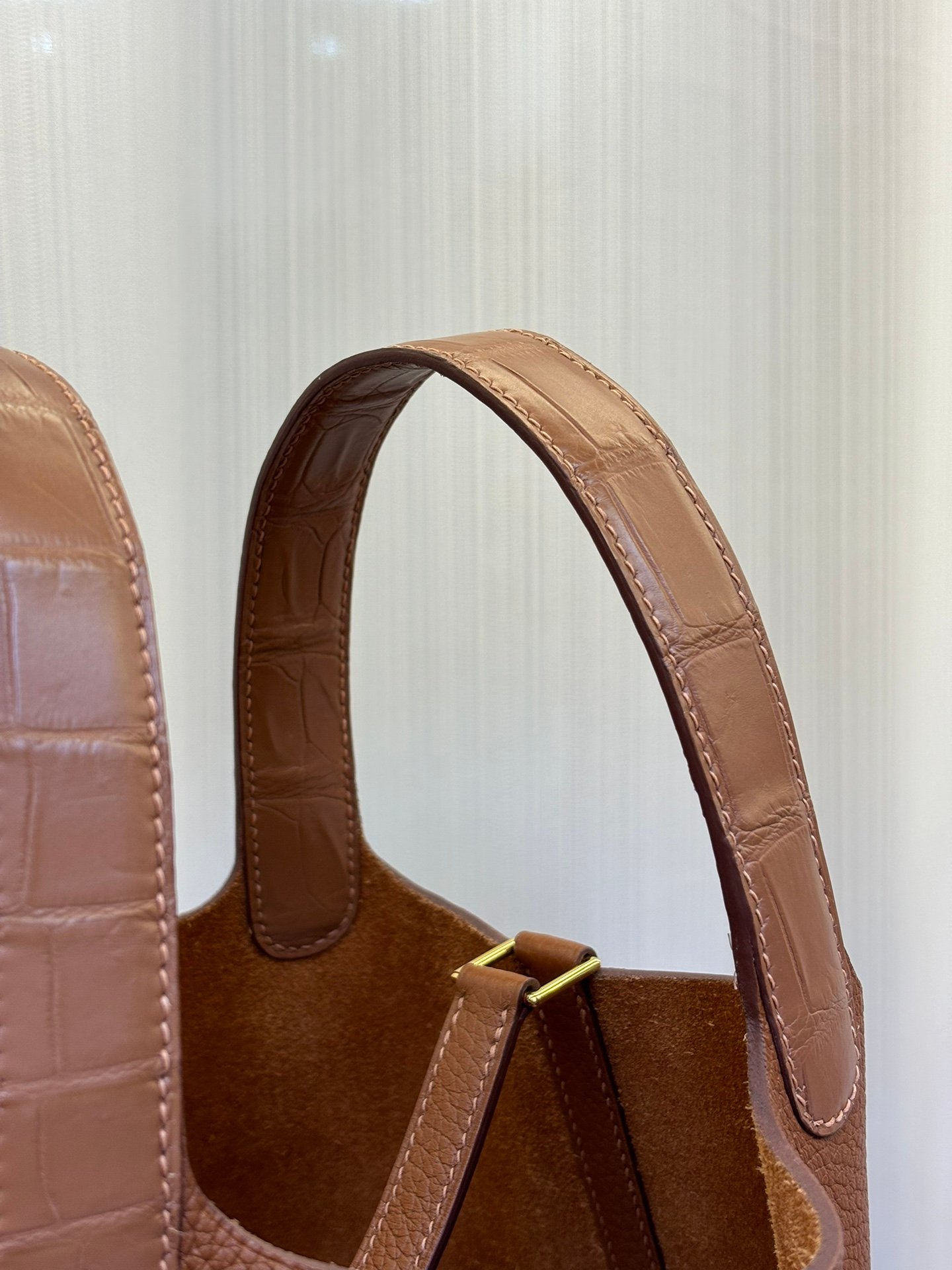 Hermes Golden Brown original price 2800,n one 9️⃣ off , 2520/pcn two people put together a single 7️⃣. 5️⃣ off , after discount 2200/pcnPicotin Touch 18cm gold and silver buckle in stock Imported TC leather splicing nile matte crocodile leather handmade full waxed thread stitching real shot detail picture ✨