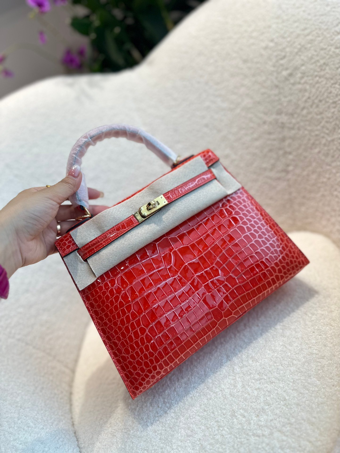 Hermes Spot nKelly 25 Porosus crocodile Inverted V Bay Crocodile nn Glossy Shinny 95 Ferrari Red Braise