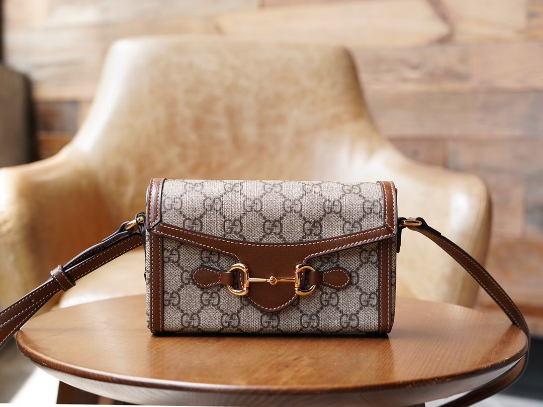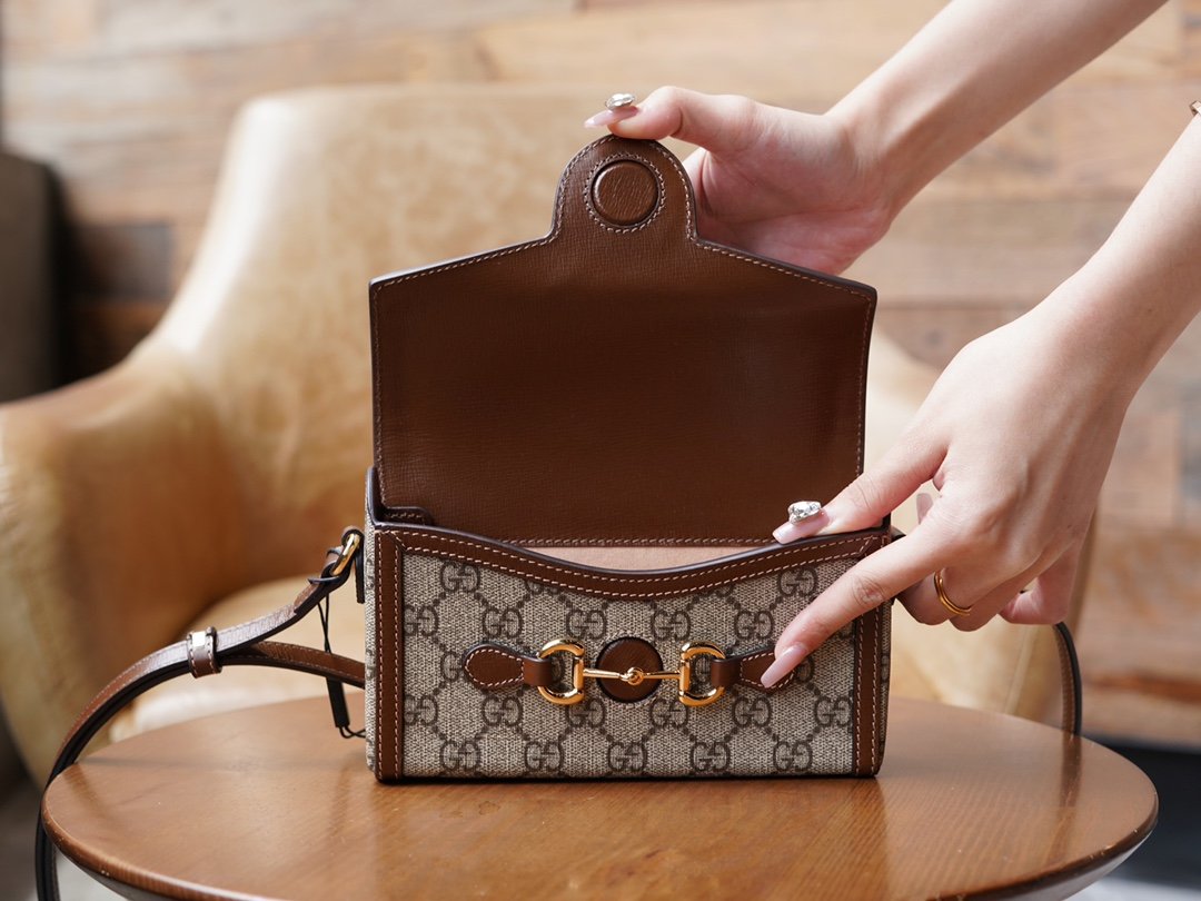 Home BAGS GUCCI Horsebit 𝟏𝟗𝟓𝟓 Collection Crossbody Cell Phone Bag Brown nn The Love March collection is a refreshed rendition of the brand’s iconic elements in homage to Hollywood’s enduring glamour. This handbag is a masterpiece from the n Horsebit 1955 collection. The classic GG Supreme canvas is presented in beige and ebony, and the miniature shape adds to the eye-catching look of the collection’s iconic accessory. nSize: 18*12*5cmnModel No.: 699296