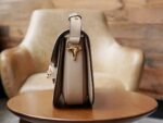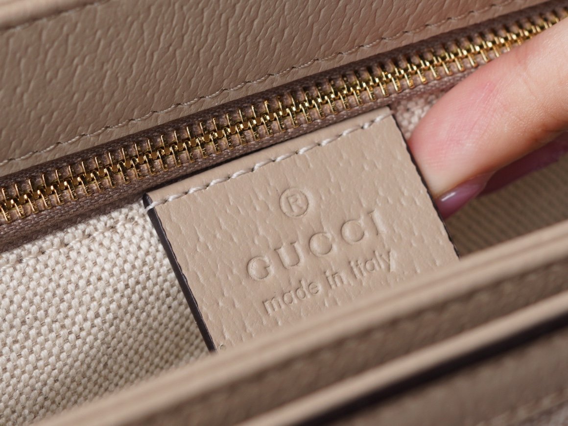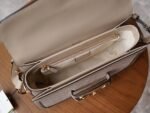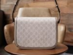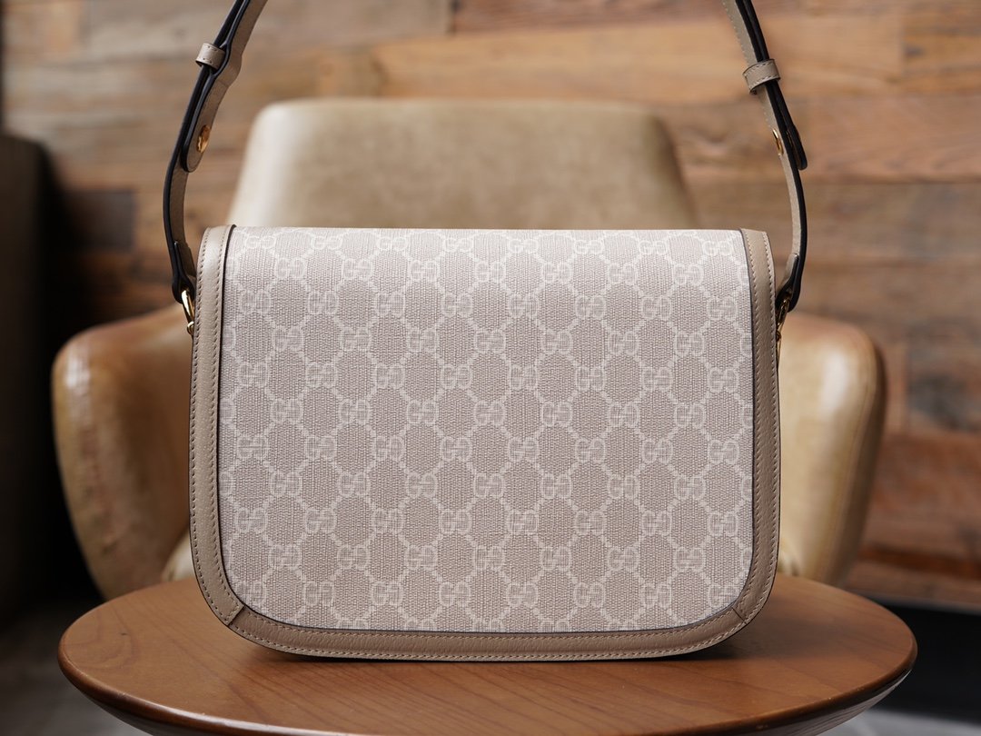 This horsebit 1955 handbag is interpreted in beige and white versions of the iconic fabric, artfully piped in the same color palette. Inspired by the 1930s, the canvas echoes the collection’s stylish retro design concept.