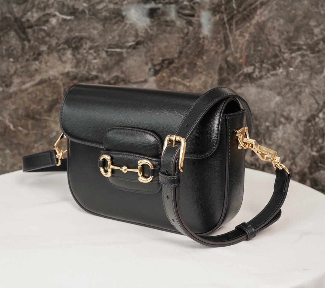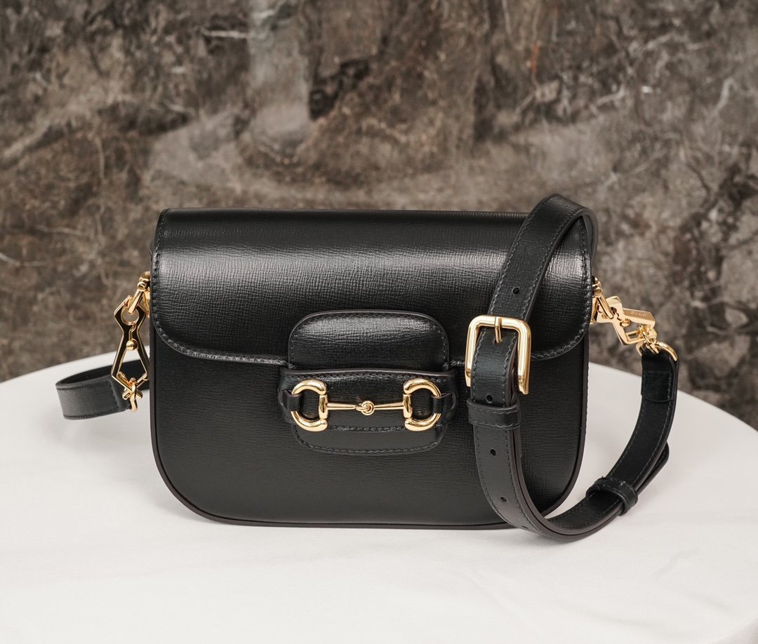 Home BAGS GUCCI Horsebit 𝟏𝟗𝟓𝟓 Mini Handbag Black n Removable double shoulder straps add a mix-and-match look to this vintage-inspired collection. n This mini handbag comes with two different straps, one in the same color leather for understated elegance, and the other in red and green webbing for a strong brand identity. The bag is crafted from double G monogrammed canvas with black leather piping. nSize: 20.5*14.5*5cmn🔍: 6585730031
