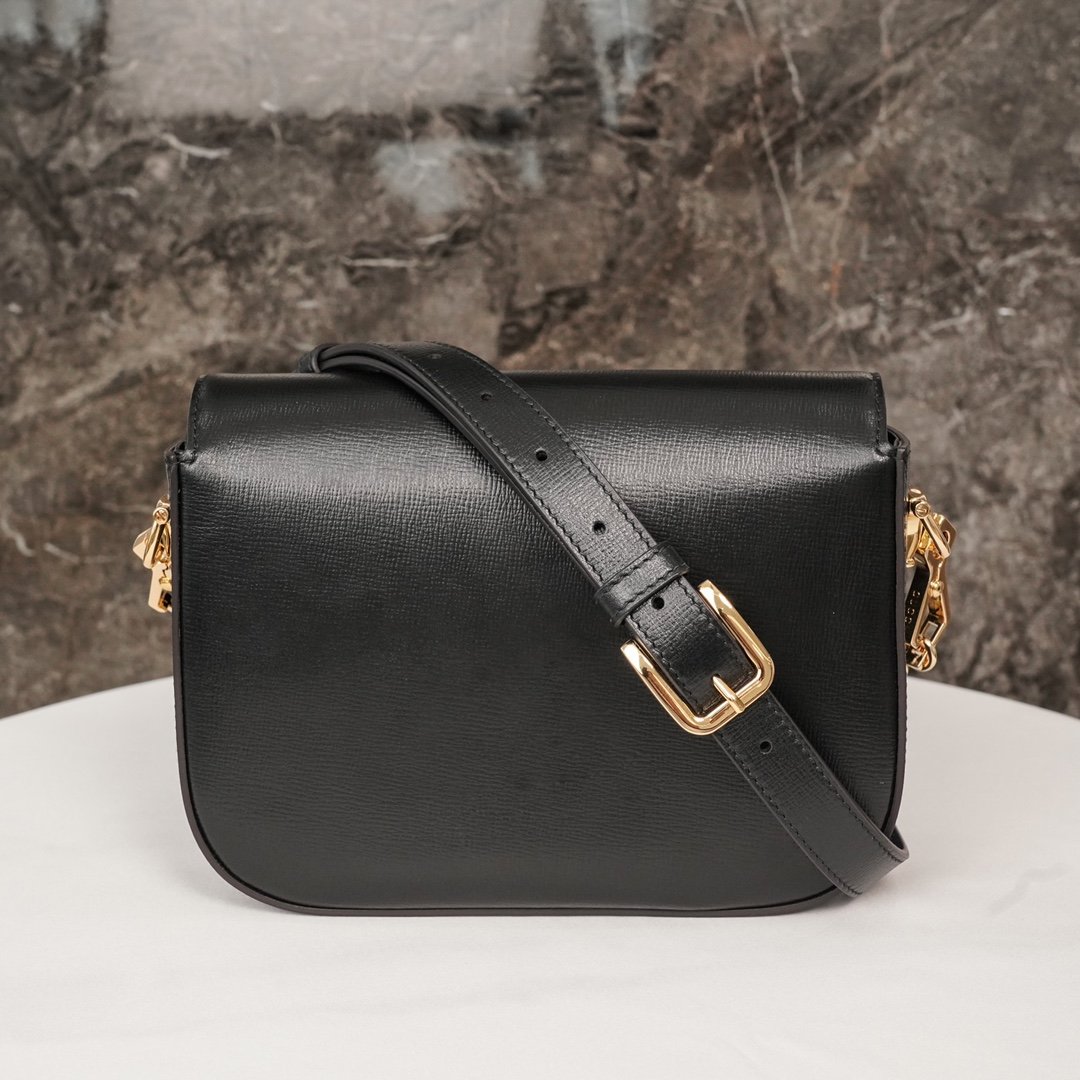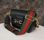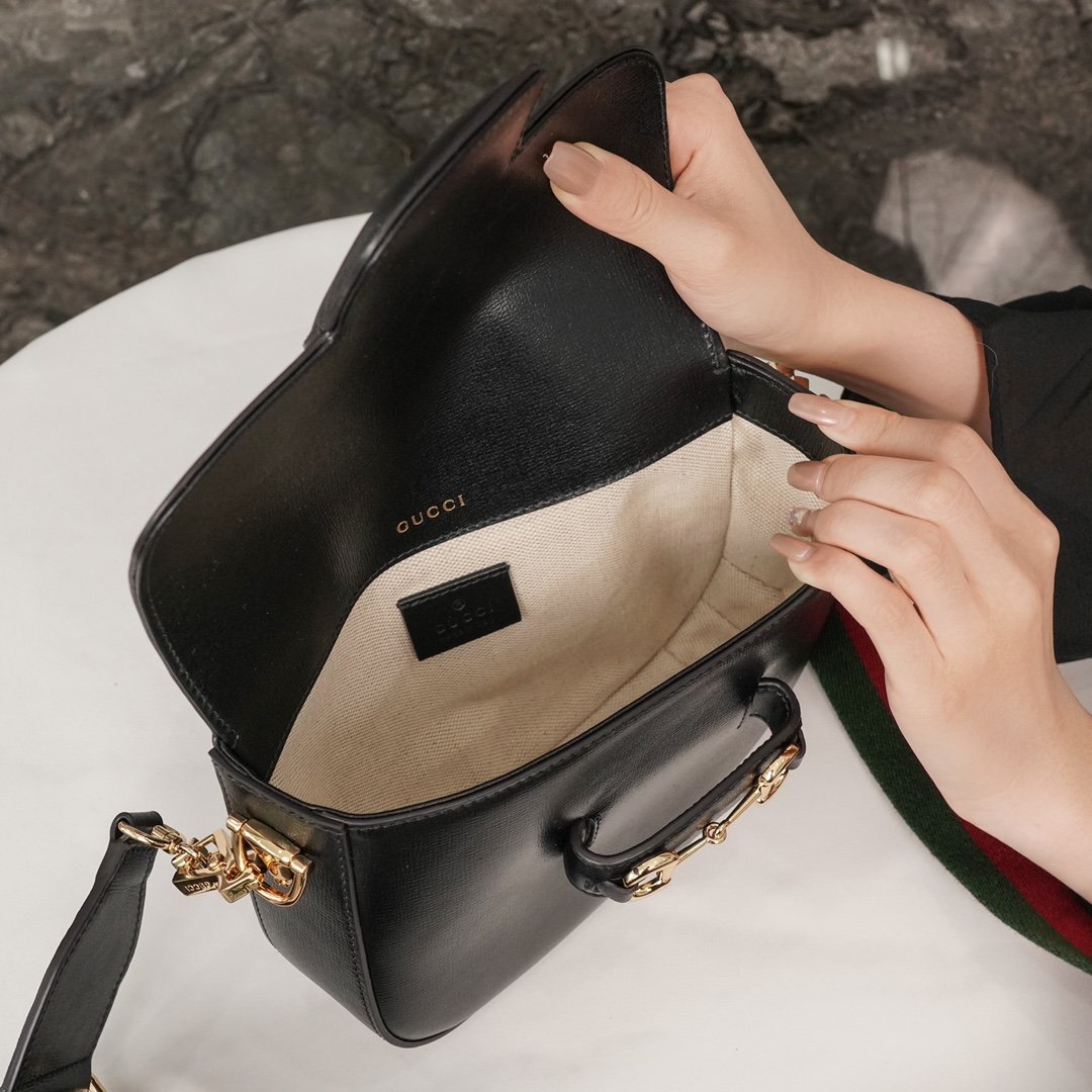 Horsebit 𝟏𝟗𝟓𝟓 Mini Handbag Black n Removable double shoulder straps add a mix-and-match look to this vintage-inspired collection. n This mini handbag comes with two different straps, one in the same color leather for understated elegance, and the other in red and green webbing for a strong brand identity. The bag is crafted from double G monogrammed canvas with black leather piping. nSize: 20.5*14.5*5cmn🔍: 6585730031