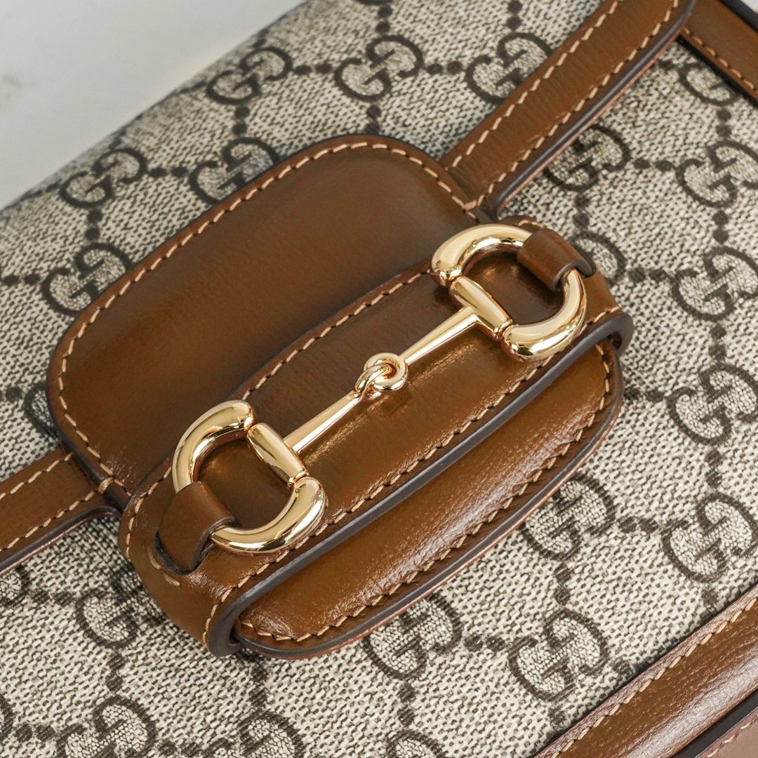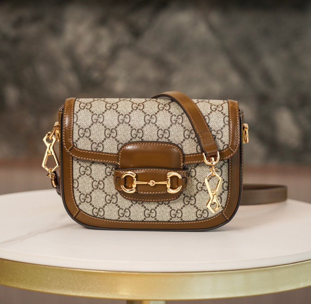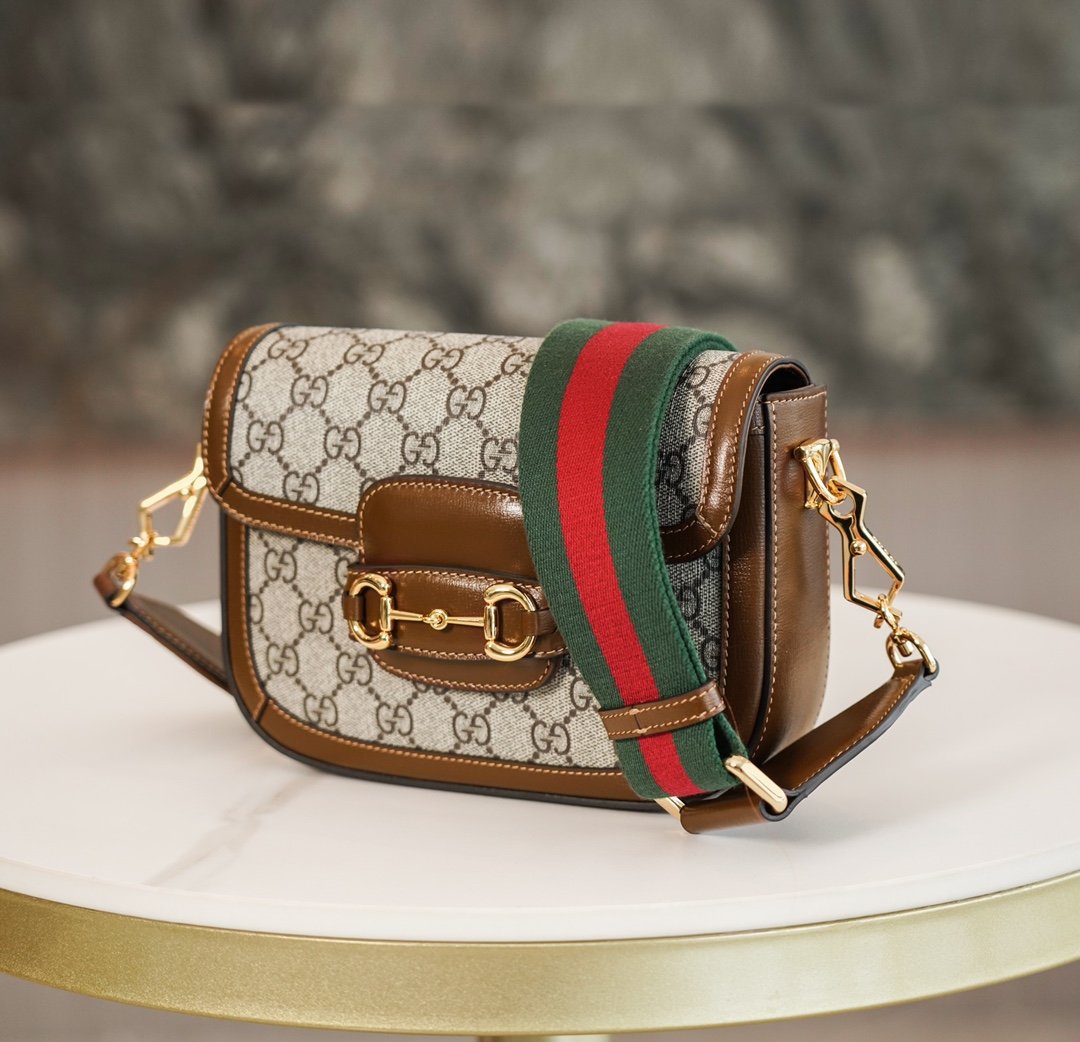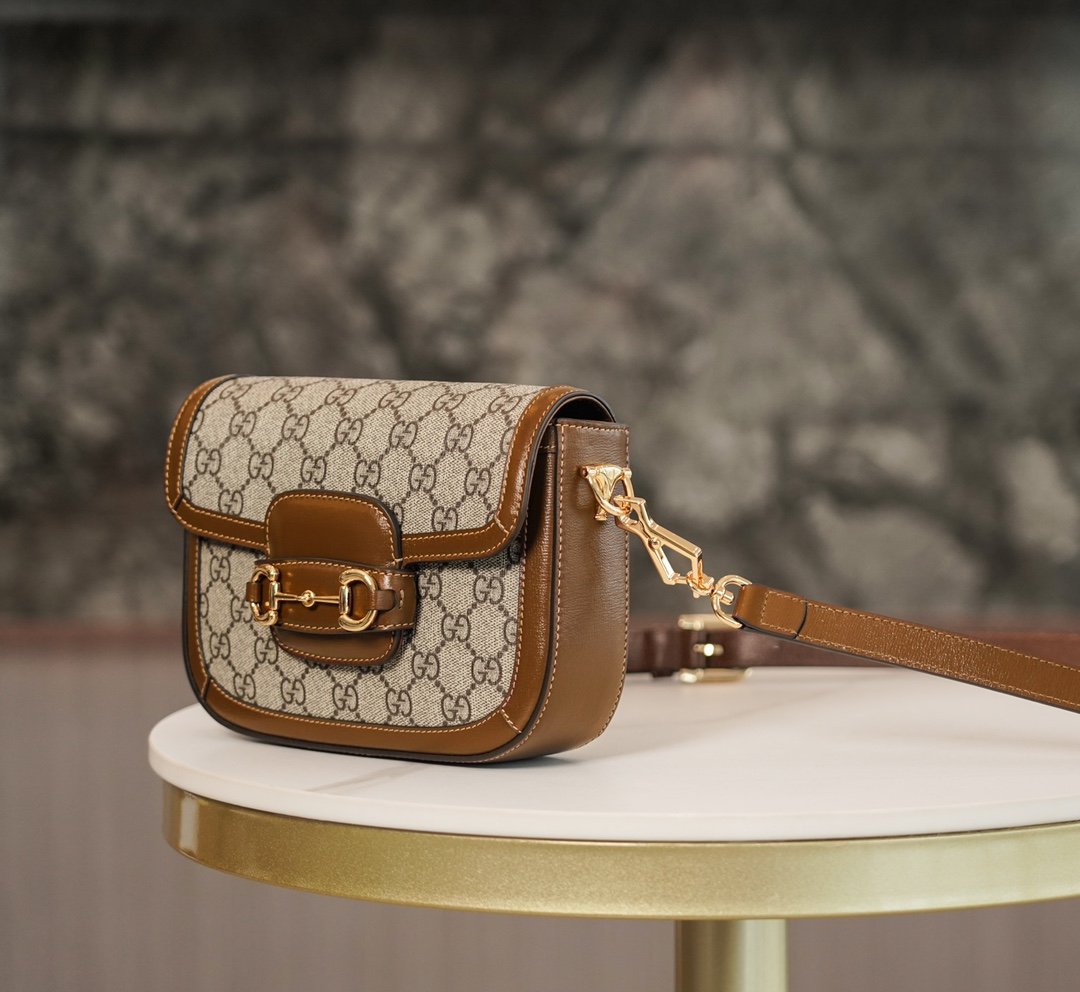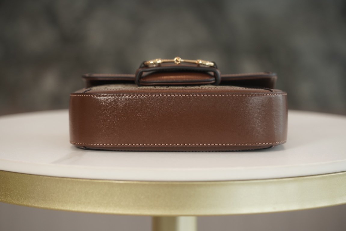 Horsebit 𝟏𝟗𝟓𝟓 Mini Handbag Brown nn Detachable shoulder straps add a mix-and-match look to this vintage-inspired collection. nThis mini handbag comes with two different straps, one in the same color leather for an understated elegance, and the other in red and green webbing for a strong brand identity. The bag is crafted from double G monogrammed canvas with brown leather piping. nSize: 20.5*14.5*5cmnModel No.: 658573