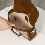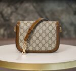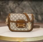 Be the first to review “Horsebit 𝟏𝟗𝟓𝟓 Mini Handbag Brown nn Detachable shoulder straps add a mix-and-match look to this vintage-inspired collection. nThis mini handbag comes with two different straps, one in the same color leather for an understated elegance, and the other in red and green webbing for a strong brand identity. The bag is crafted from double G monogrammed canvas with brown leather piping. nSize: 20.5*14.5*5cmnModel No.: 658573” Cancel reply