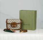 Horsebit 𝟏𝟗𝟓𝟓 Mini Handbag The white n detachable double shoulder strap adds a mix-and-match look to this vintage-inspired collection. n This mini handbag comes with two different straps, one in the same color leather for an understated elegance, and one in red and green webbing for a strong brand identity. The bag is crafted from double G monogrammed canvas with white leather piping. nSize: 20.5*14.5*5cmn🔍: 6585730031 $280.00