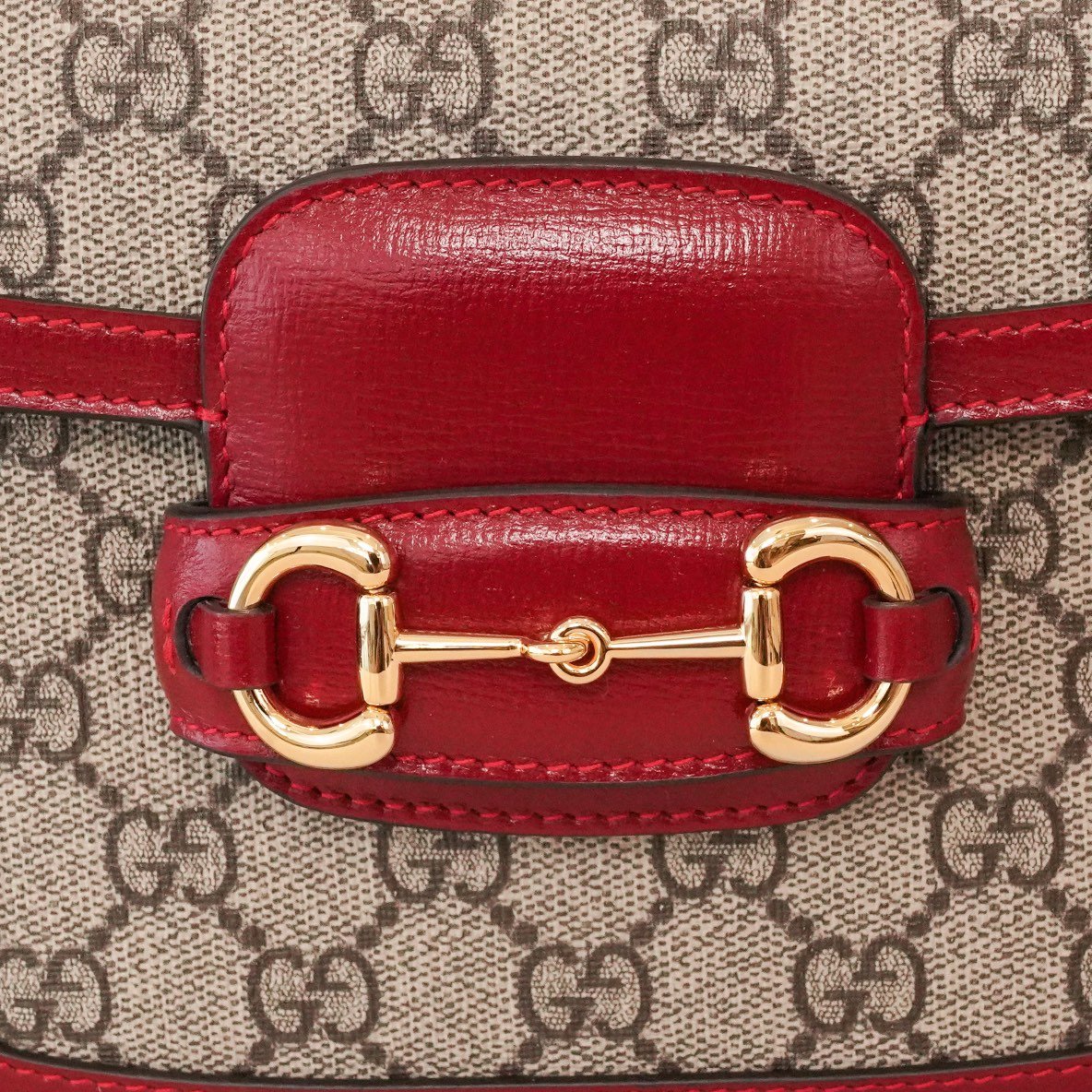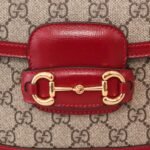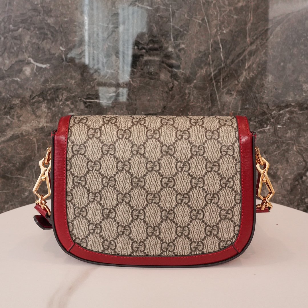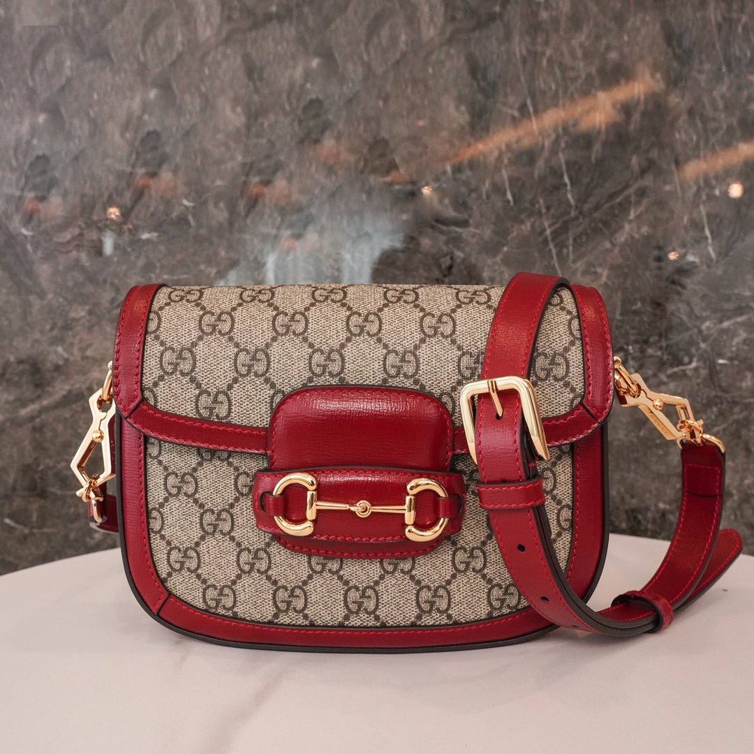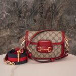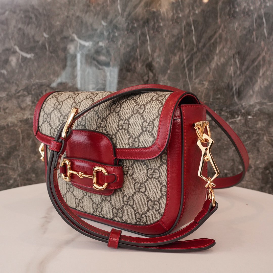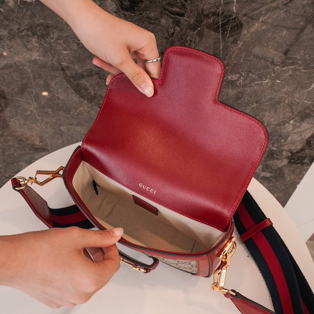 Home BAGS GUCCI Horsebit ๐Ÿ๐Ÿ—๐Ÿ“๐Ÿ“ Mini Handbag The red nn detachable shoulder straps add a mix-and-match look to this vintage-inspired collection. nThis mini handbag comes with two different straps, one in the same color leather for an understated elegance, and the other in red and green webbing for a strong brand identity. The bag is crafted from double G monogrammed canvas with red leather piping. nSize: 20.5*14.5*5cmnModel No.: 658573