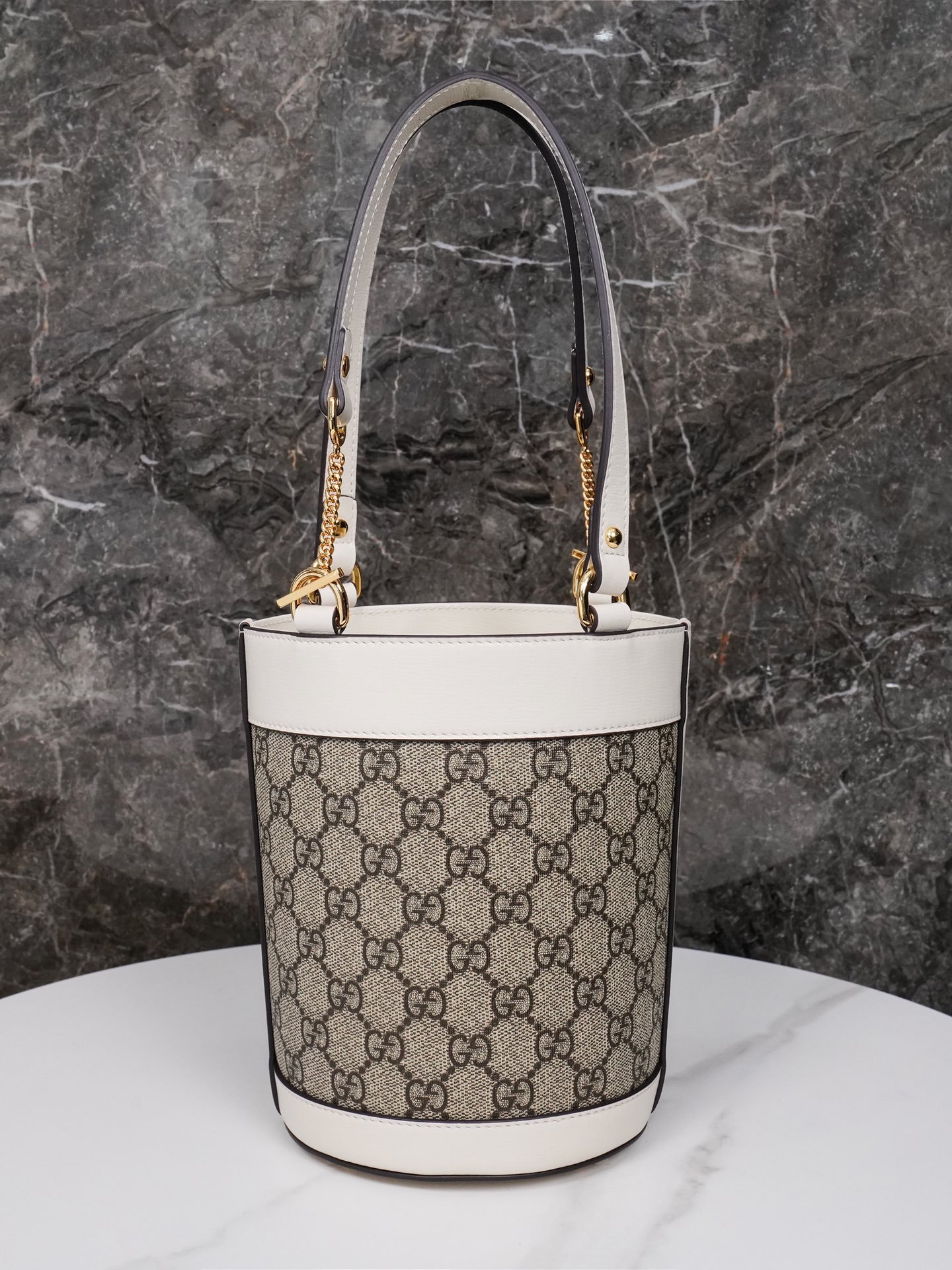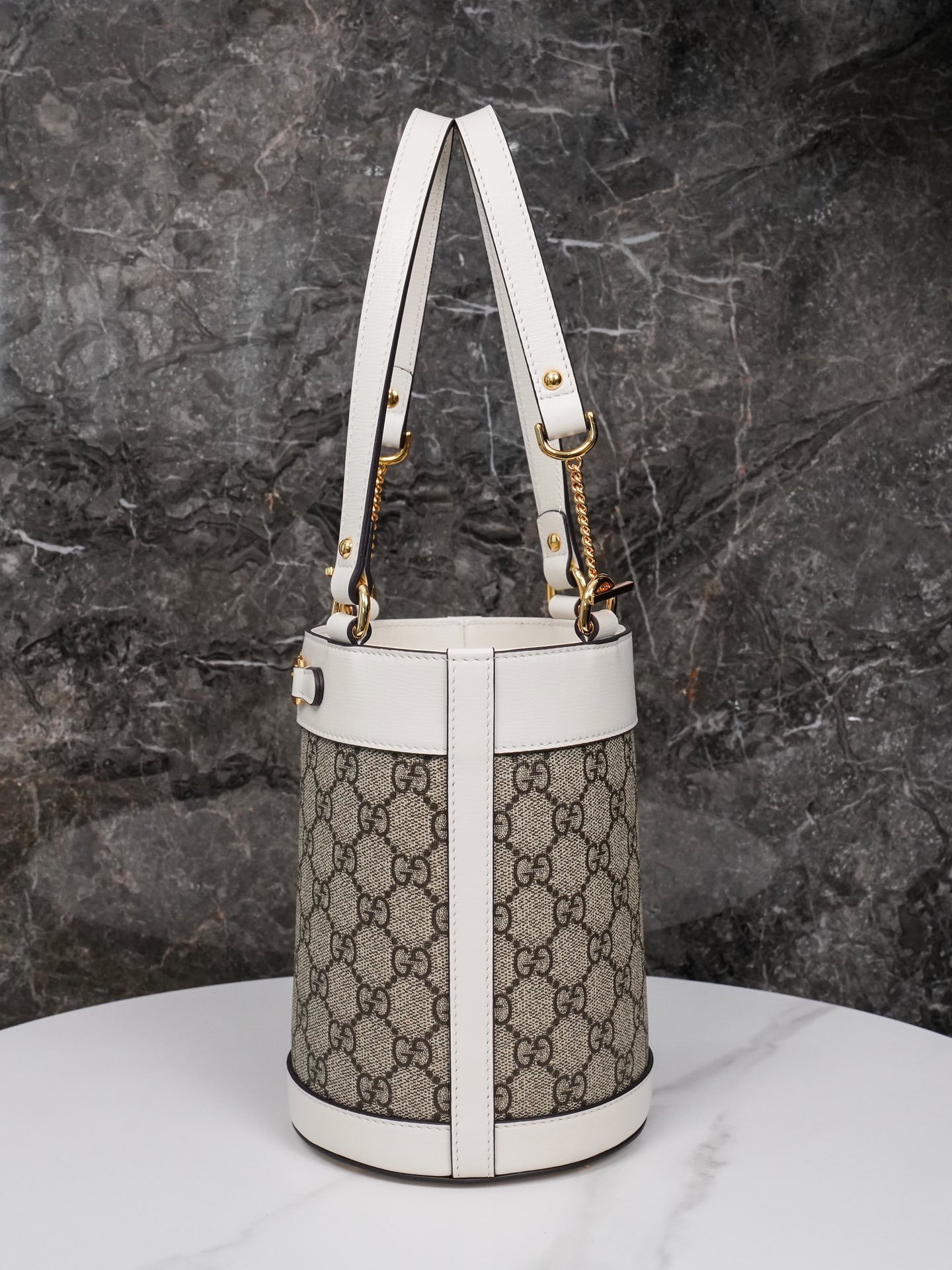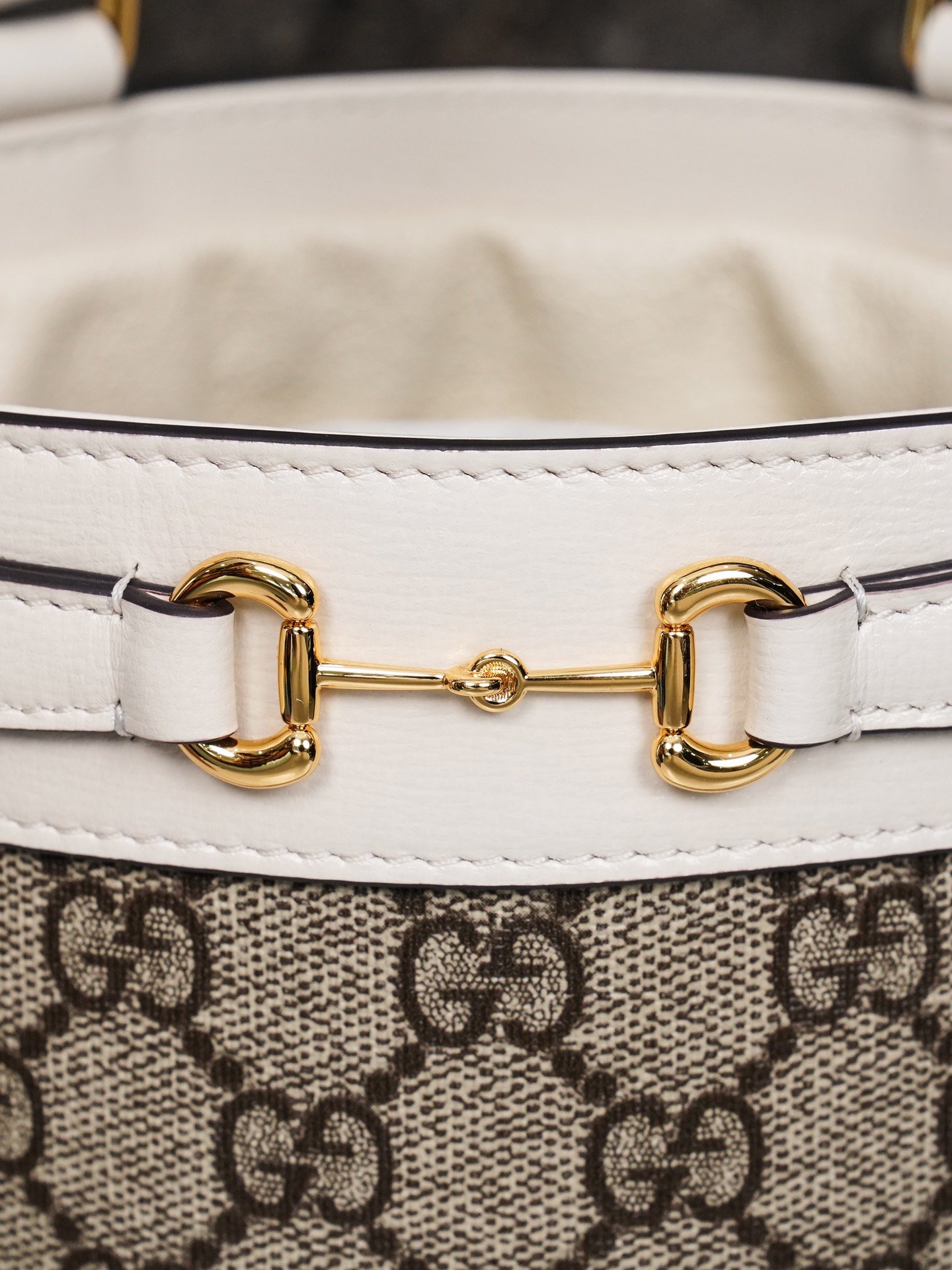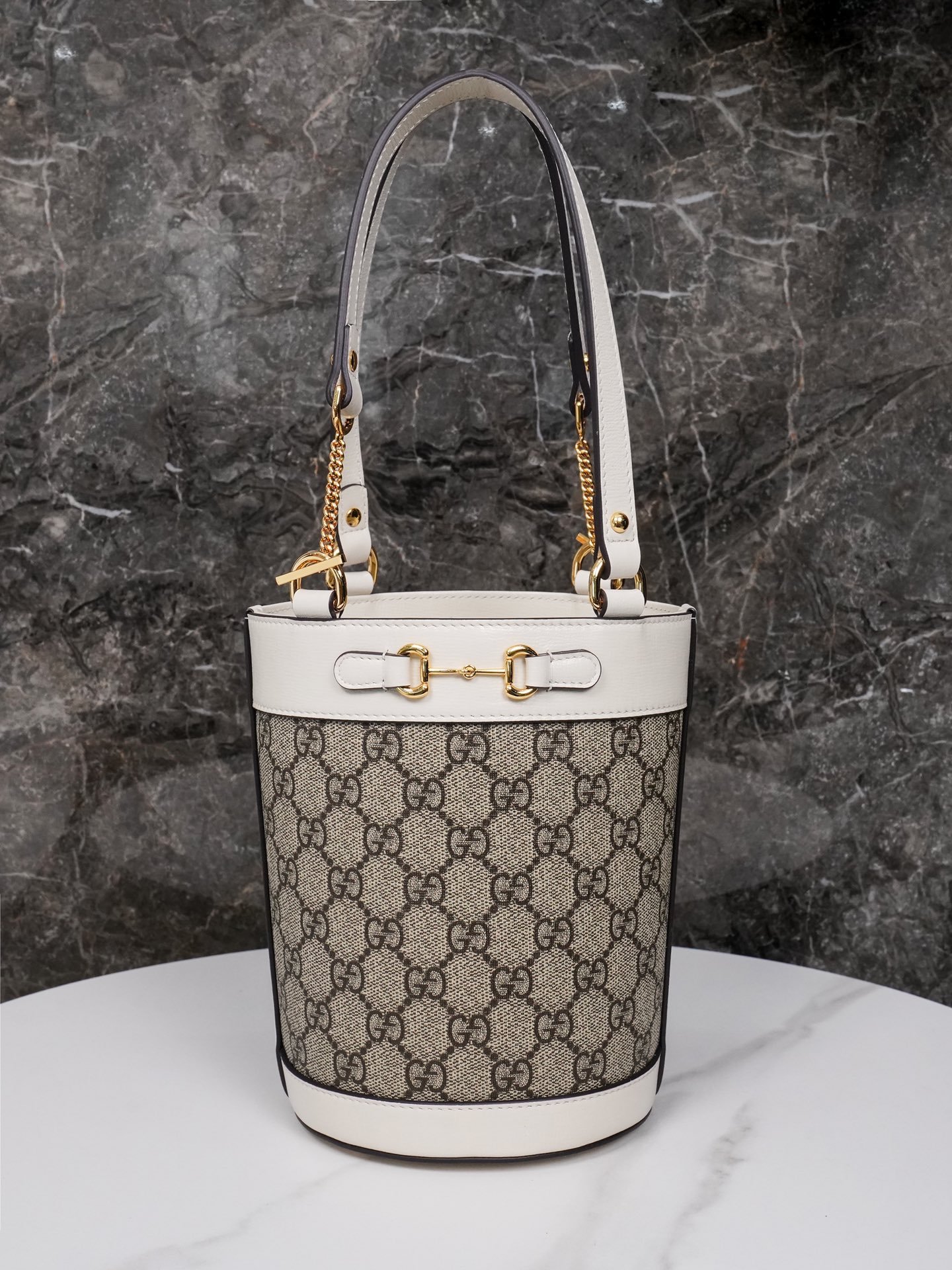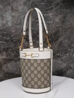 Horsebit 1955 Bucket Bag White nnThe GG Supreme canvas with white leather and deconstructed drawstring closure, the new rounded bucket bag shape revitalizes the collection. Inspired by the collection’s iconic designs, the collection inherits the design details used on the bags, while injecting a modern twist to the horsebit’s charm. A classic symbol of the G family’s heritage, the horsebit motif of double rings and elongated elements draws inspiration from its equestrian origins and has become a dazzling brand icon. nSize: 14*19*14cmnModel No.: 637115