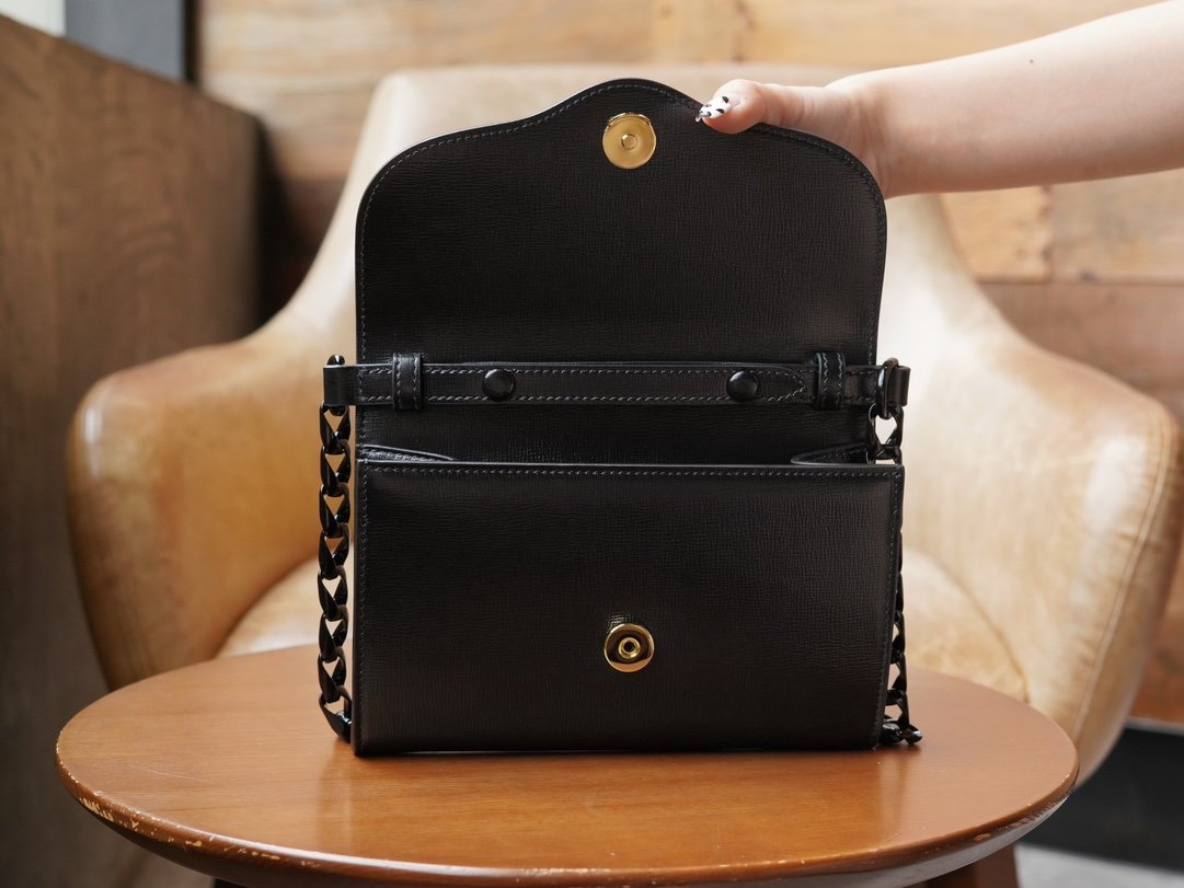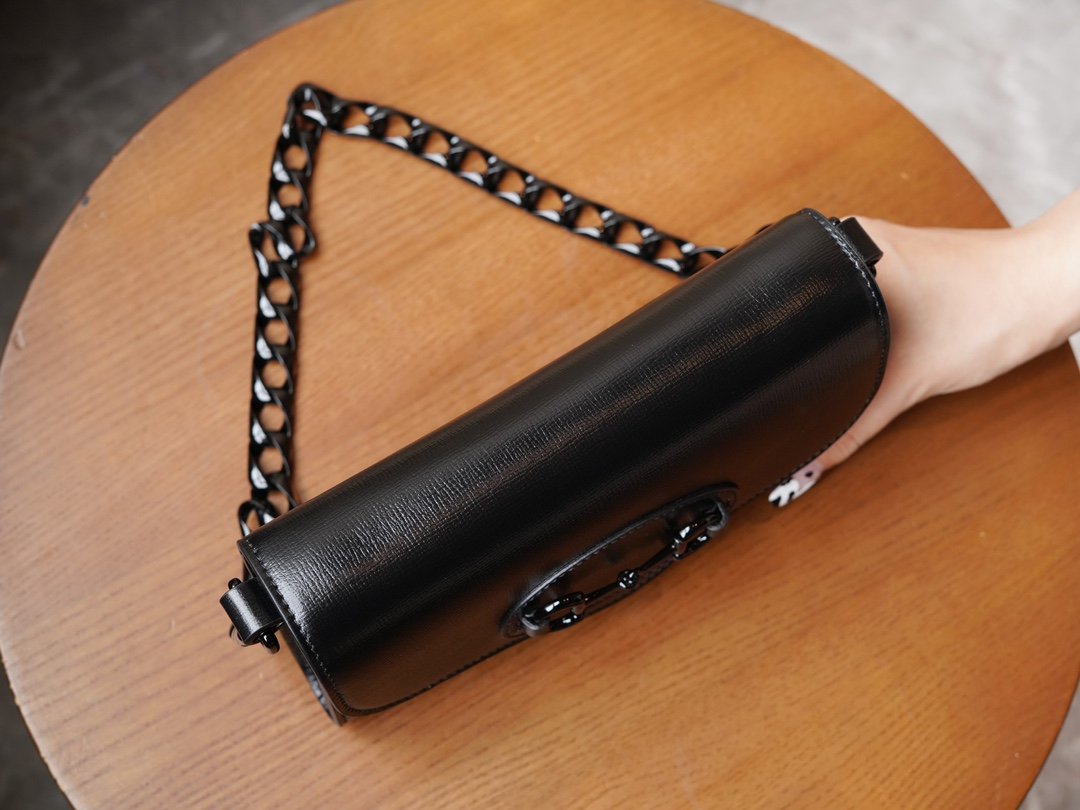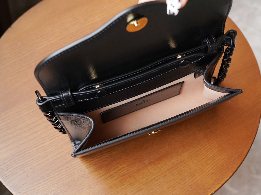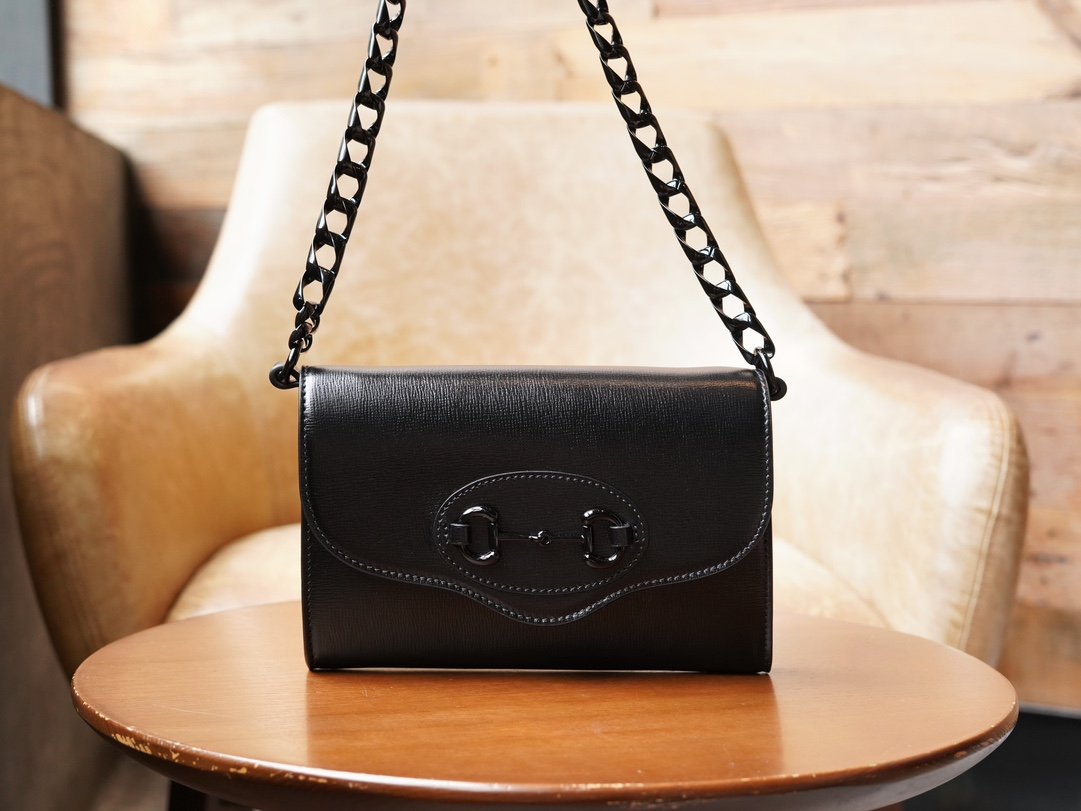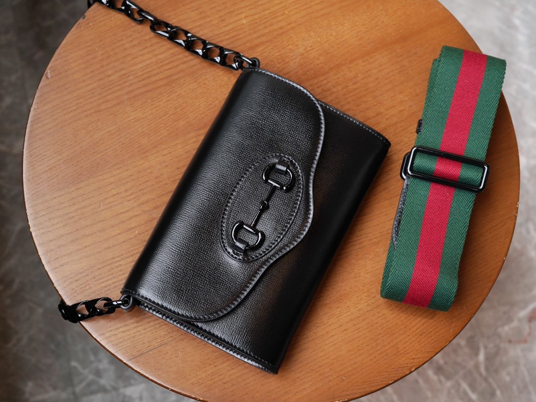Horsebit 1955 Chain Envelope Bag Black Mini nnThis Horsebit 1955 handbag comes with two detachable shoulder straps, one with the classic red and green webbing design, and the other with the recognizable Gucc1 chain design, which exemplifies the brand’s philosophy of practical design. The handbag is crafted in black leather and adorned with the collection’s signature horsebit hardware. nSize: 20*12*5.5cmnModel No.: 724713