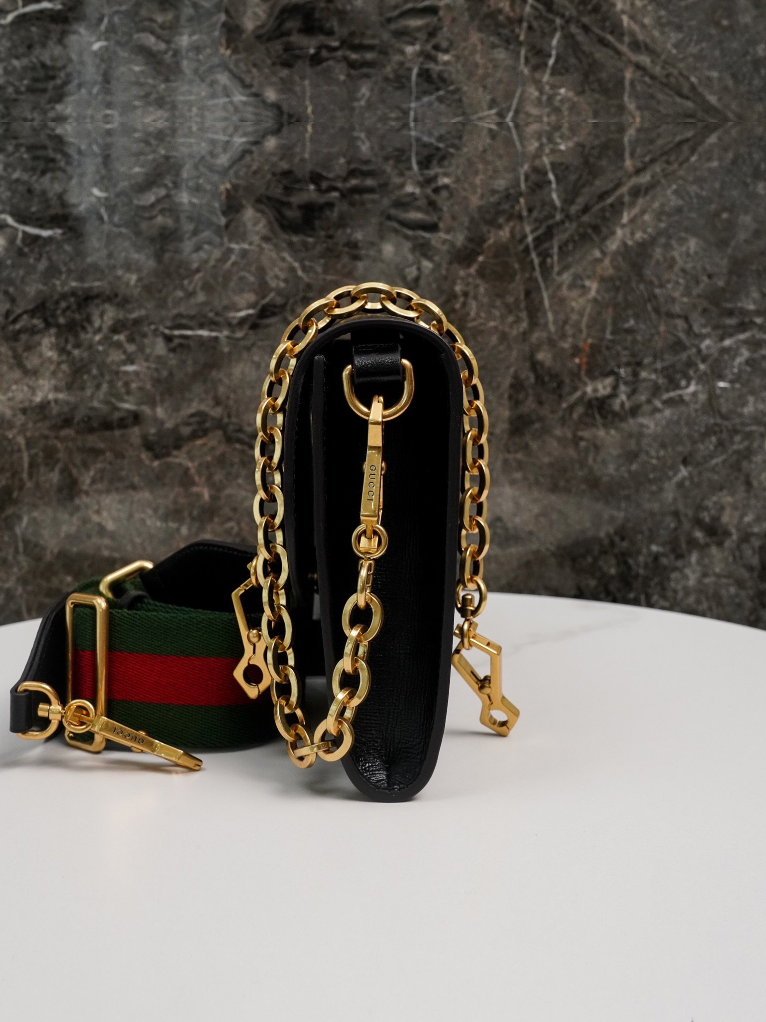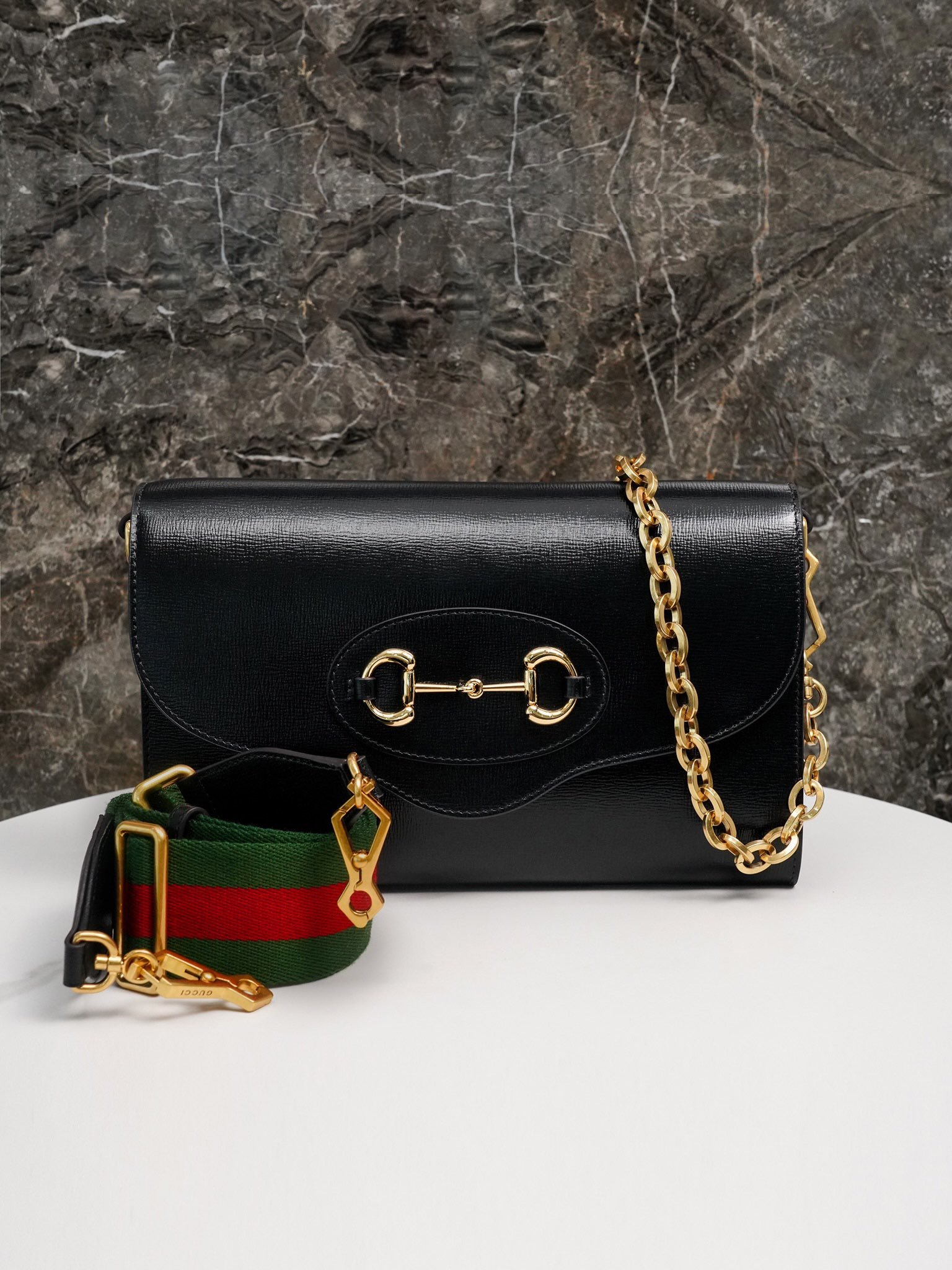 The new bag comes with two detachable shoulder straps, one with a classic red and green webbing design, and the other with a recognizable gold-toned chain design, which illustrates the brand’s philosophy of practical design. The handbag is crafted in black leather and adorned with the collection’s signature horsebit hardware.