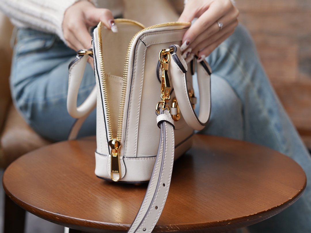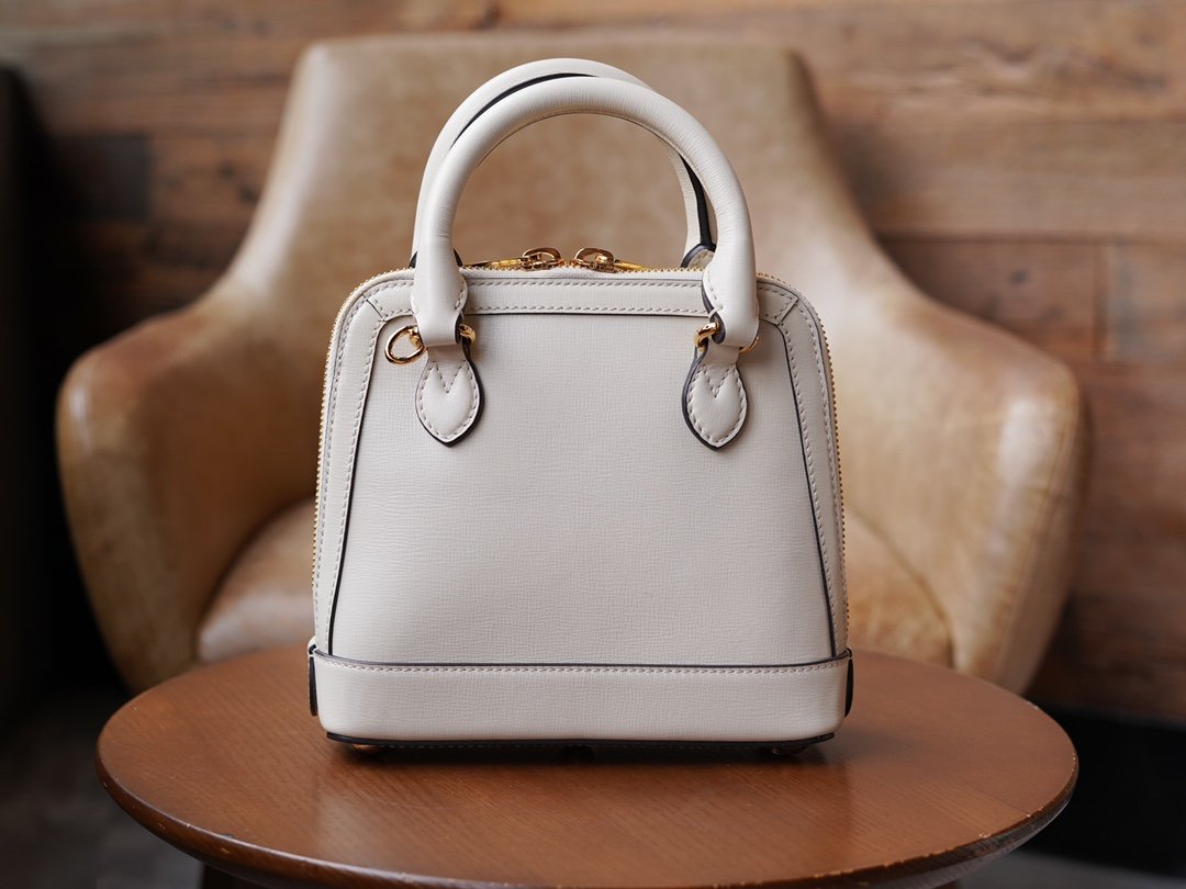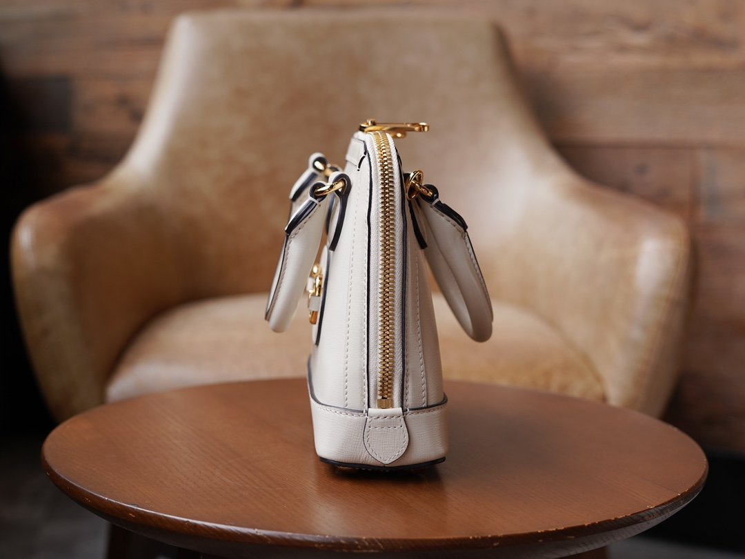 This handbag features a dome shape with an optional leather shoulder strap. The delicate and compact mini handbag design in white leather is the center of attention in the Epilogue collection.