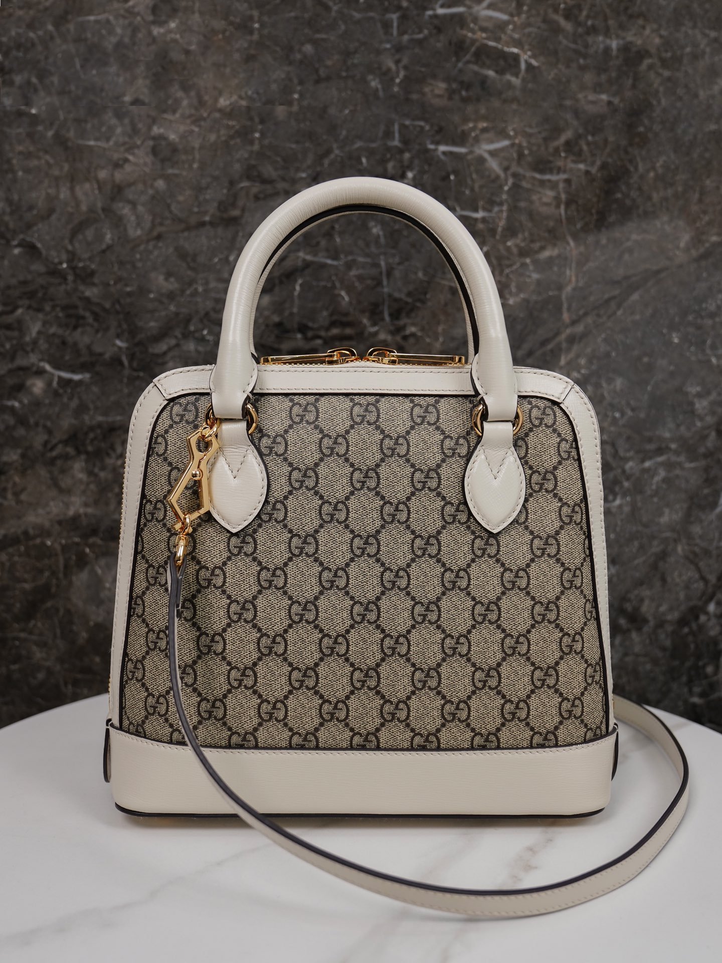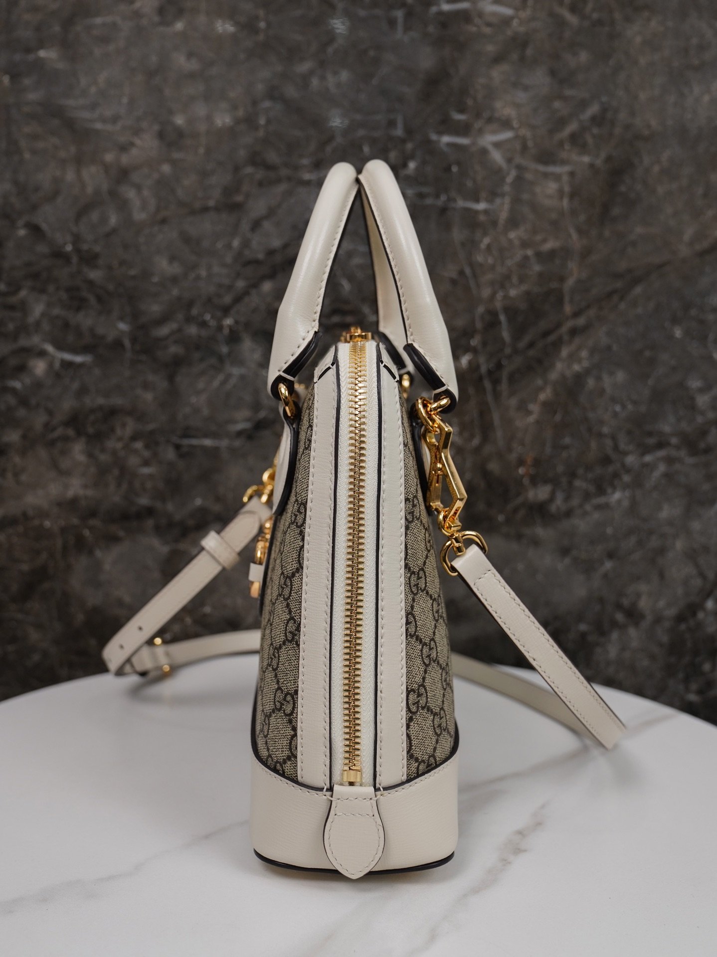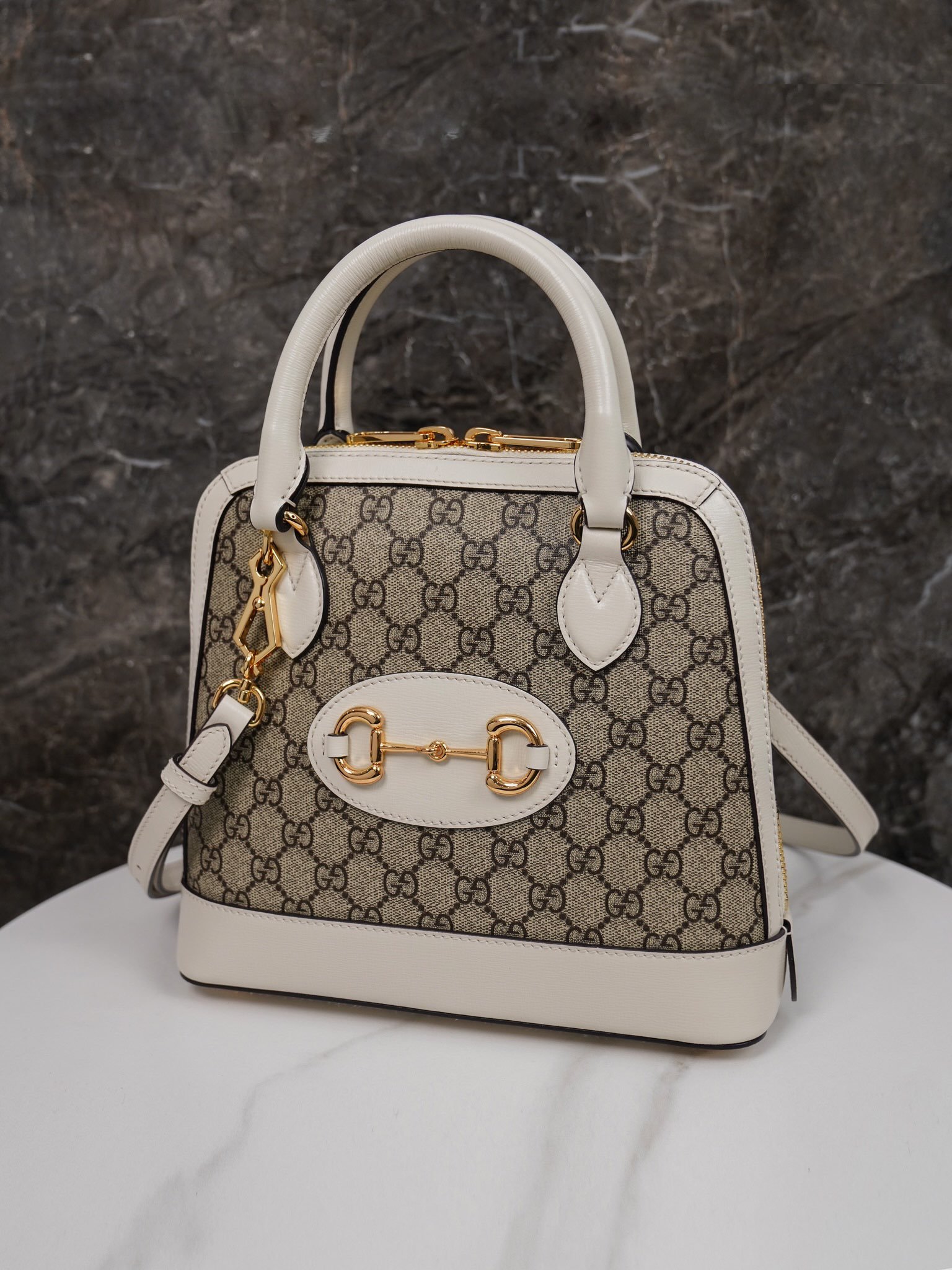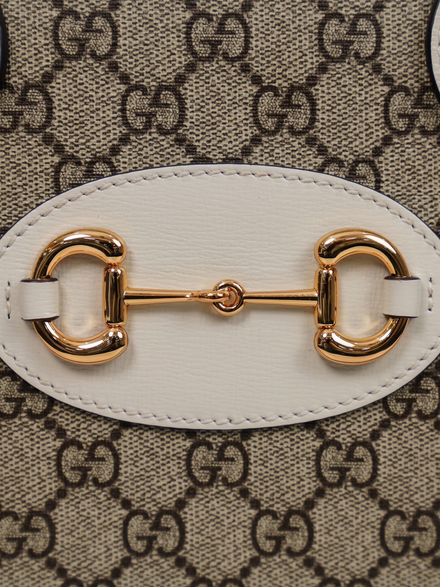 This Horsebit Buckle 1955 Collection handbag features a dome shape with a detachable leather shoulder strap, crafted from GG Supreme canvas and white leather.