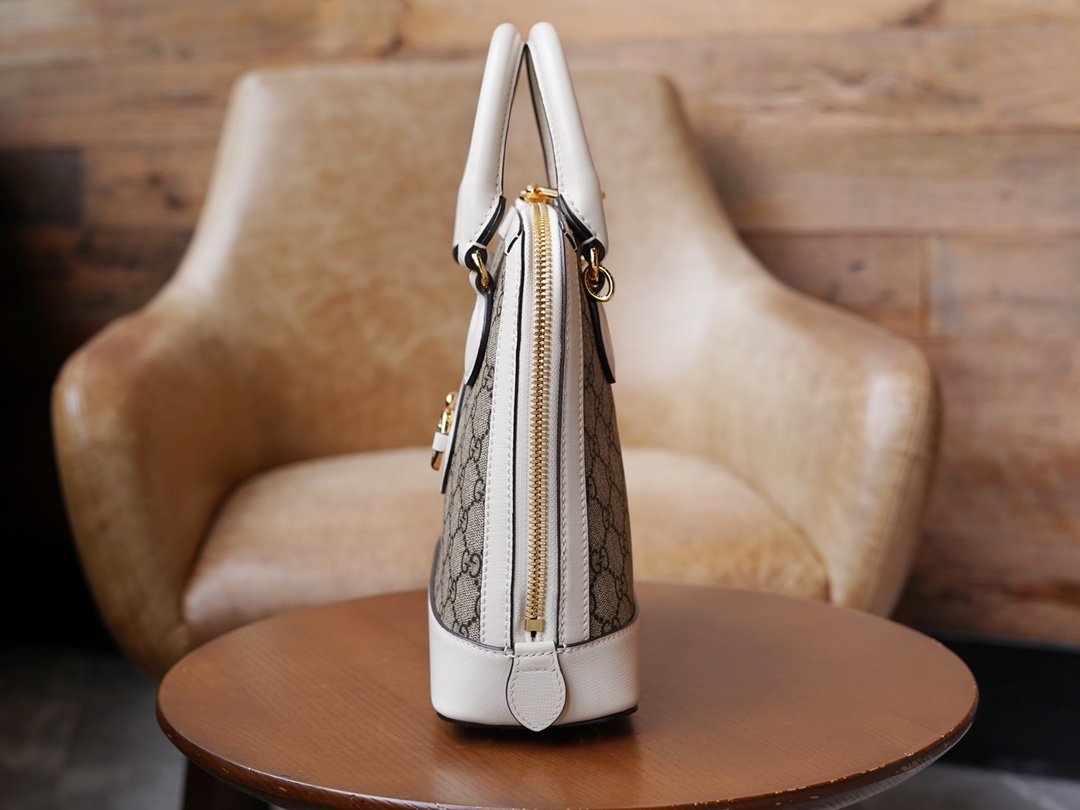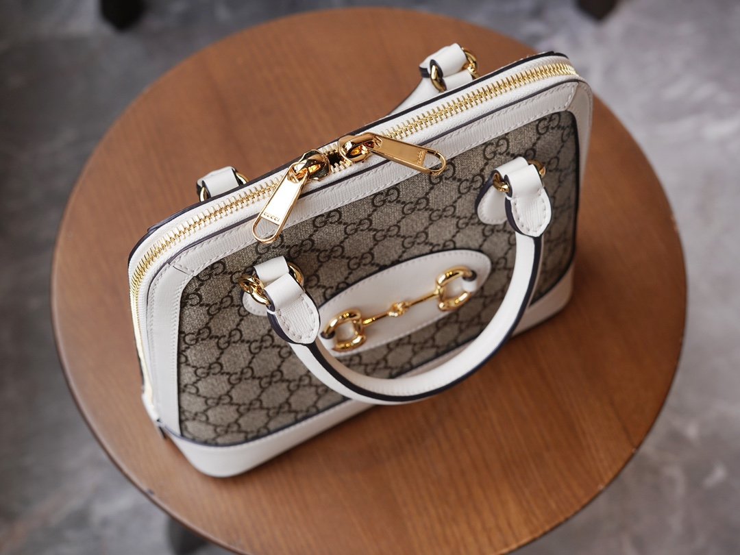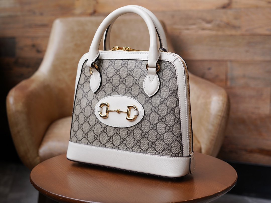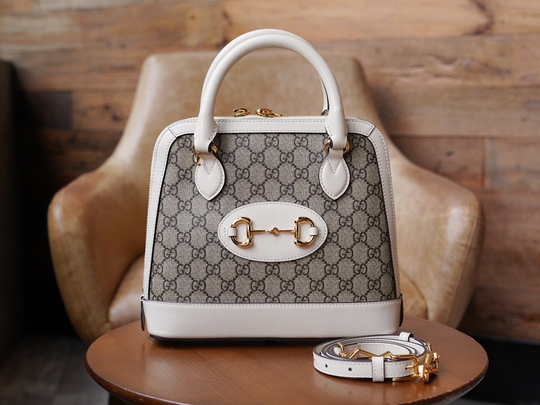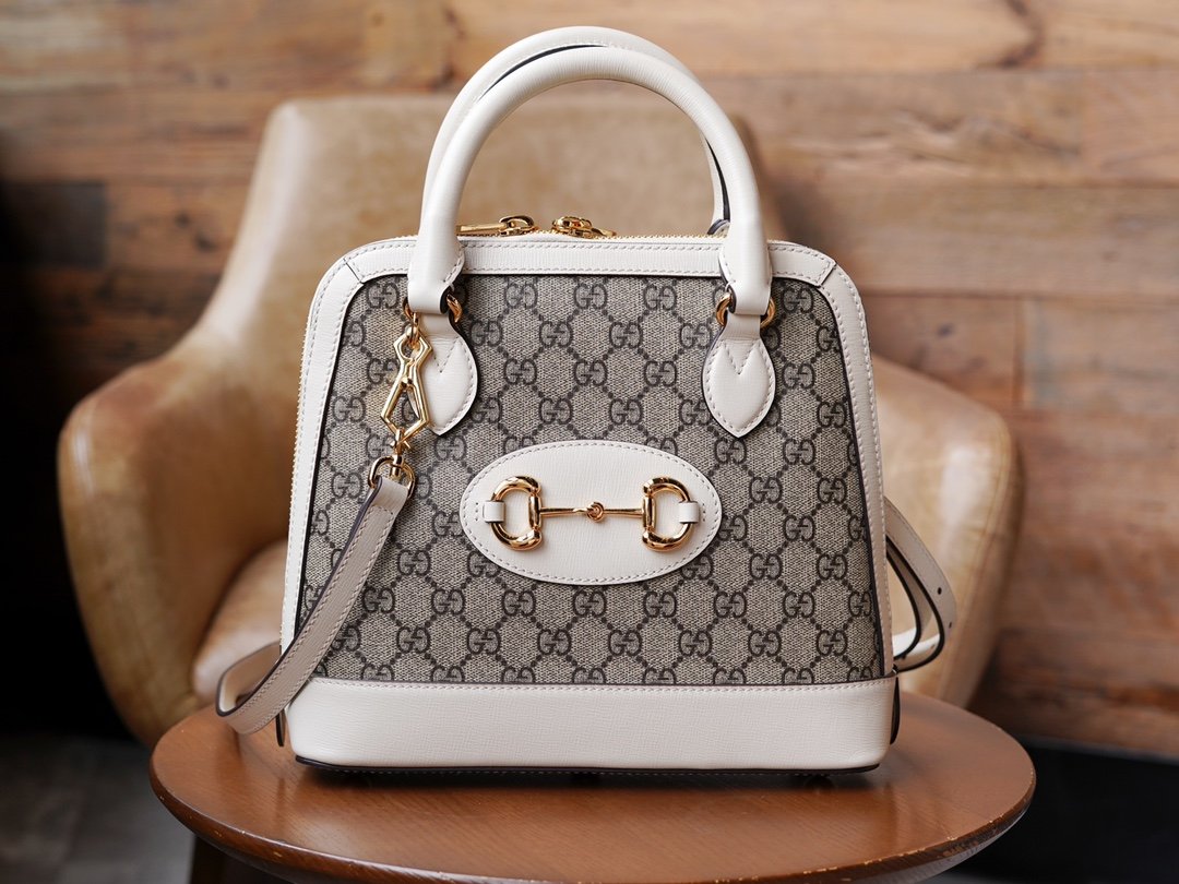 This Horsebit Buckle 1955 Collection handbag features a dome shape with a detachable leather shoulder strap, crafted from GG Supreme canvas and white leather.