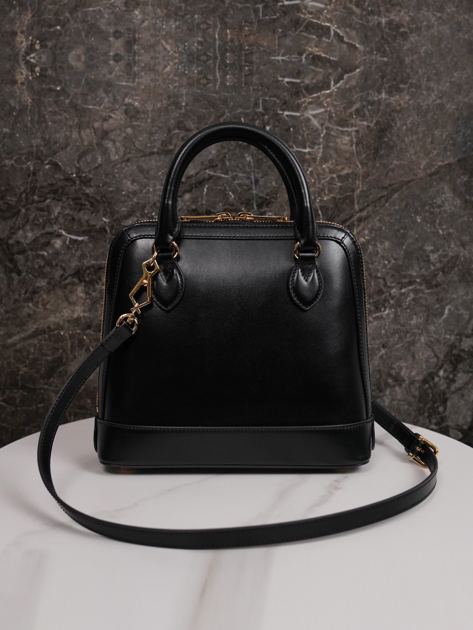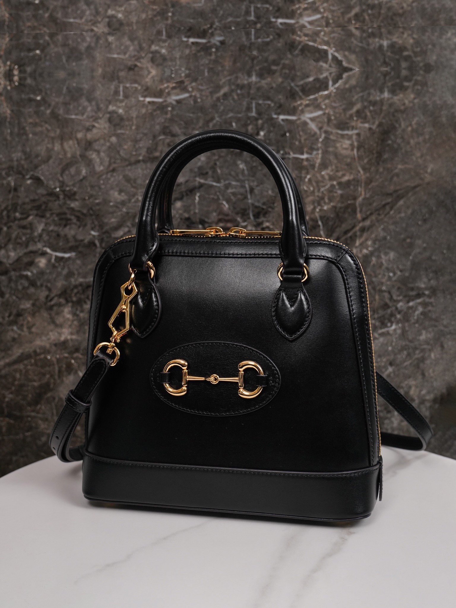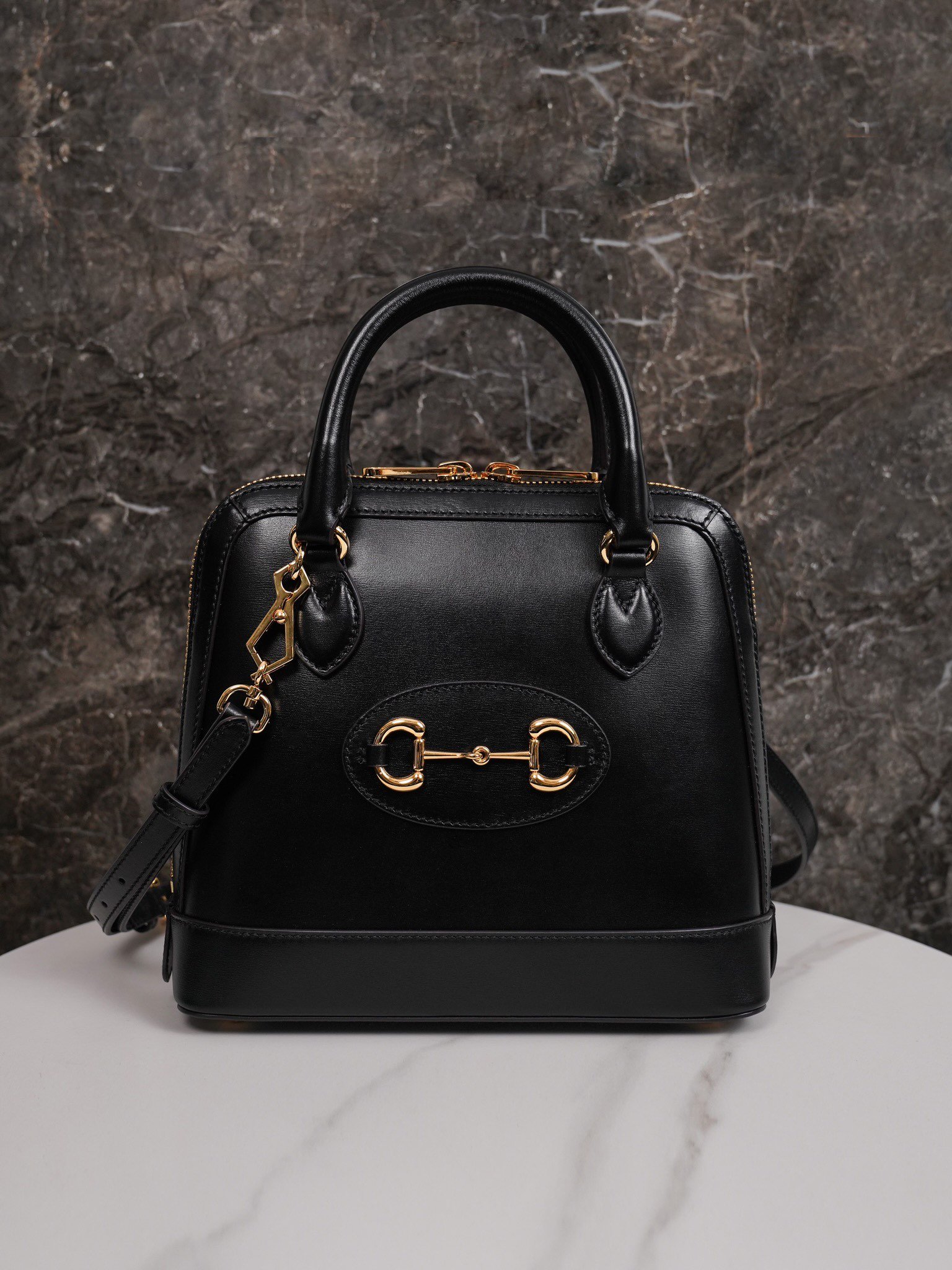 2020 Spring/Summer Collection introduces the new Horsebit Buckle 1955 Series Shell Bag model, this handbag is made of black leather, with chic dome shape, optional leather shoulder strap for handbag to create a richer carrying options.