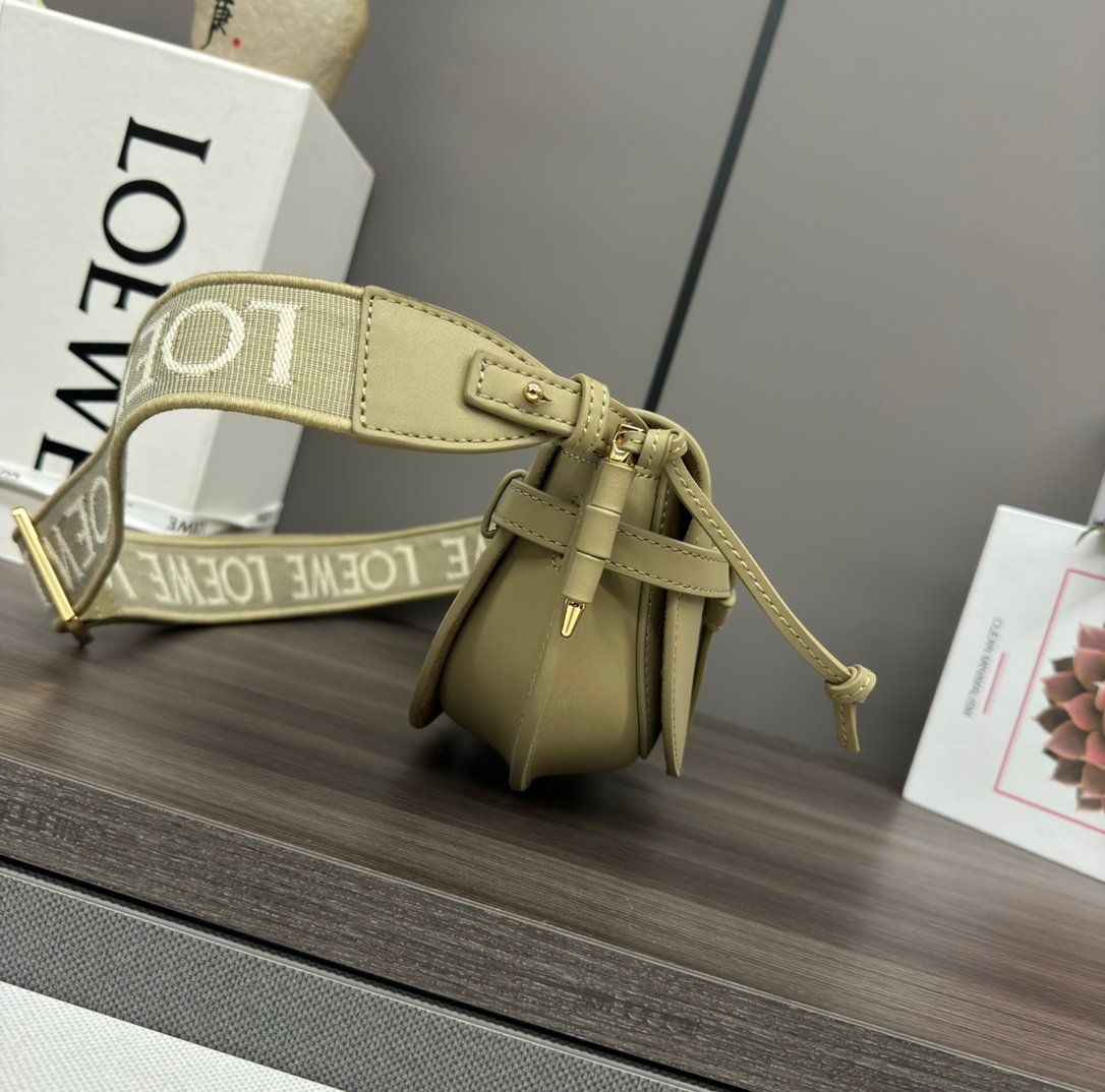 L⊚℮w℮🌟 Gate Dual 🆕New Colors🆕 The nminiGateDual handbag is crafted from supple, natural cowhide leather and showcases Loewe’s unique leather craftsmanship, featuring saddle-stitched, knotted leather straps and a side locking metal Pinned, this mini version has a removable cowhide and jacquard shoulder strap! The front flap pull tab sits below the knotted leather strap for secure fastening, with a bonded gold-tone suede lining and two interior slit pocket compartments. Removable shoulder strap*Shoulder, crossbody, chest hanging*🌟Embossed with Anagram pattern in the same color scheme💋nModel No.: 61824nSize: 15*9.5*12.5 (21cm at widest point at the middle)n