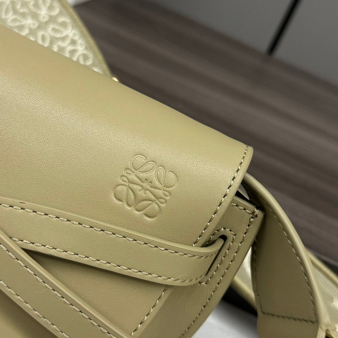 miniGateDual handbag is crafted from supple, natural cowhide leather and showcases Loewe’s unique leather craftsmanship, featuring saddle-stitched, knotted leather straps and a side locking metal Pinned, this mini version has a removable cowhide and jacquard shoulder strap! The front flap pull tab sits below the knotted leather strap for secure fastening, with a bonded gold-tone suede lining and two interior slit pocket compartments. Removable shoulder strap*Shoulder, crossbody, chest hanging*🌟Embossed with Anagram pattern in the same color scheme💋