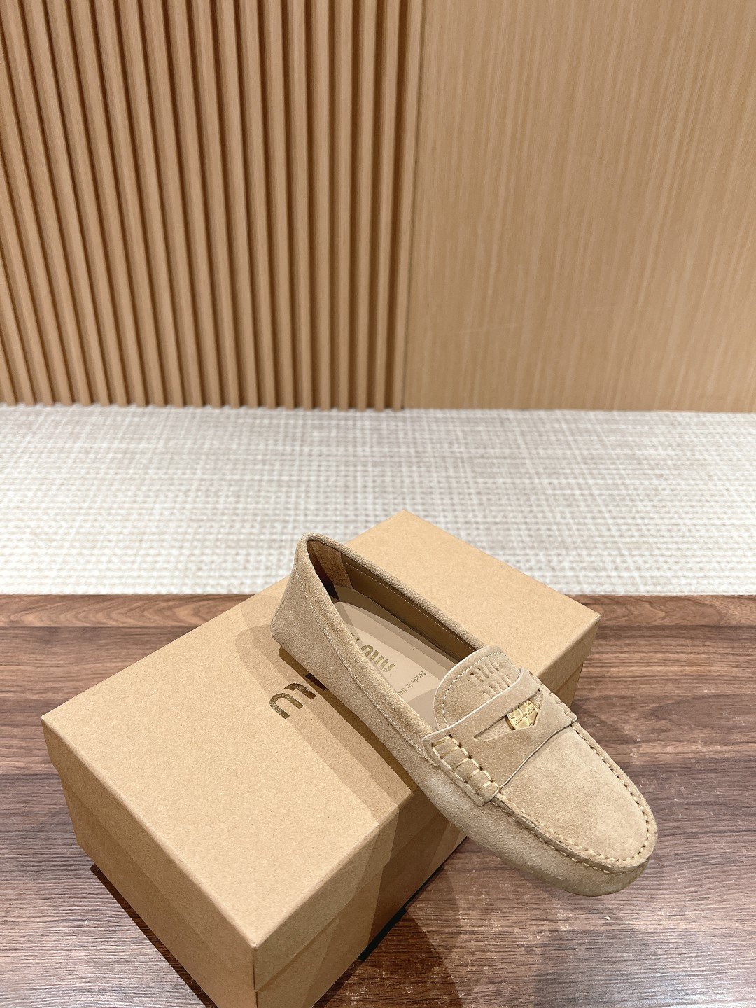 MiuMiu 缪缪春夏新款招财硬币乐福鞋五角星豆豆鞋强烈推荐懒人鞋女孩子们那些可可爱爱的小细节算是让miu一整个拿捏住了乐福鞋这几年风刮得很大审美疲劳新出的小钱币真的让人一整个心都融化了除了中间夹着一颗铜币这种戳人细节之外鞋型整体都狠秀气慵懒随性 上脚特舒服进口细腻牛反绒材质 牛皮内里 Size定做不退换