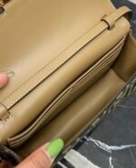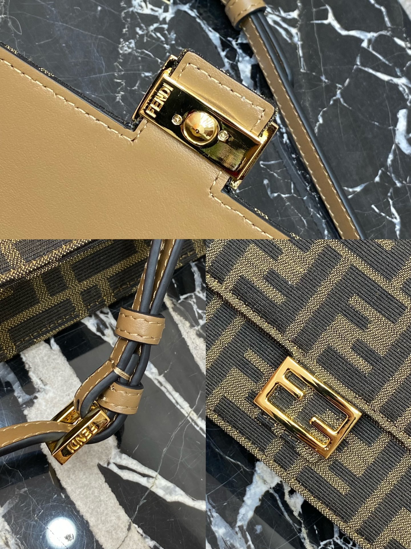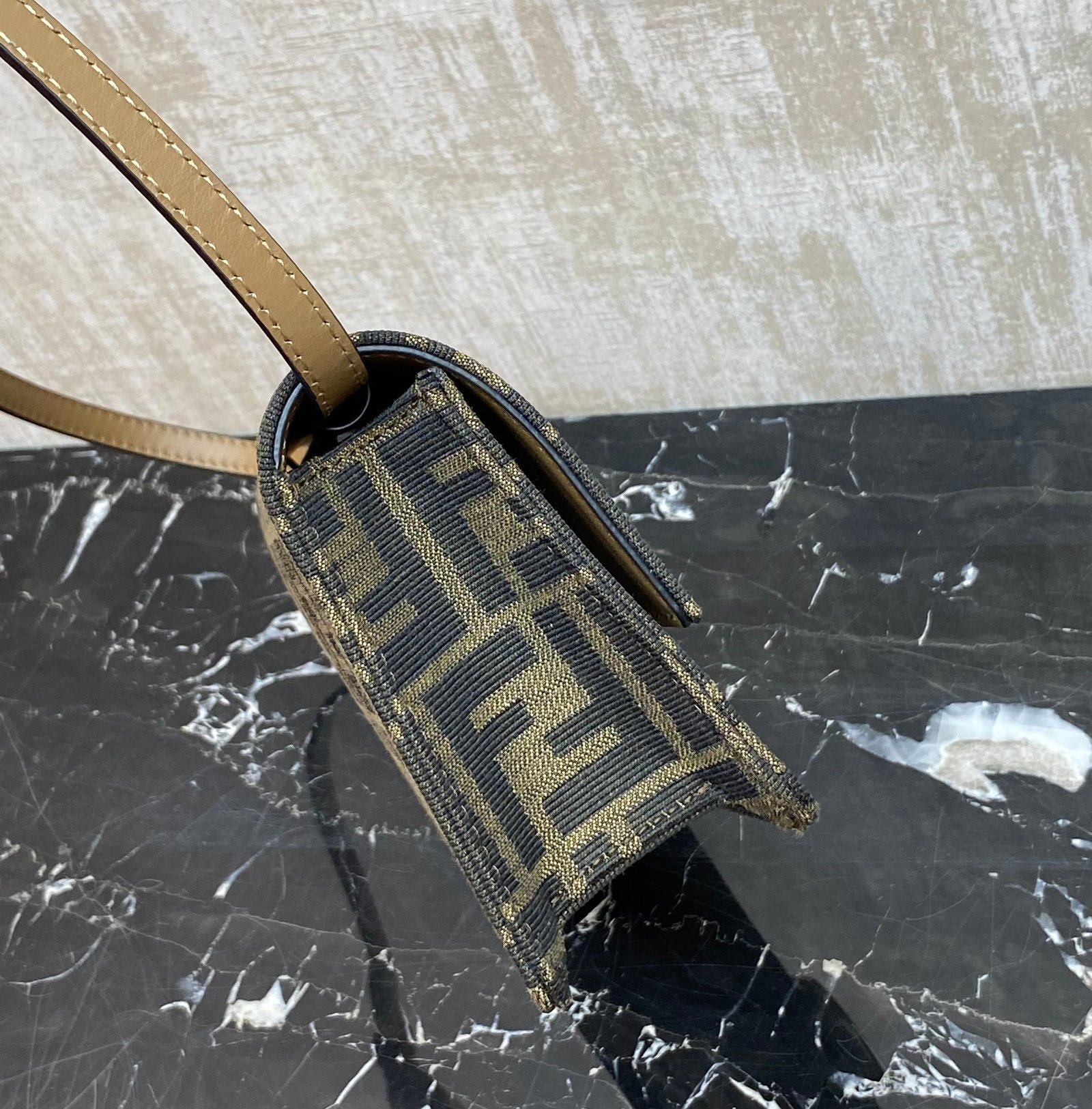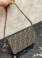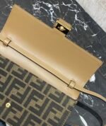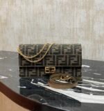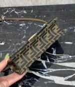 Compact Baguette wallet with flap and FF clasp. Interior compartment with six card slots. Dual shoulder straps with one adjustable leather shoulder strap and one removable chain shoulder strap: hand-carry, underarm carry or crossbody. Made of brown FF jacquard fabric material, lined with imported Spanish calf leather, gold finish metal parts.