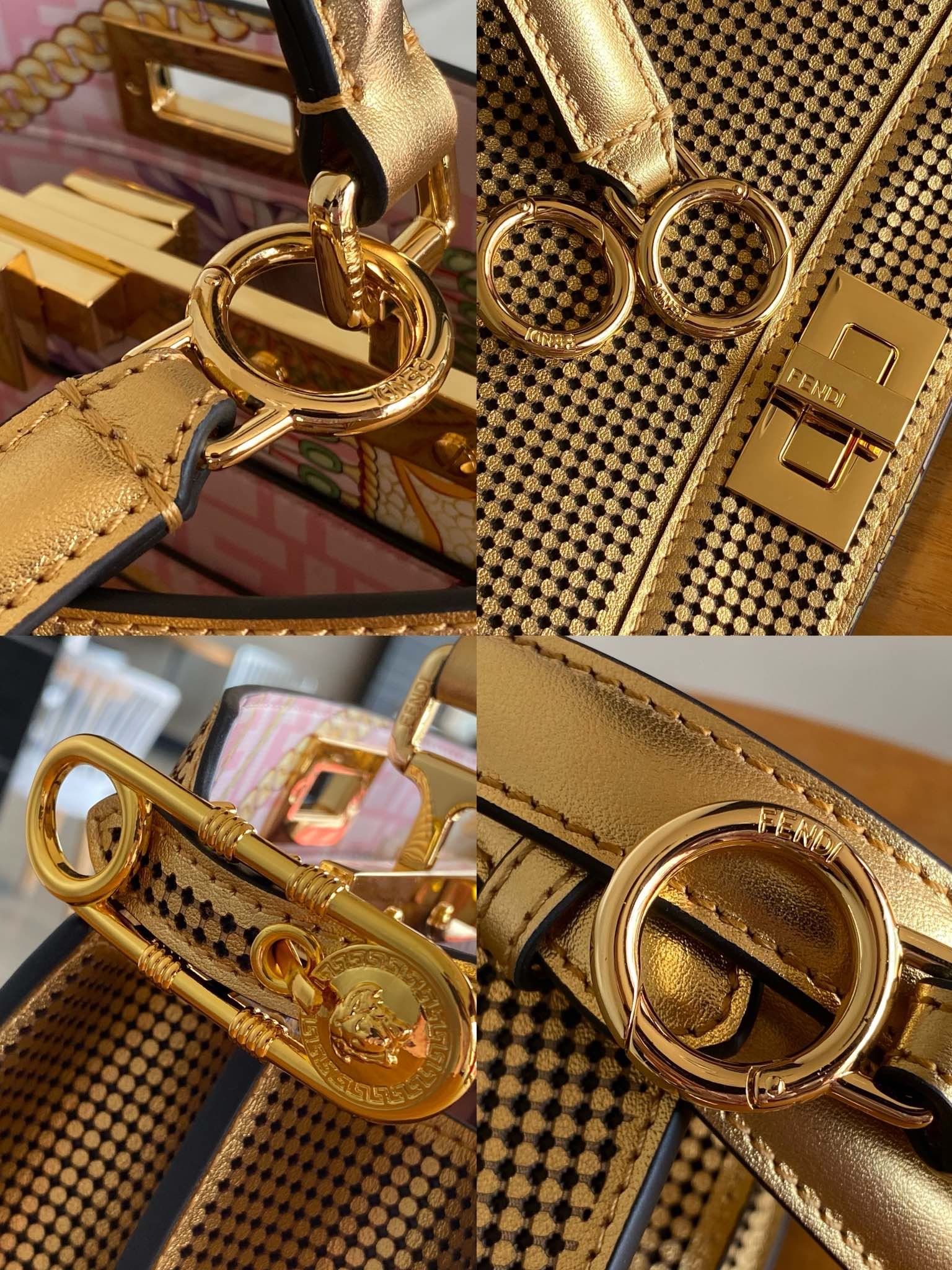 pattern combines the iconic FendiFF logo with the Versace baroque gold and silver print. The sides are adorned with signature twist locks. The
