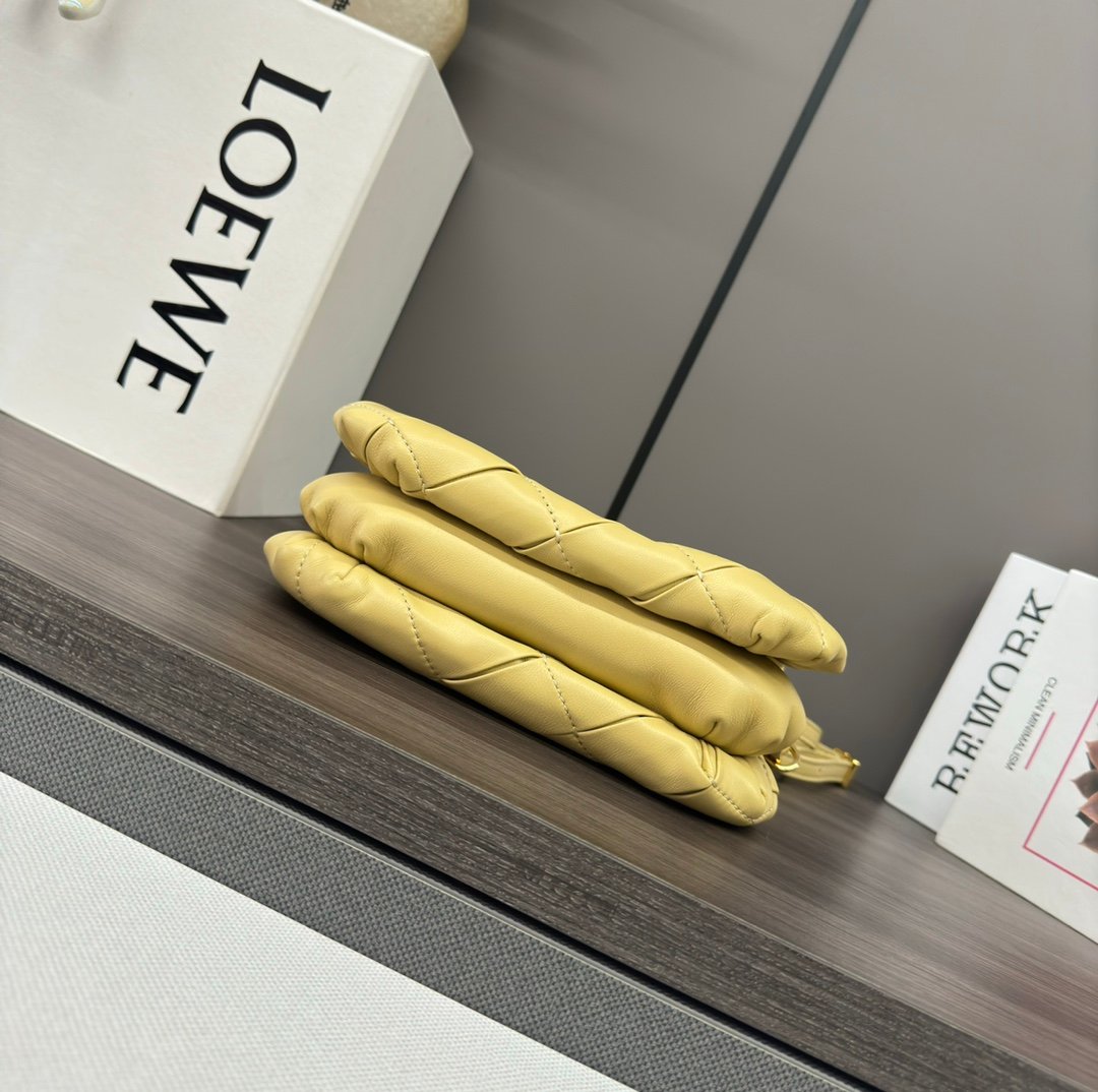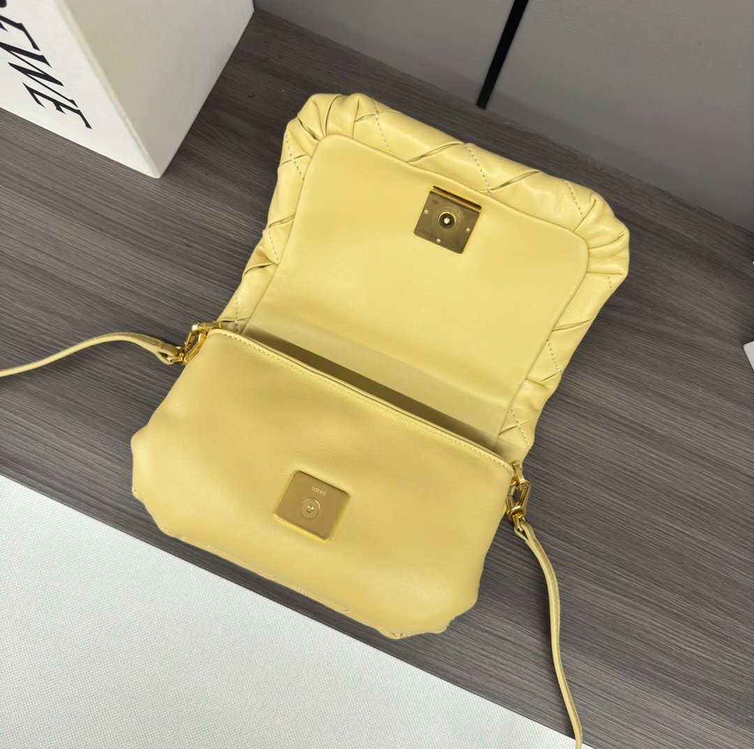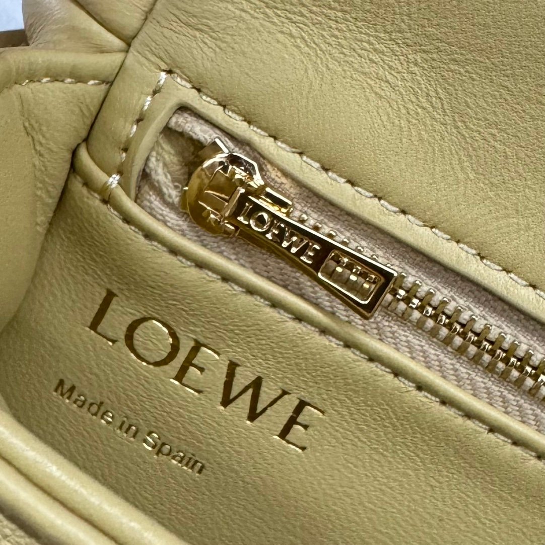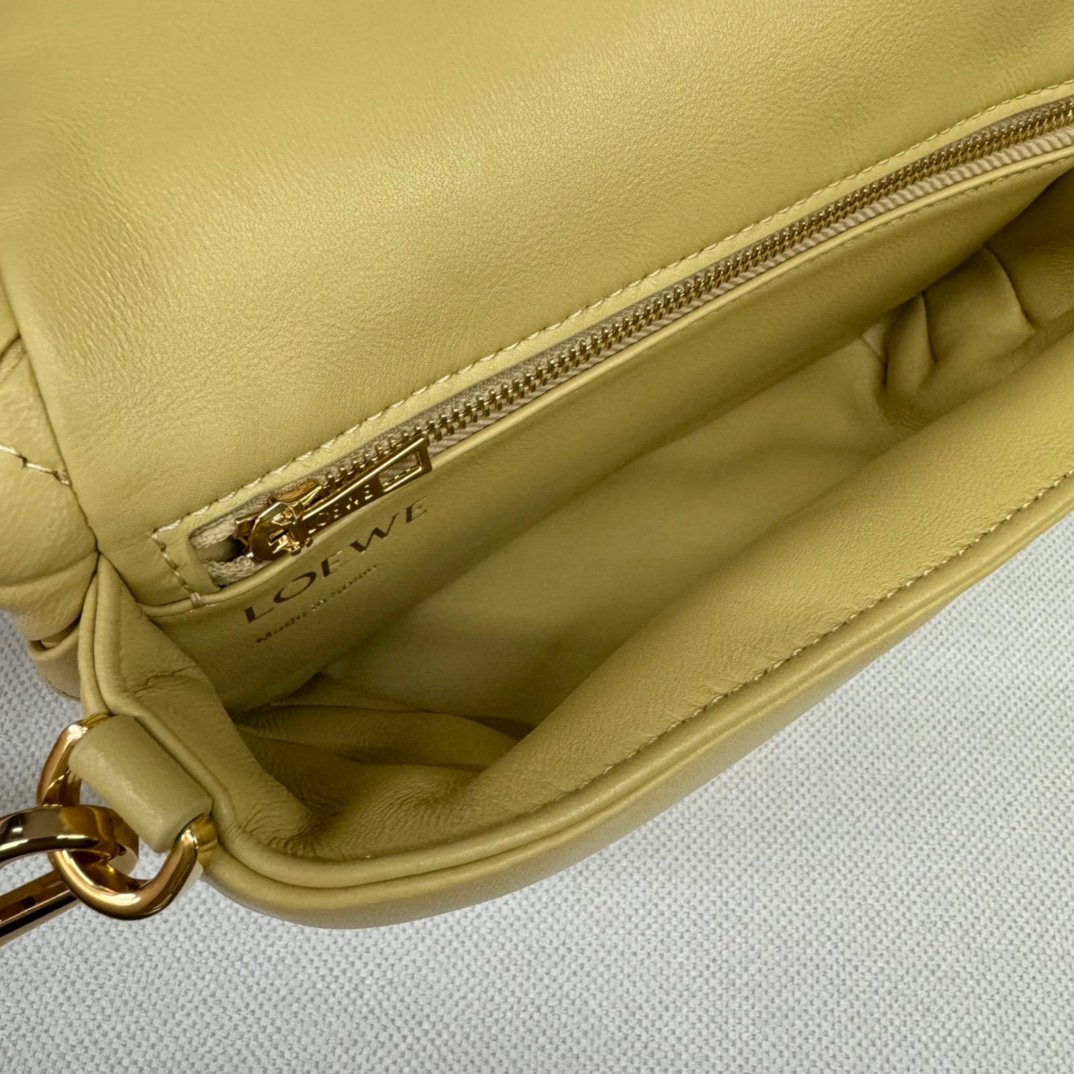 LO℮w℮🌟 Repeat Pleated Shiny Napa Sheep Leather Puffer Goya Handbag Inspired by the Goya aesthetic, the Puffer Goya Handbag brings a new sensory and tactile dimension through the shiny napa sheep leather with goose feather padding. Fitted with a detachable and adjustable metal donut chain and a detachable leather strap. This mini version is made from pleated sheep leather that has been cut, sewn and hand woven. Carry it on your shoulder or in your hand*Magnetic closure*This bag comes with a detachable chain and a leather strapOne main compartment, one zipper pocket and one slit pocket *Nappa sheepskin leather lining