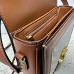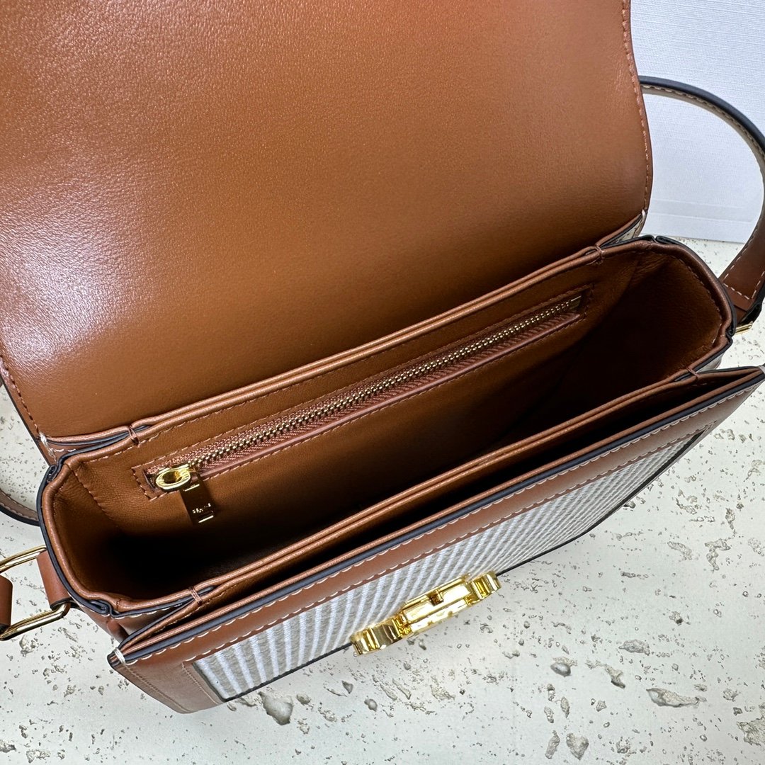 TEEN TRIOMPHE Striped Fabric with Calfskin Leather HandbagnThis TRIOMPHE small handbag made of satin calf leather features an adjustable leather shoulder strap and an exclusive TRIOMPHE bucklenTRIOMPHE Brass Locking Clasp nInterior Zipper Pocket and Inside Flat PocketnAdjustable Leather Shoulder Strap Length 17 inches (42 cm)n7 X 6 X 2 inches (18.5 X 14 X 6 cm) n No. 188423