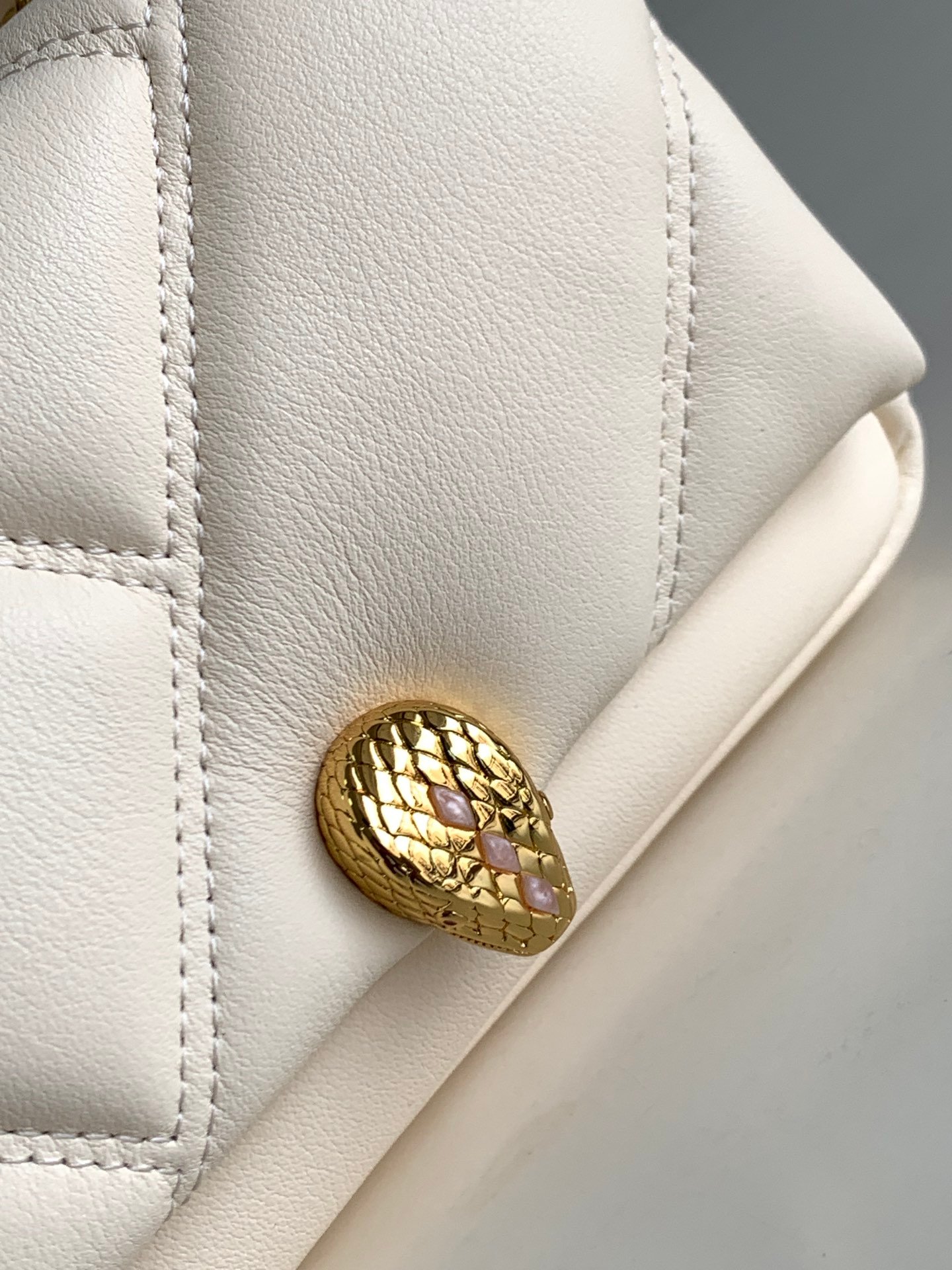🔹 The center is decorated with small pink mother-of-pearl snake A classic BVLGARI chain adorns the flap like a necklace