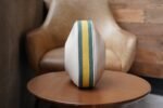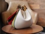 Refreshingly reinterpreted, this accessory is a nod to the timeless glamour of Hollywood. This accessory features a recognizable crescent moon shape and a G-hook closure for a unique design aesthetic. The combination of classic accessories and soft materials is a beautifully romantic take on vintage glamor. This small shoulder bag is made of white leather with green and yellow webbing piping.