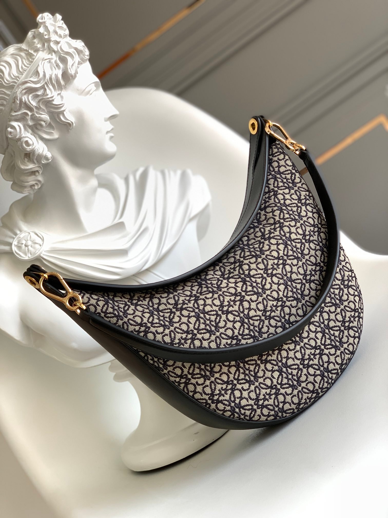 Home BAGS LOEWE The 🌟2022ss Loewe Luna 🌟 Half Moon Hobo bag is designed with soft lines, a sculpted silhouette and curved lip closure, hidden sliding eyelets, and a detachable shoulder strap for versatility. This version is made from Anagram jacquard and classic cowhide leather. Shoulder strap* Detachable shoulder strap* One internal slit pocket* Herringbone cotton canvas lining* Metal embossing LOEWE Made in Spain🌟nsize : 34*9*30cmnModel No. : 012205 n
