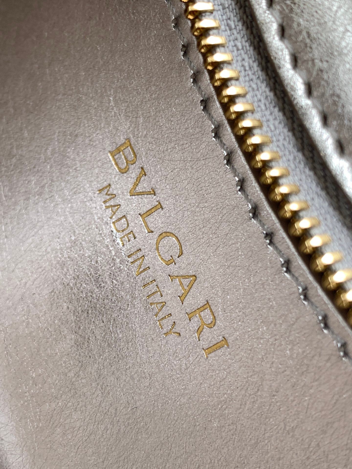 🔹 features a single compartment with top zipper closure, an interior open flat pocket, and BULGARI metal logo on the back