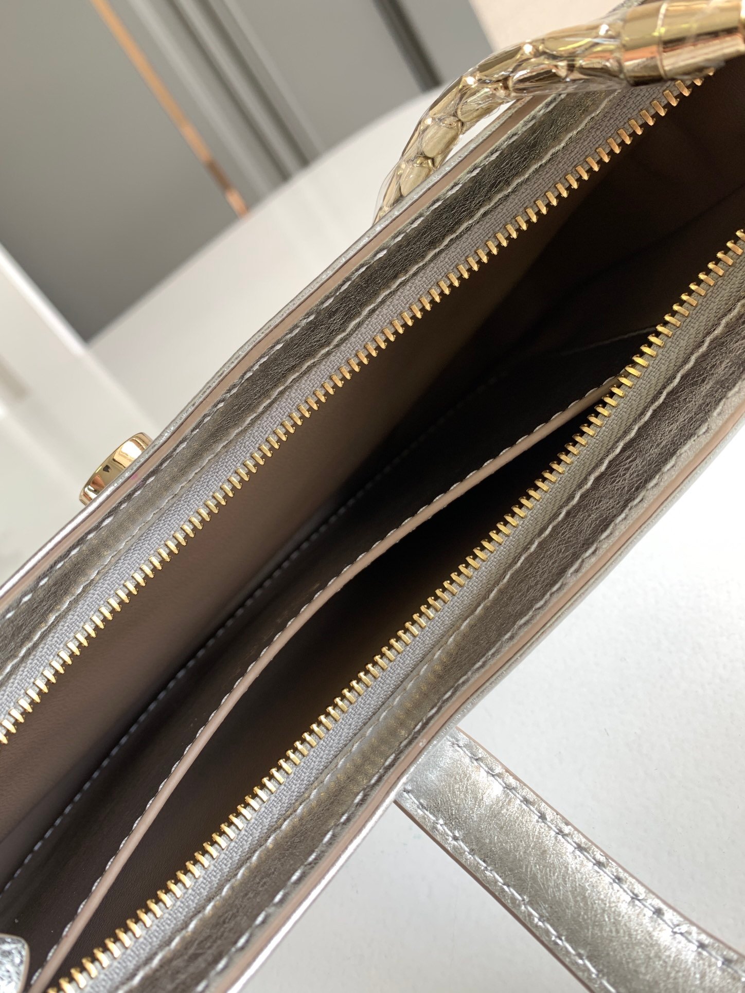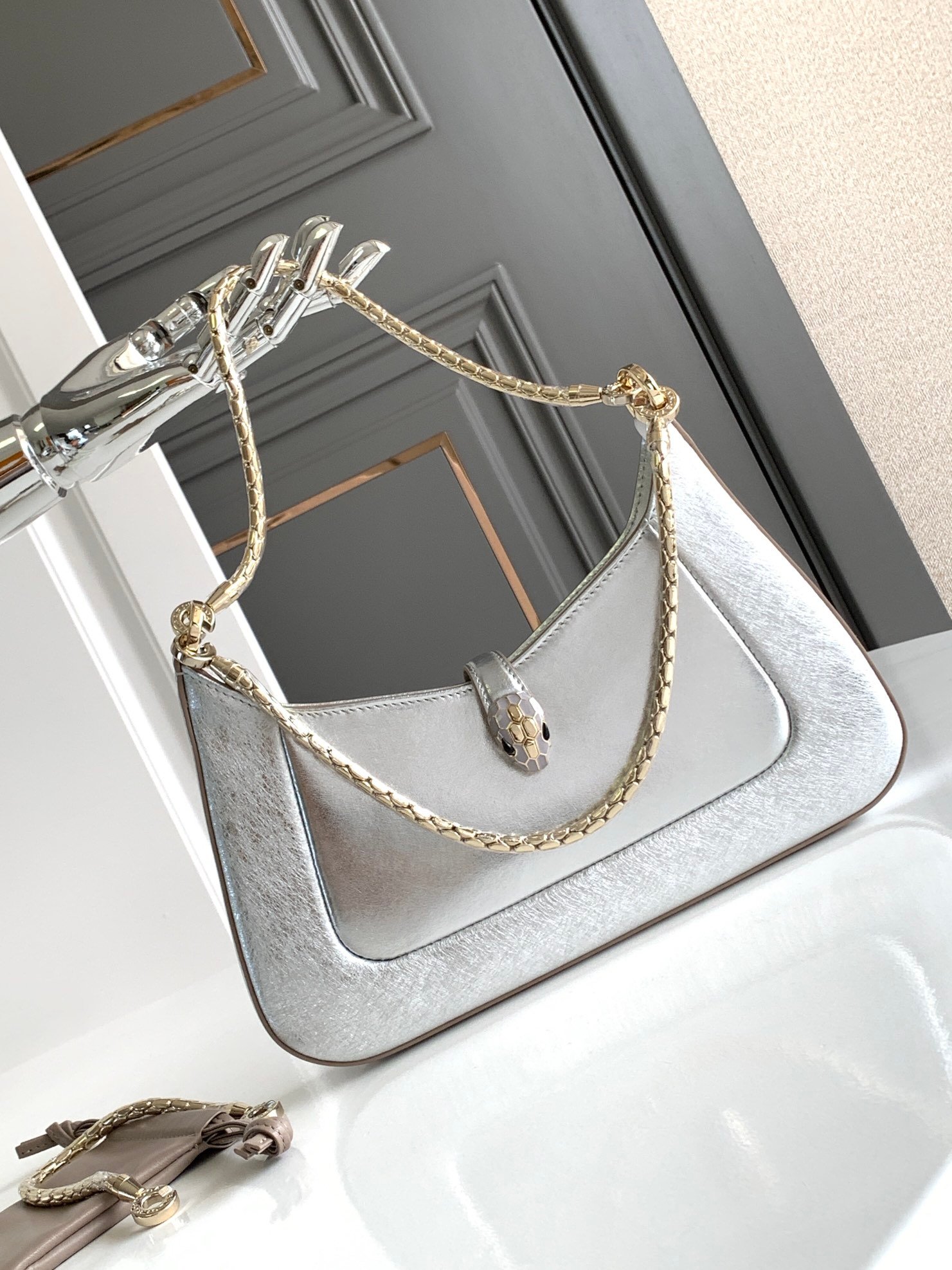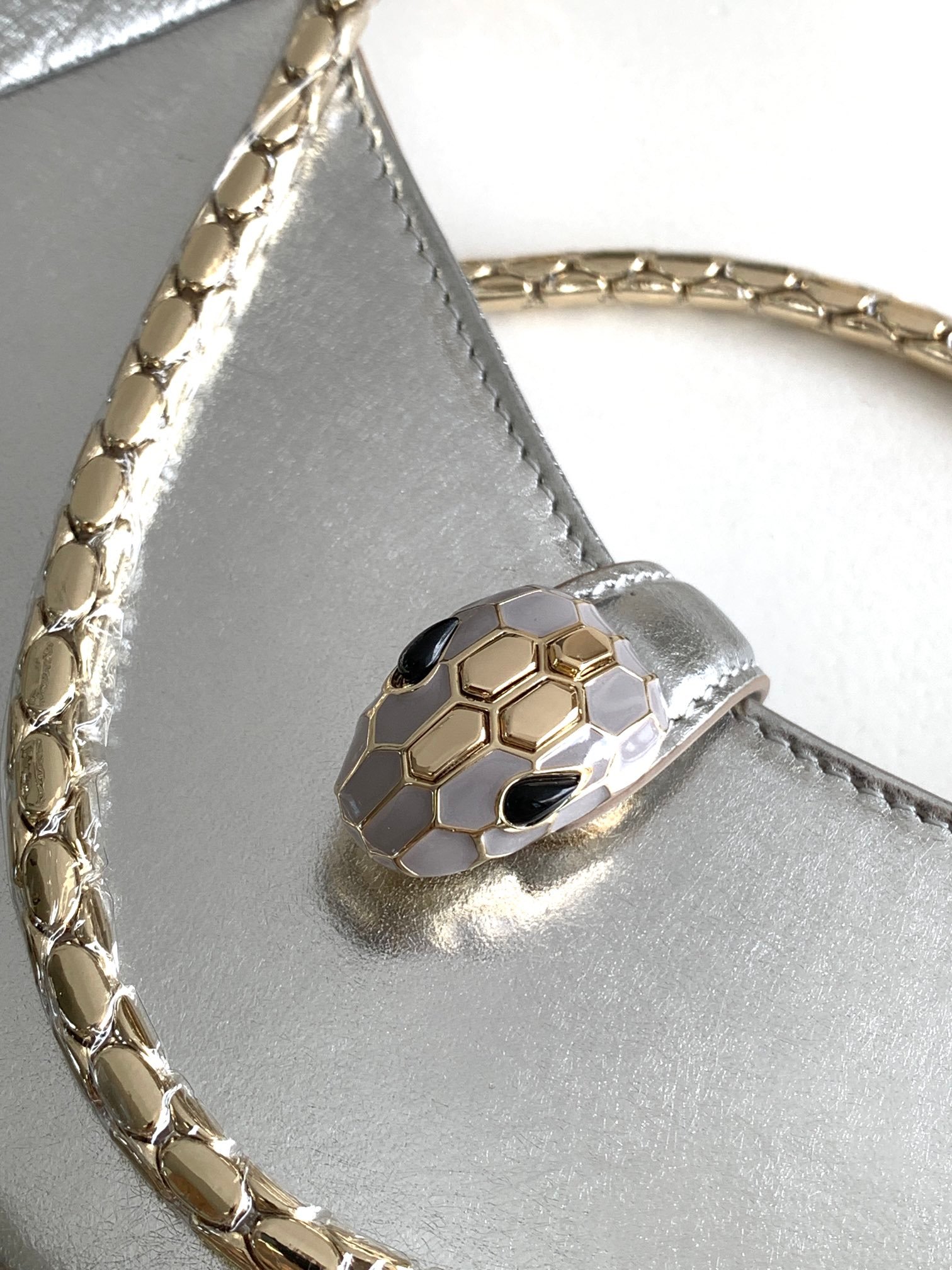 Chip models nBVLGA **🤍 "Serpenti Forever"n🔹 made of silver textured calfskin, highlighting the metallic texture and exquisite grain, reminiscent of the beautiful inclusions of raw diamonds, generous, elegant and intellectual, Versatile Department ✨ 🔸 with light gold-plated brass accessories n new upgraded version of the snake head enamel buckle 🐍 n gray gold enamel and black onyx double eyes 👀 n lines smooth visual clarity 🌱 n will be the classic 🐍 head buckle embellishment embellished seductive Charming n🔺Featuring a single compartment, a mirror pouch with personalized vanity mirror and BULGARI metal logo on the back nwith an upgraded gift box 🎁nSize:20*14*4.5Cm618790001n