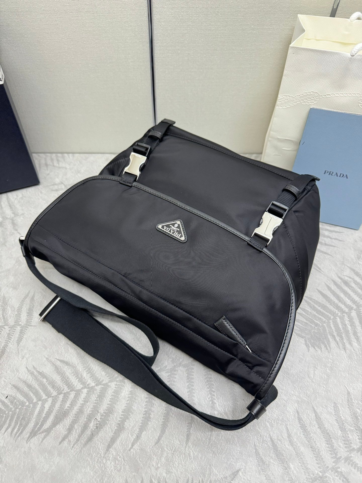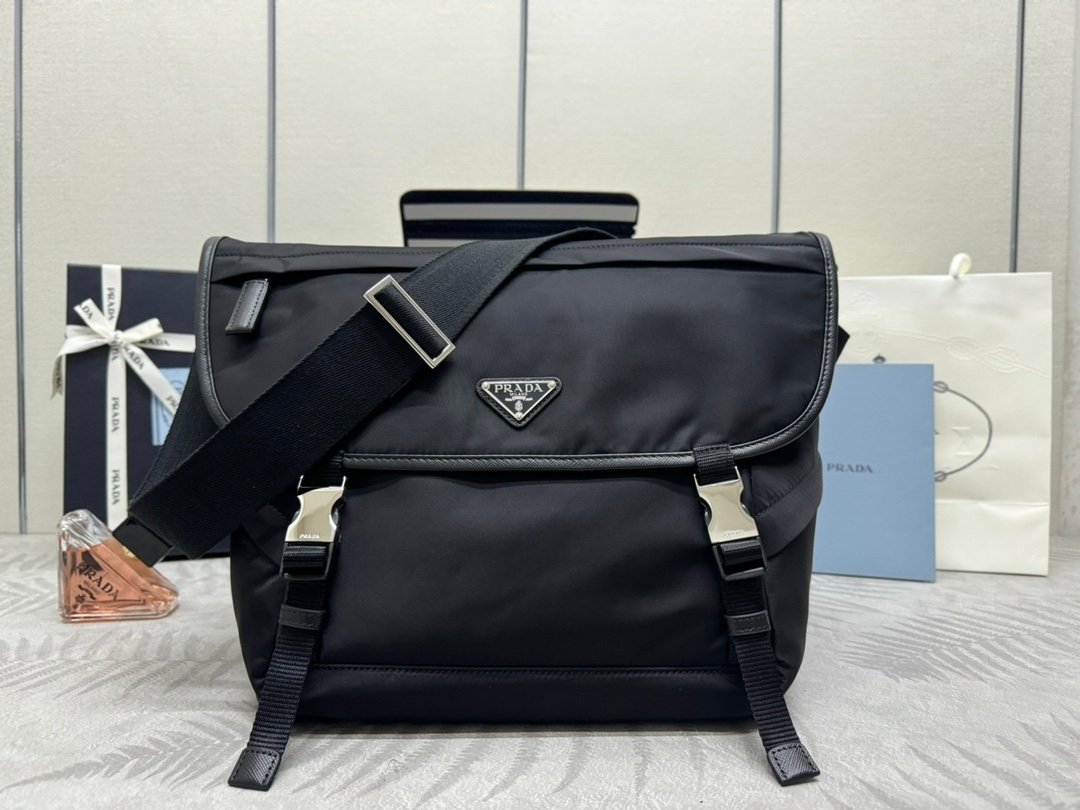 This new large messenger bag (2VD052A upgraded) is designed from recycled nylon yarn Re-Nylon with flap and snap closure, three exterior zippered pockets, interior zippered pocket and patch pocket. Large capacity space, adjustable woven trimmed shoulder strap, large capacity space. Another classic pop-up one, hurry up and get your hands on it